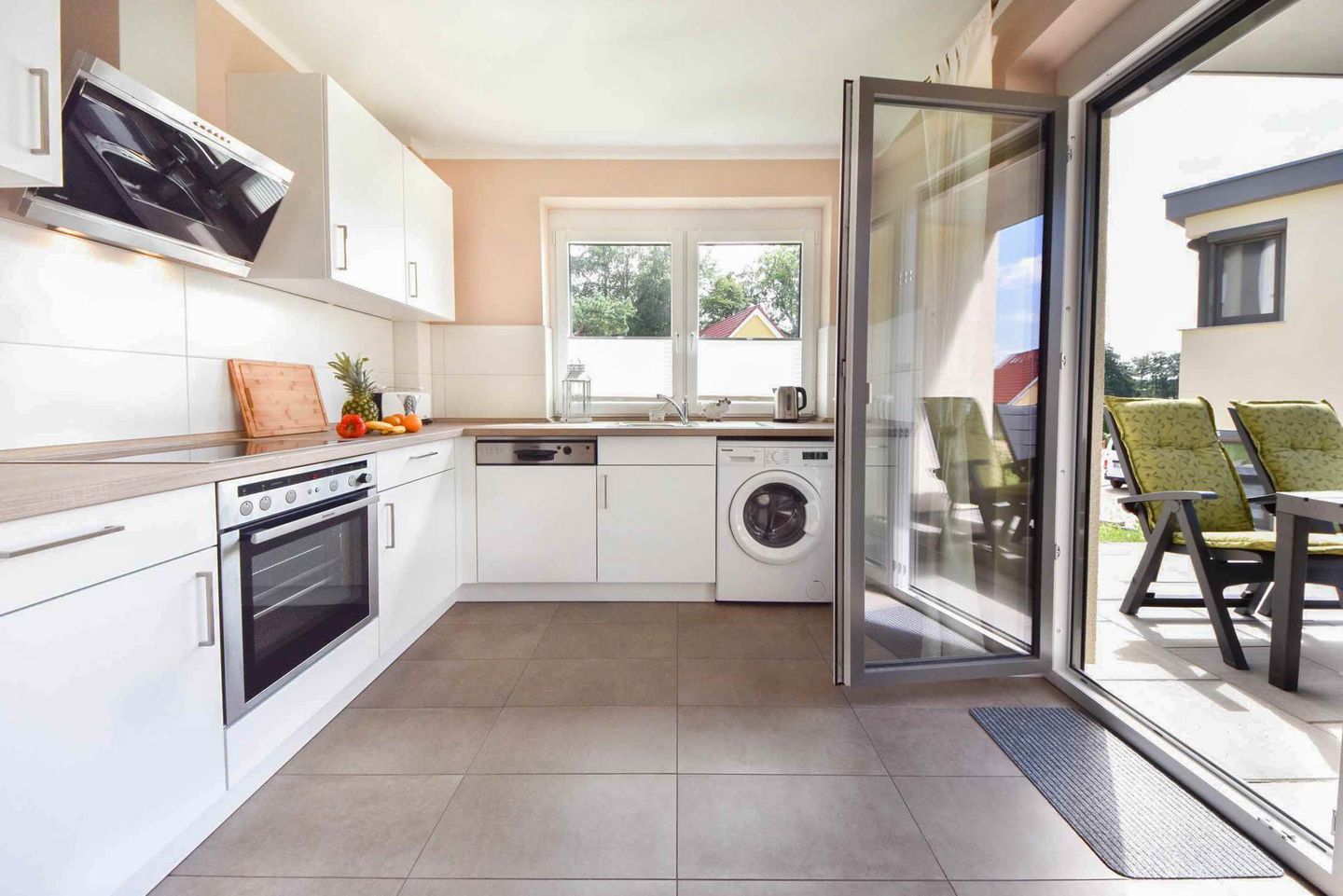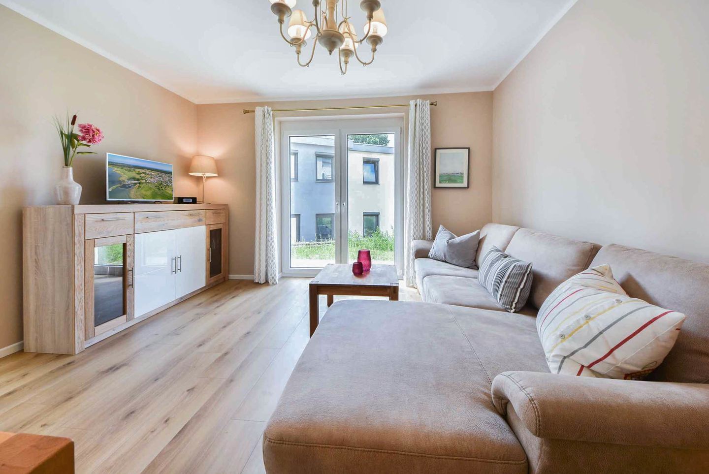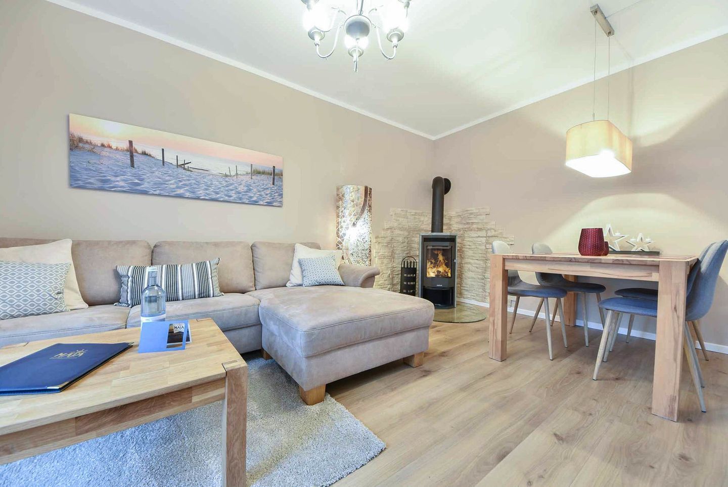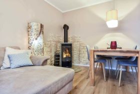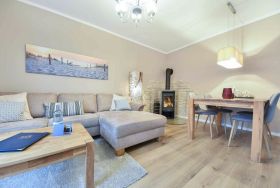 Verbringen Sie Ihren nächsten Urlaub in der idyllischen Waldrandlage von Korswandt auf der wunderschönen Insel Usedom, wo die Ferienwohnung Sonnenpark 01 auf Sie wartet. Diese 73 Quadratmeter große Erdgeschosswohnung bietet Ihnen ein Zuhause fernab des Alltagsstresses. Der offene Wohnbereich, der die modern ausgestattete Küche mit dem gemütlichen Wohnzimmer verbindet, lädt zum Verweilen ein. Hier finden Sie alle Annehmlichkeiten, die Sie für einen komfortablen Aufenthalt benötigen: ein Ceranfeld, einen Backofen, eine Spülmaschine, eine Mikrowelle sowie einen Kühlschrank mit Gefrierfach. Eine separate Sitzecke bietet den idealen Ort für ein entspanntes Frühstück, während der Kaminofen im Wohnzimmer für wohlige Wärme und eine behagliche Atmosphäre sorgt. Vom stilvoll eingerichteten Wohnzimmer aus gelangen Sie direkt auf die großzügige Terrasse mit zwei Zugängen, wo Sie die frische Waldluft und die Ruhe der Umgebung genießen können.