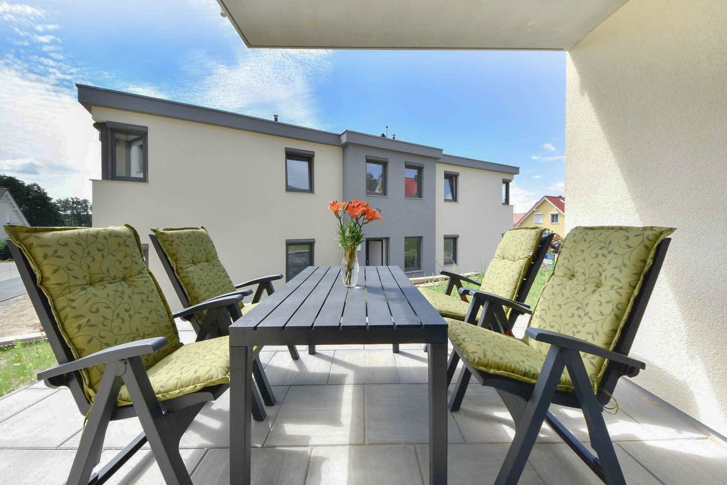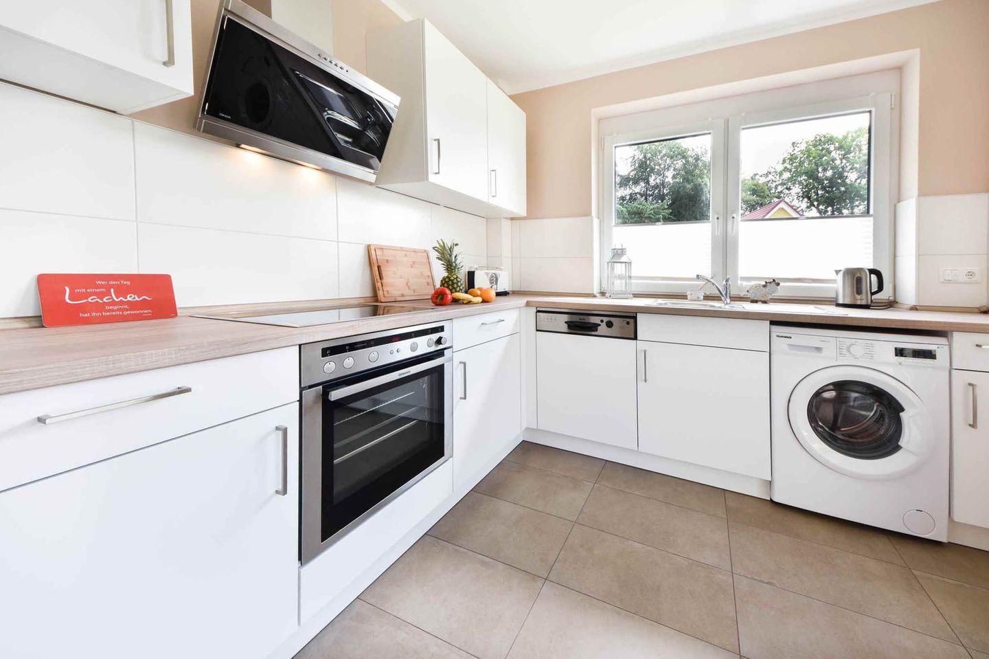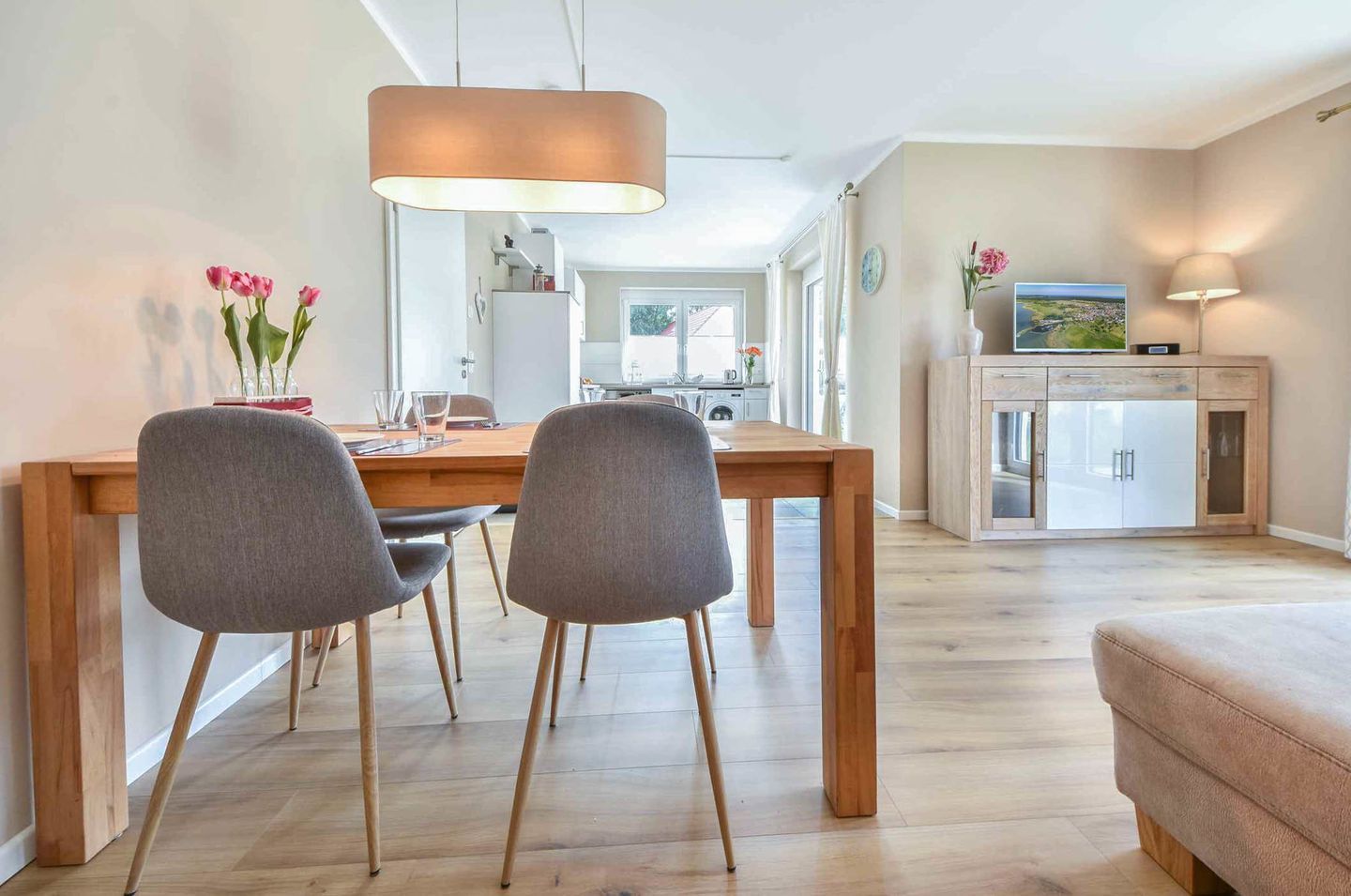 Verbringen Sie Ihren nächsten Urlaub in der idyllischen Waldrandlage von Korswandt auf der wunderschönen Insel Usedom, wo die Ferienwohnung Sonnenpark 01 auf Sie wartet. Diese 73 Quadratmeter große Erdgeschosswohnung bietet Ihnen ein Zuhause fernab des Alltagsstresses. Der offene Wohnbereich, der die modern ausgestattete Küche mit dem gemütlichen Wohnzimmer verbindet, lädt zum Verweilen ein. Hier finden Sie alle Annehmlichkeiten, die Sie für einen komfortablen Aufenthalt benötigen: ein Ceranfeld, einen Backofen, eine Spülmaschine, eine Mikrowelle sowie einen Kühlschrank mit Gefrierfach. Eine separate Sitzecke bietet den idealen Ort für ein entspanntes Frühstück, während der Kaminofen im Wohnzimmer für wohlige Wärme und eine behagliche Atmosphäre sorgt. Vom stilvoll eingerichteten Wohnzimmer aus gelangen Sie direkt auf die großzügige Terrasse mit zwei Zugängen, wo Sie die frische Waldluft und die Ruhe der Umgebung genießen können.