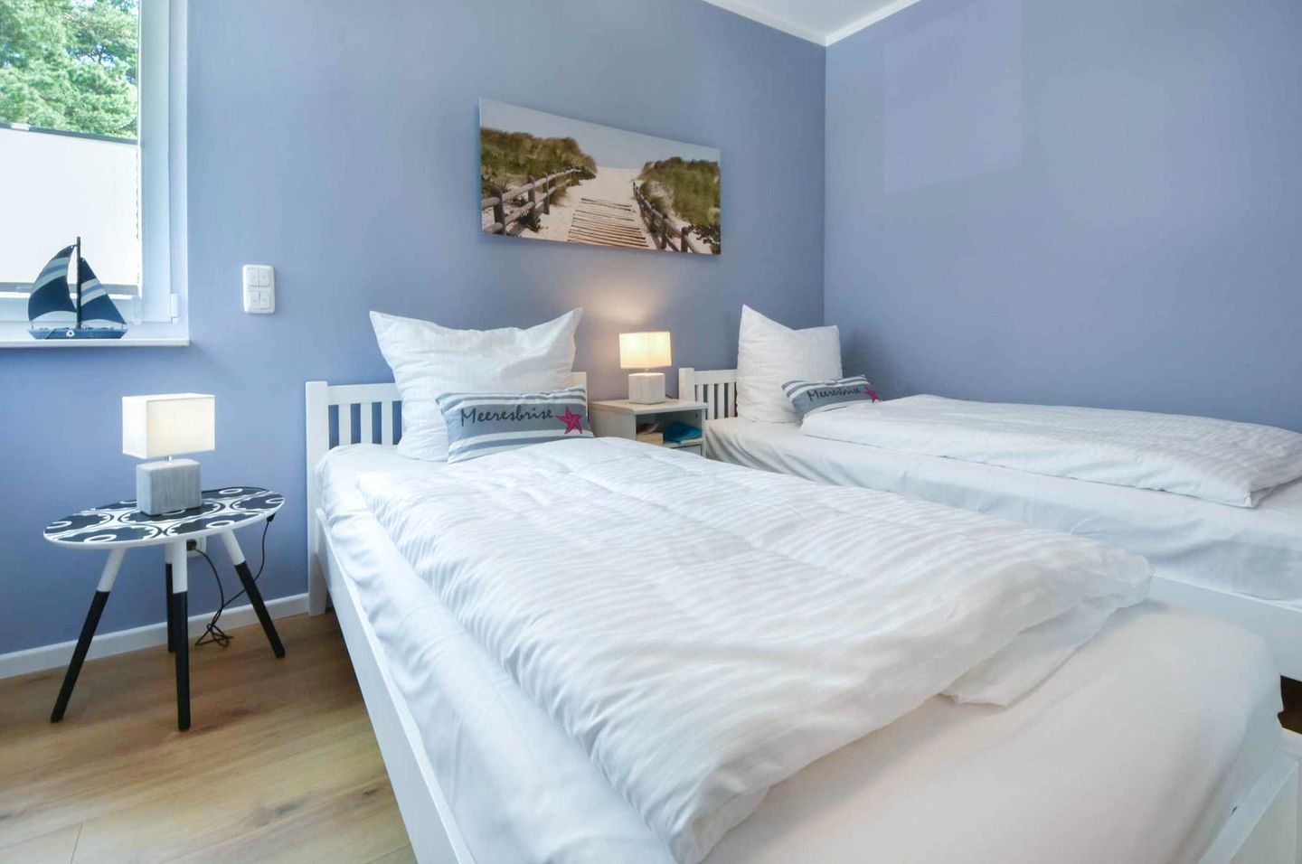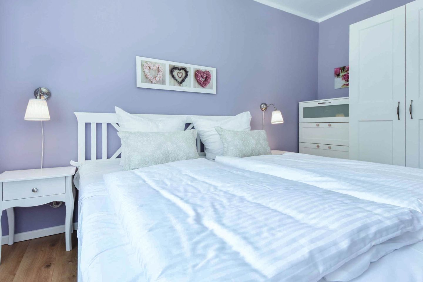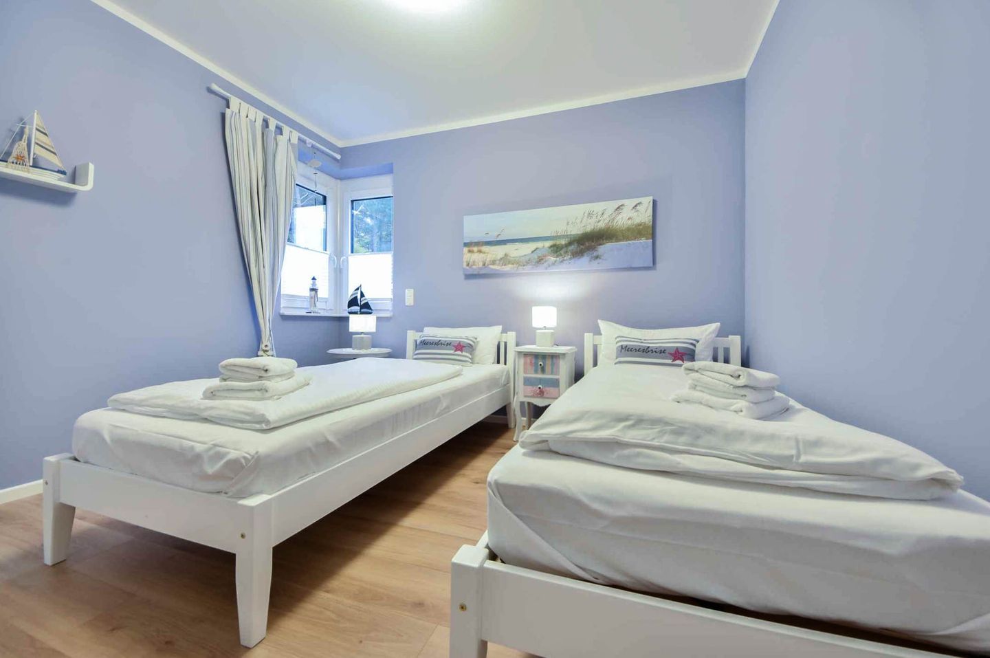 Die Ferienwohnung verfügt über zwei Schlafzimmer, die Ihnen erholsame Nächte versprechen. Das Hauptschlafzimmer ist mit einem großen Doppelbett, verstellbaren Lattenrosten und Verdunklungsmöglichkeiten ausgestattet, um Ihnen optimalen Schlafkomfort zu bieten. Ein zweiter Fernseher im Schlafzimmer sorgt für zusätzliche Unterhaltung. Das zweite Schlafzimmer ist mit zwei Einzelbetten eingerichtet und bietet ebenfalls Verdunklungsmöglichkeiten. Das helle Badezimmer mit bodentiefer Dusche rundet das Angebot ab und sorgt für einen angenehmen Start in den Tag.
