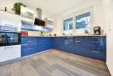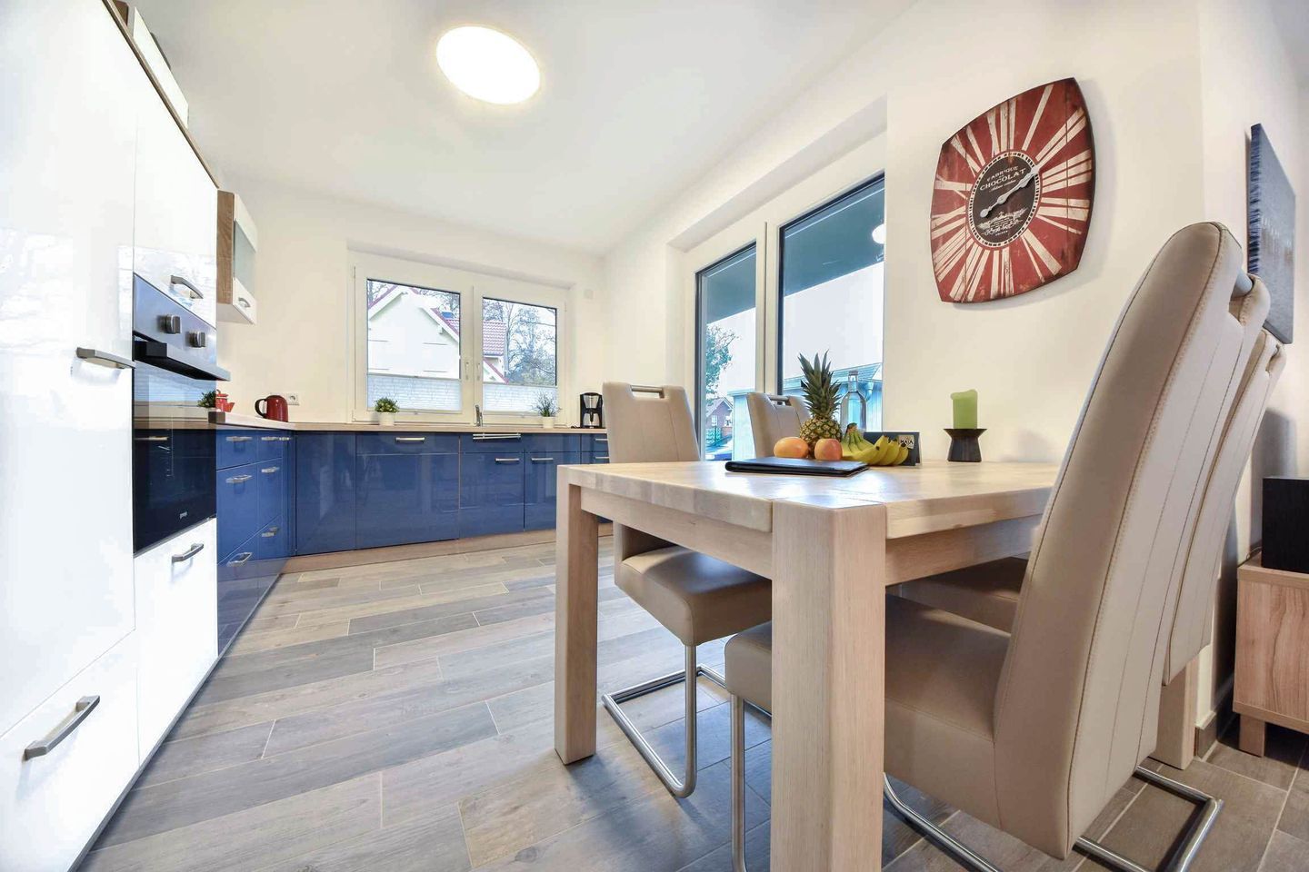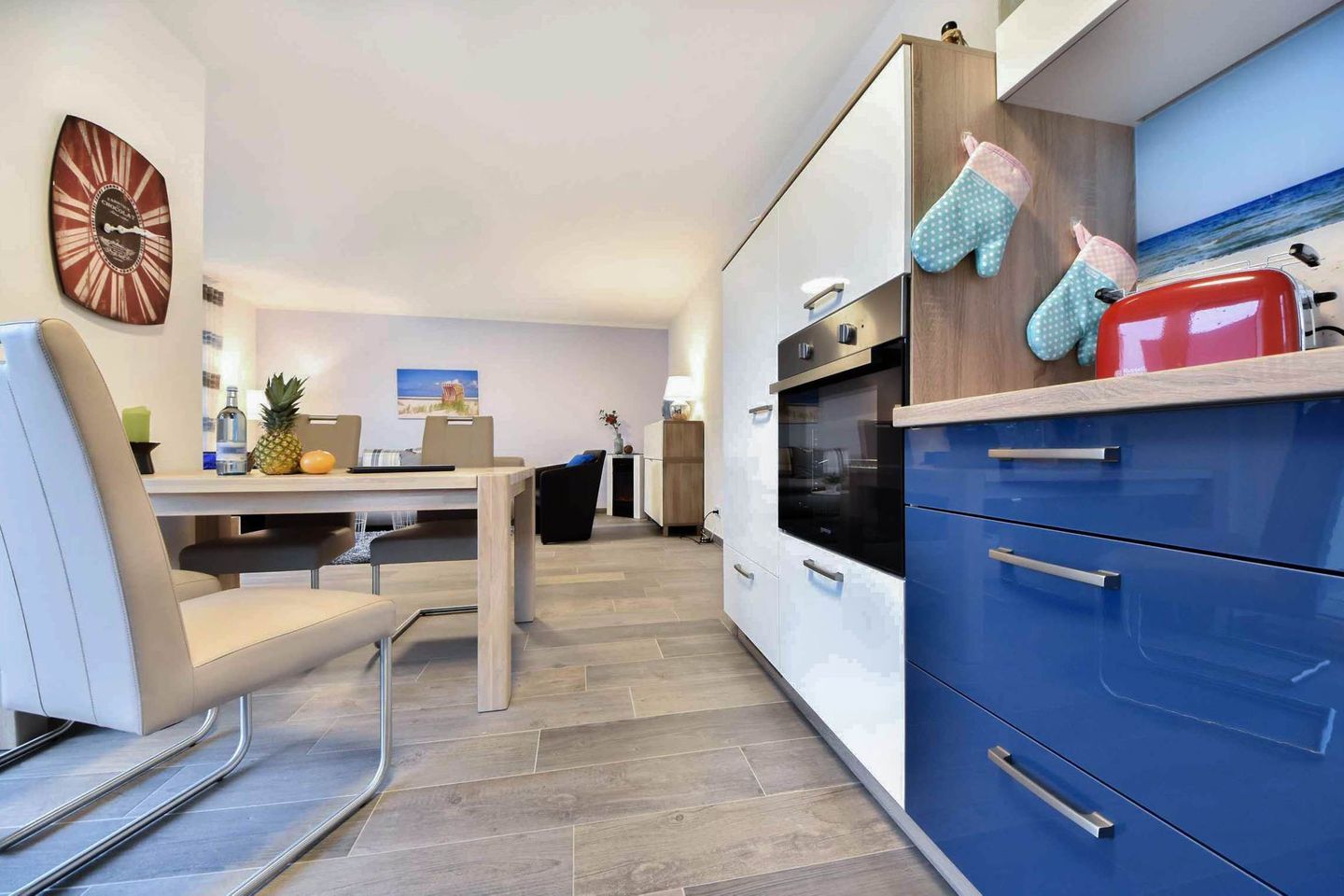 Der offene Wohnbereich verbindet stilvolles Design mit Funktionalität und bietet alles, was für einen erholsamen Urlaub benötigt wird. Eine gemütliche Couch und zwei komfortable Sessel laden zum Entspannen ein, während der Elektro-Kamin an kühleren Tagen für eine angenehme Atmosphäre sorgt. Das große TV-Gerät bietet Unterhaltung für entspannte Abende. Die moderne Küche ist mit einem Cerankochfeld, einem Backofen in Arbeitshöhe, einer Spülmaschine und einem Kühlschrank mit Gefriereinheit ausgestattet. Ein separater Esstisch bietet ausreichend Platz für gemeinsame Mahlzeiten und gesellige Abende. Auf der Schlafcouch kann eine fünfte Person bequem übernachten.