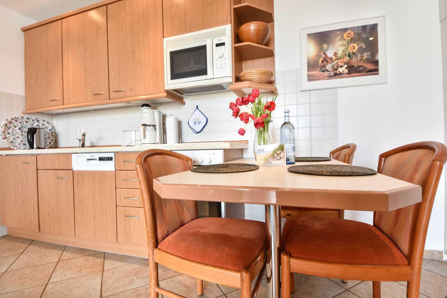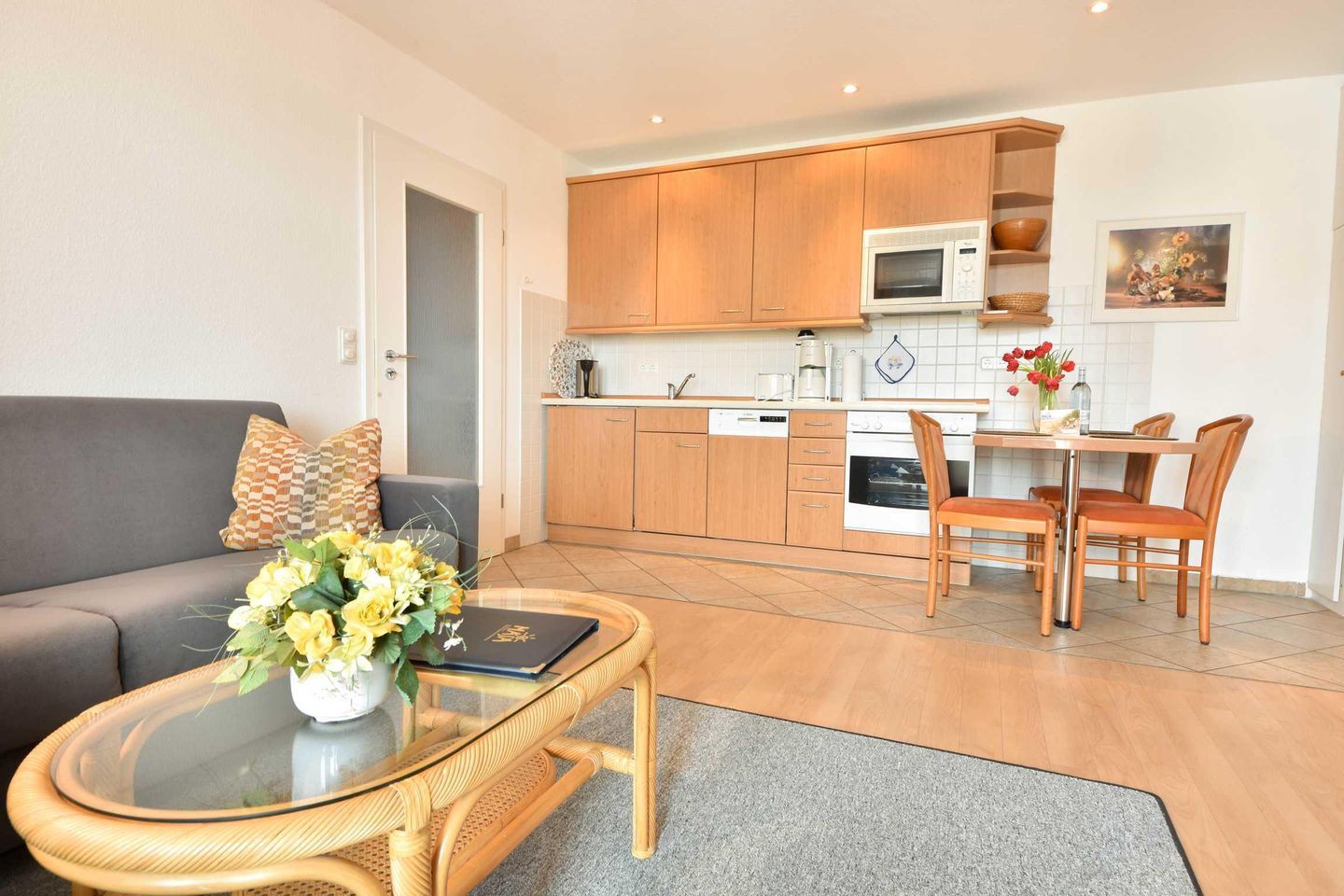 Die offene Küche ist mit allen wichtigen Geräten ausgestattet, darunter Ceran-Kochfeld, Backofen, Mikrowelle, Geschirrspüler sowie ein Kühlschrank mit Gefrierfach. Ein separater Essbereich schafft Raum für gemeinsame Mahlzeiten oder Spieleabende. Der gemütliche Wohnbereich punktet mit einer komfortablen Schlafcouch, die sich für eine weitere Person eignet, einem TV-Gerät, einem DVD-Player sowie einer Mini-Musikanlage – ideal für entspannte Stunden nach einem Tag am Strand.