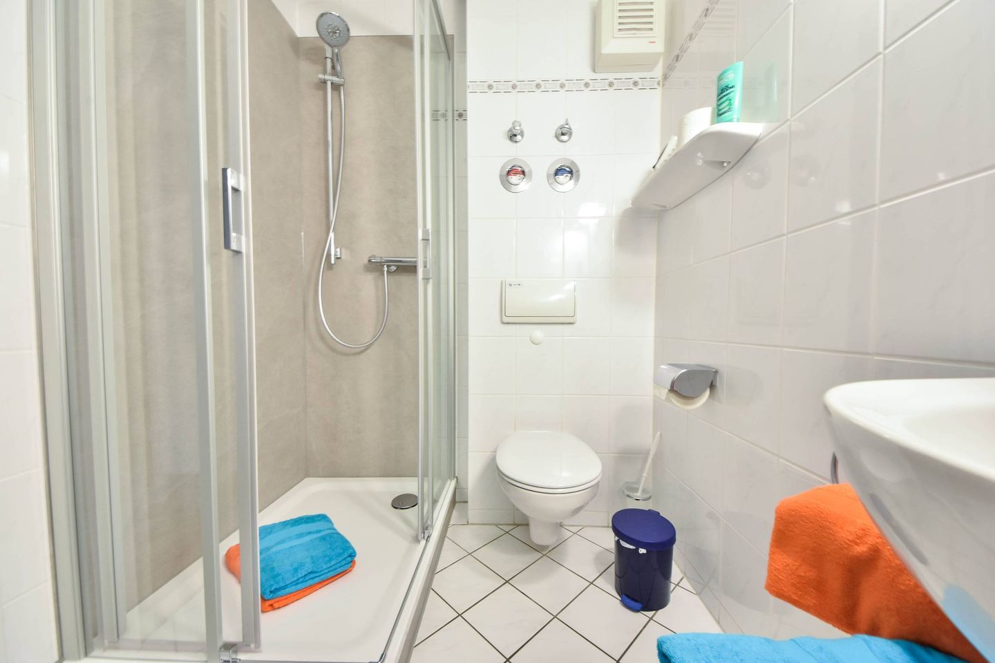 Im separaten Schlafzimmer sorgt ein Doppelbett (200 x 180 cm) für erholsamen Schlaf. Der geräumige Kleiderschrank bietet ausreichend Platz für Kleidung und persönliche Dinge. Das moderne Badezimmer überzeugt mit nahezu bodengleicher Dusche, Waschbecken und WC – stilvoll und funktional zugleich. Für einen rundum gelungenen Aufenthalt sind alle Betten bei Anreise bezogen, Handtücher liegen bereit und eine Grundausstattung für Küche und Bad ermöglicht einen stressfreien Start in den Urlaub.