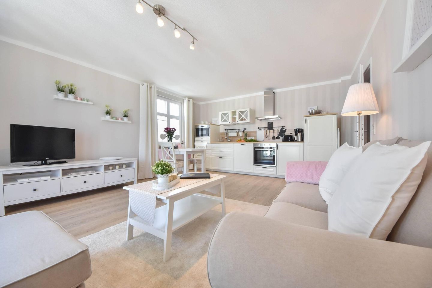 Die moderne und gut ausgestattete Küchenzeile verfügt über ein Ceran-Kochfeld, einen Backofen, eine Mikrowelle, einen Geschirrspüler und einen Kühlschrank mit Gefrierfach. Sie geht offen in den Wohnbereich über, der eine helle und freundliche Atmosphäre schafft. Der separate Essbereich ist perfekt für gemeinsame Mahlzeiten. Der gemütliche Wohnbereich ist mit einer bequemen Couch und einem TV-Gerät ausgestattet, ideal für entspannte Abende.
