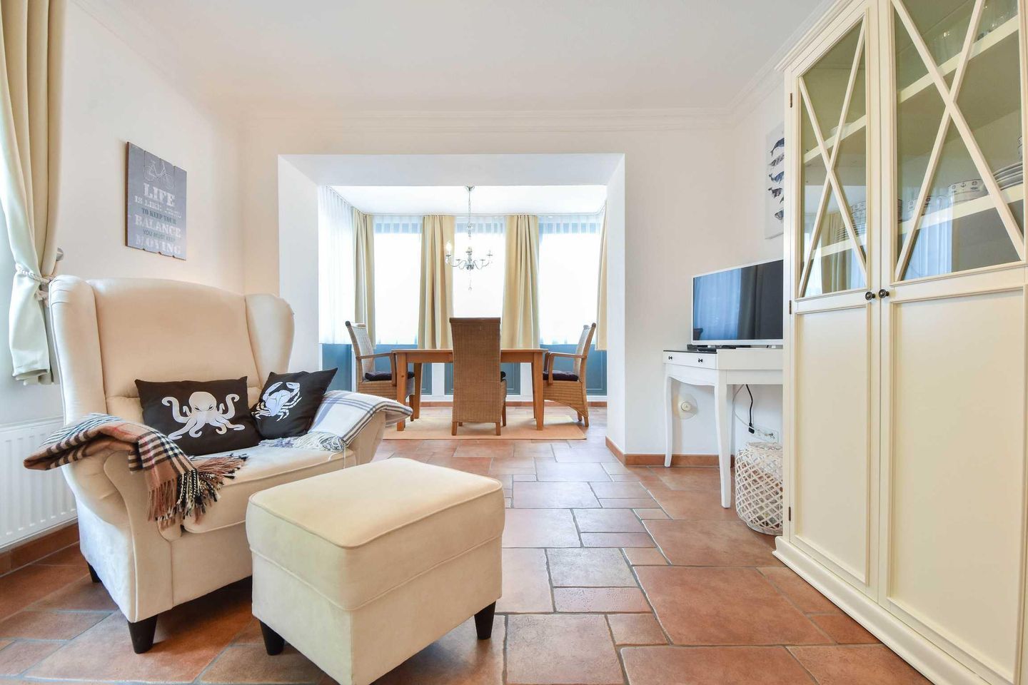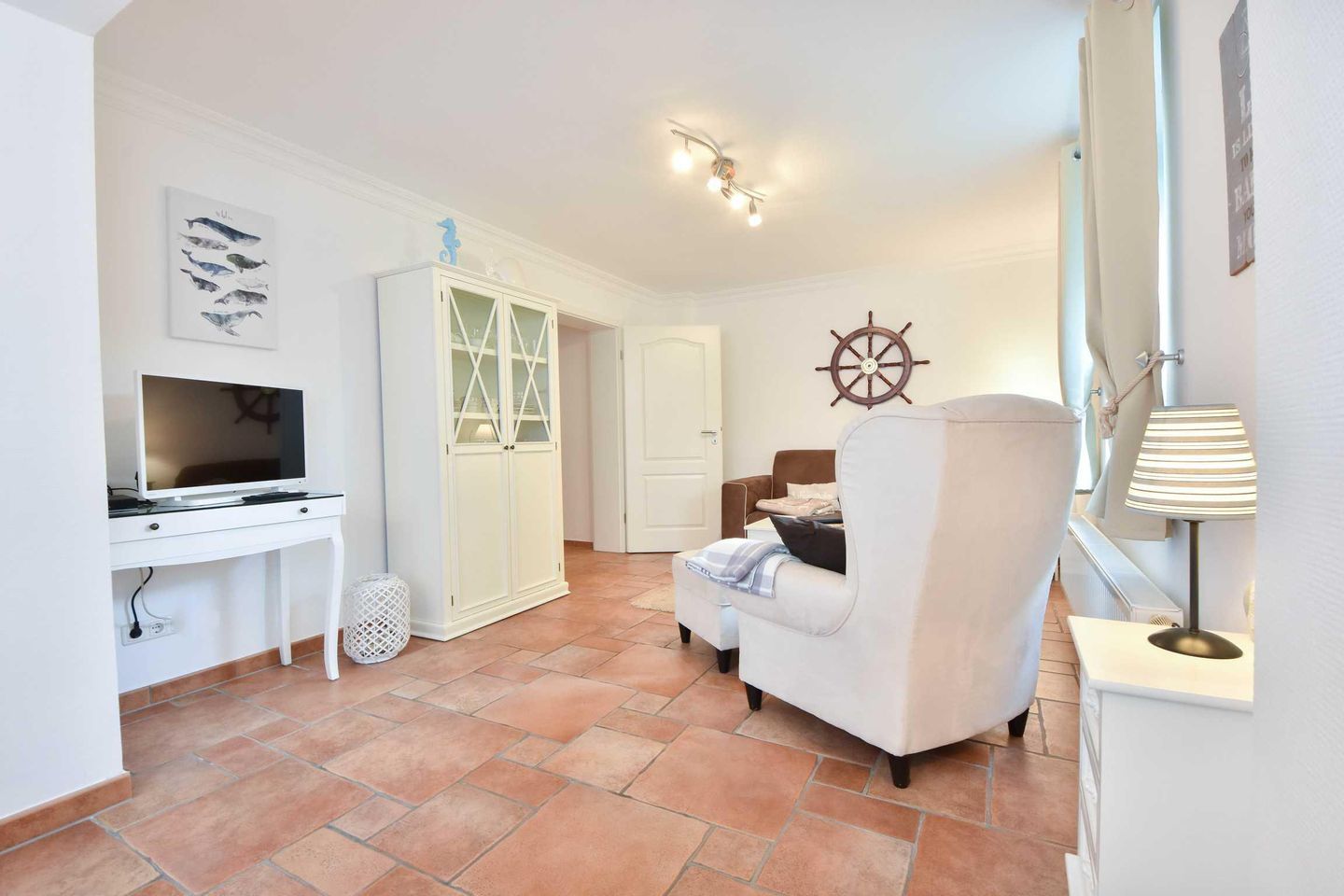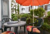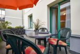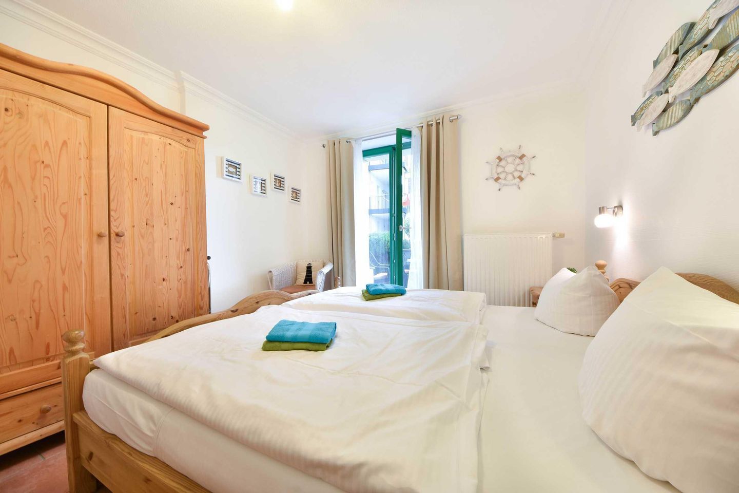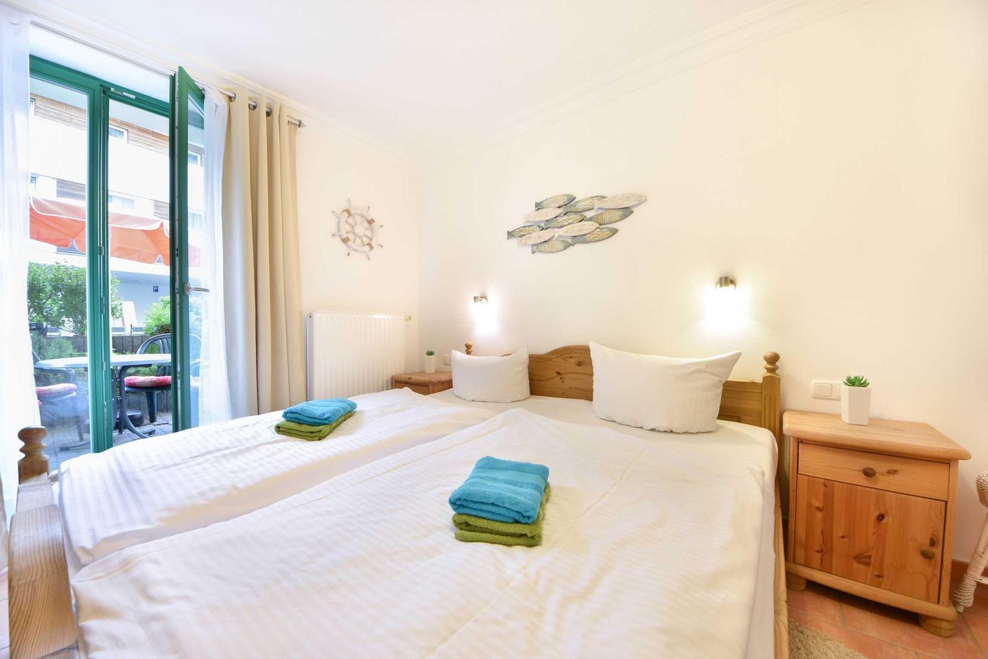 Dieses 2-Zimmer-Appartement befindet sich im Erdgeschoss als zum Süden ausgerichtetes, ebenerdiges Vollgeschoss. Die vom Wohnraum begehbare Terrasse zum Hof ist ebenfalls in Richtung Süden gerichtet. Im modernen und maritimen Wohnzimmer befinden sich eine gemütliche Sitzecke (Couch mit Schlaffunktion) sowie ein Esstisch für vier Personen. Die separate Küche verfügt über ein Cerankochfeld und einen Backofen sowie einen kleinen Esstisch für den ersten, morgentlichen Kaffee. Das Bad bietet eine Dusche, Waschtisch und WC. Der Schlafraum ist mit einem Doppelbett und genügend Schrankraum ausgestattet. Besonders familienfreundlich sind der bereits in der Wohnung vorhandene Hochstuhl, sowie das Baby-Reisebett inklusive Matratze aber ohne Wäsche.