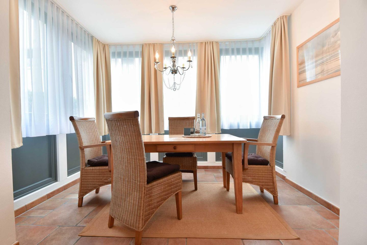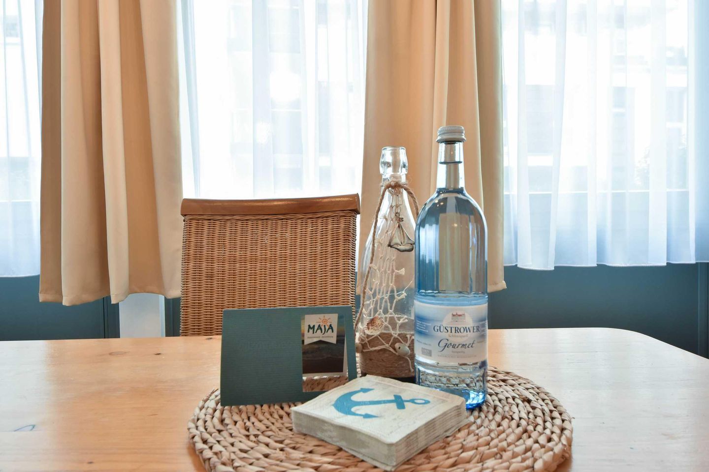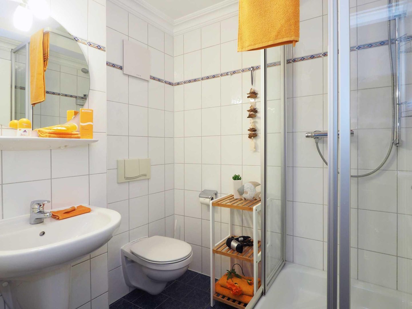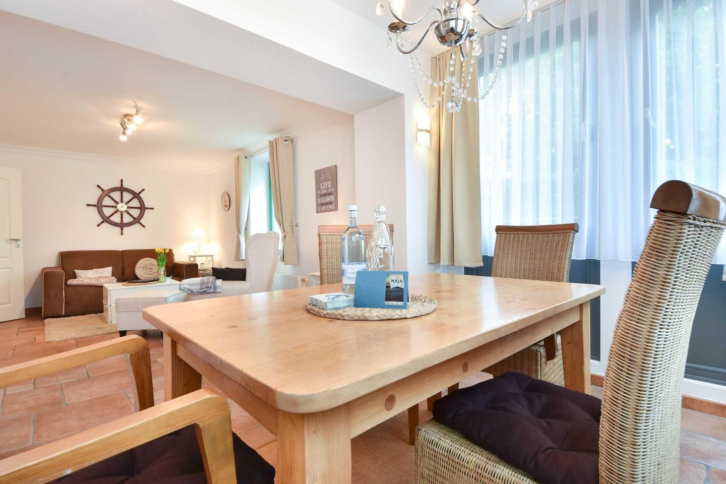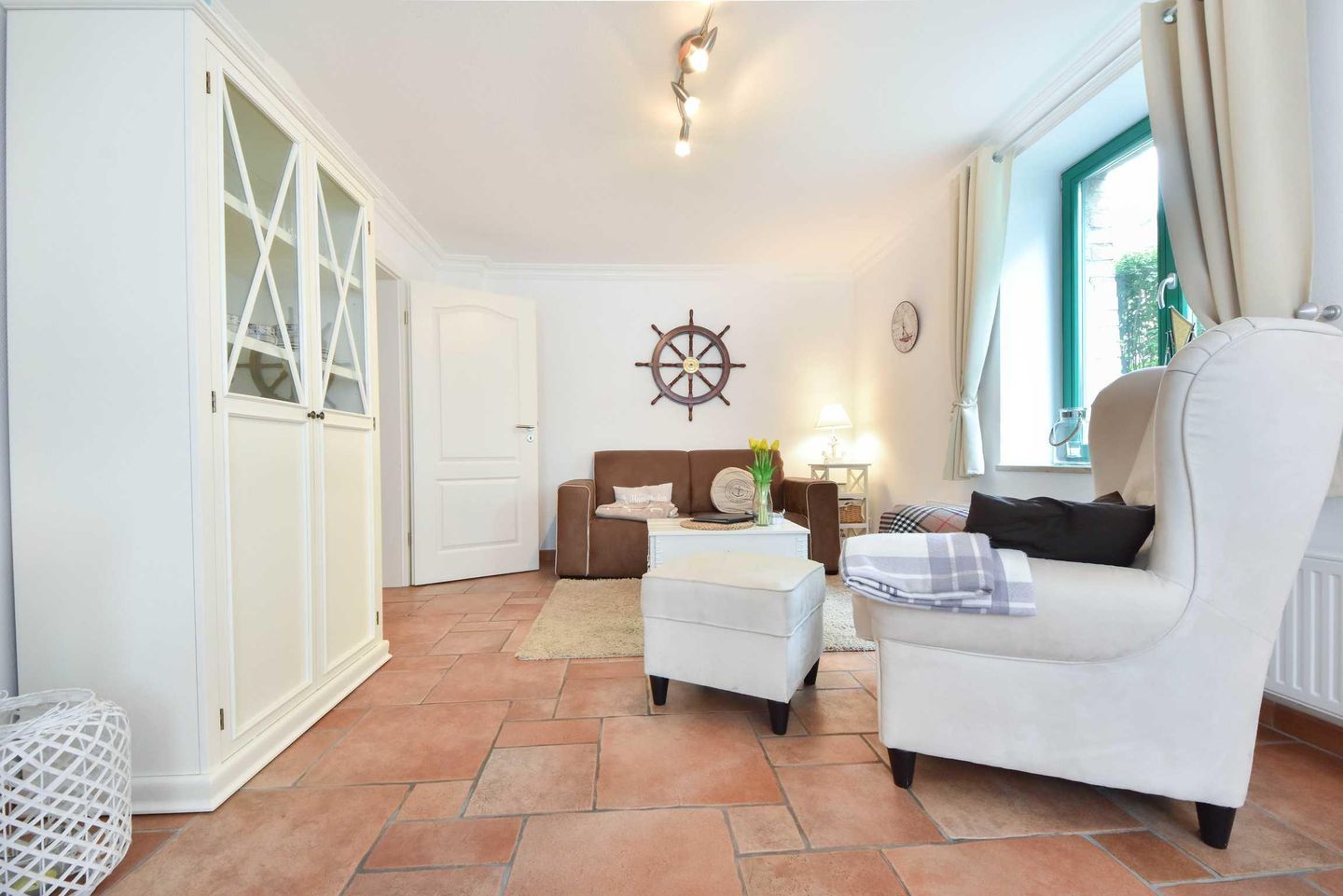 Dieses 2-Zimmer-Appartement befindet sich im Erdgeschoss als zum Süden ausgerichtetes, ebenerdiges Vollgeschoss. Die vom Wohnraum begehbare Terrasse zum Hof ist ebenfalls in Richtung Süden gerichtet. Im modernen und maritimen Wohnzimmer befinden sich eine gemütliche Sitzecke (Couch mit Schlaffunktion) sowie ein Esstisch für vier Personen. Die separate Küche verfügt über ein Cerankochfeld und einen Backofen sowie einen kleinen Esstisch für den ersten, morgentlichen Kaffee. Das Bad bietet eine Dusche, Waschtisch und WC. Der Schlafraum ist mit einem Doppelbett und genügend Schrankraum ausgestattet. Besonders familienfreundlich sind der bereits in der Wohnung vorhandene Hochstuhl, sowie das Baby-Reisebett inklusive Matratze aber ohne Wäsche.