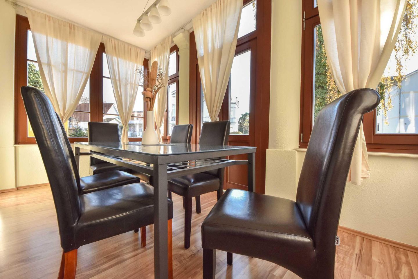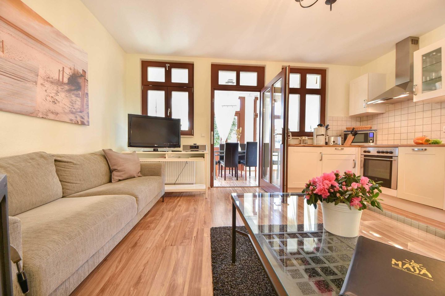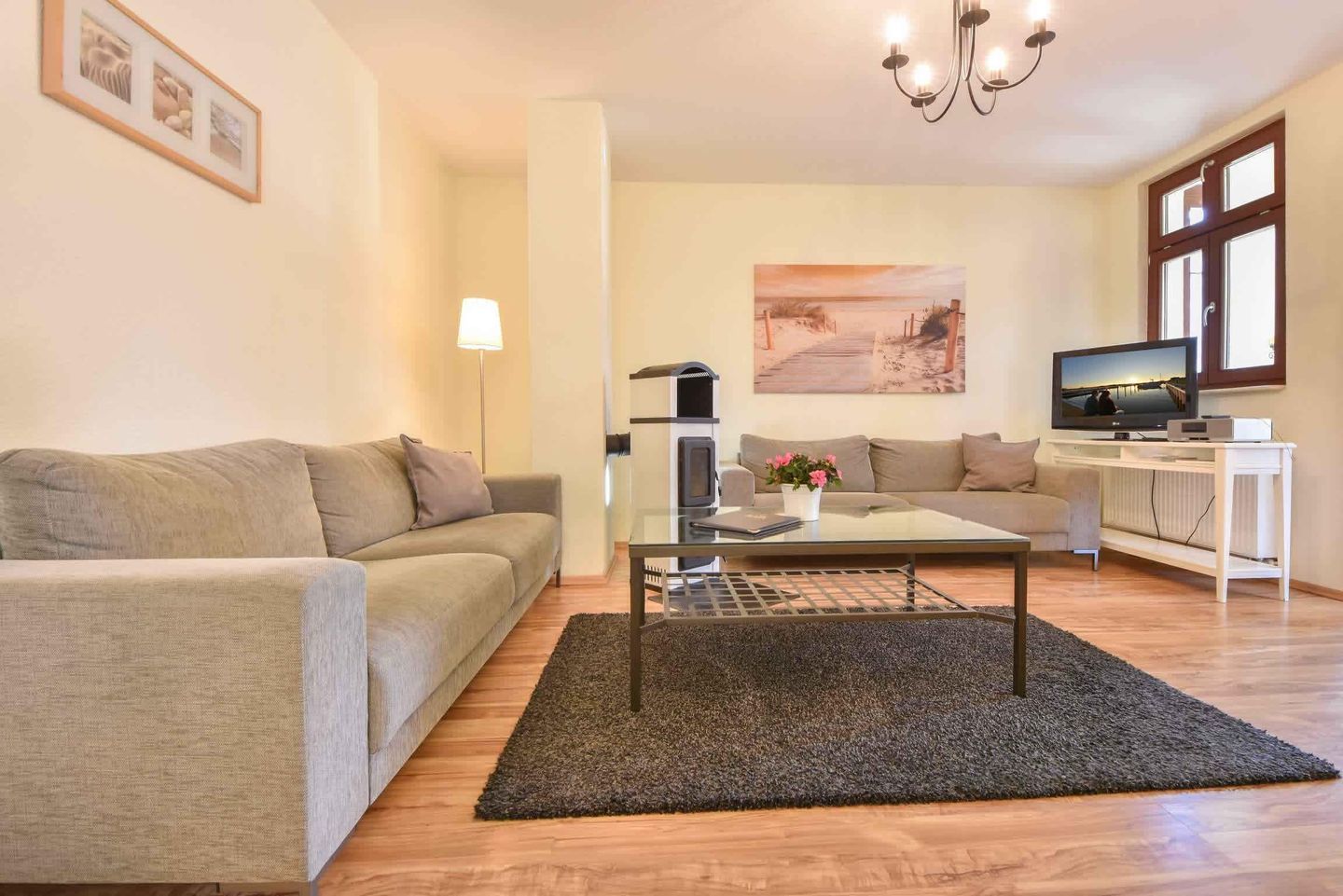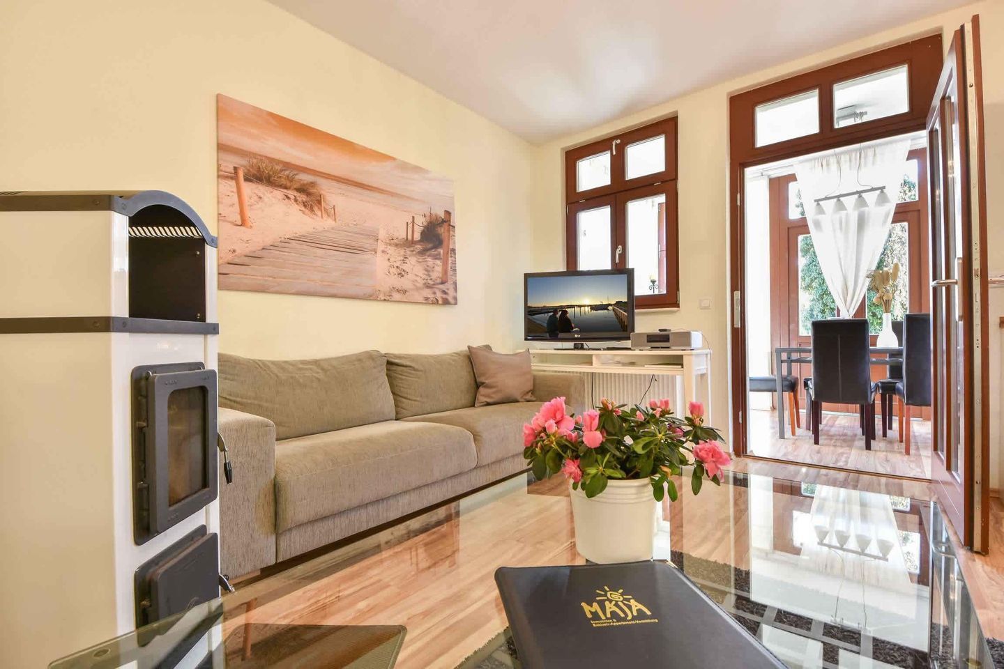 Diese komfortable Ferienwohnung mit einer Wohnfläche von großzügigen 79 Quadratmetern erwartet Sie im Erdgeschoss der Villa Lamora, die sich in einer verkehrsberuhigten Nebenstraße im Herzen von Heringsdorf befindet. Der Wohnbereich überzeugt mit einer gemütlichen Couchecke. In der kalten Jahreszeit sorgt der Kamin für eine angenehme Wohlfühlwärme. In der voll ausgestatteten Küche bereiten Sie Ihre Lieblingsspeisen während des Urlaubs zu. Der große Esstisch in der angrenzenden, nach Osten ausgerichteten Loggia, lädt bis zu sechs Personen zu den gemeinsamen Mahlzeiten ein.