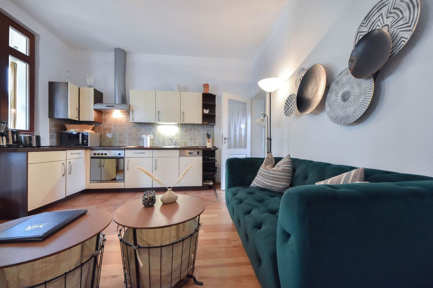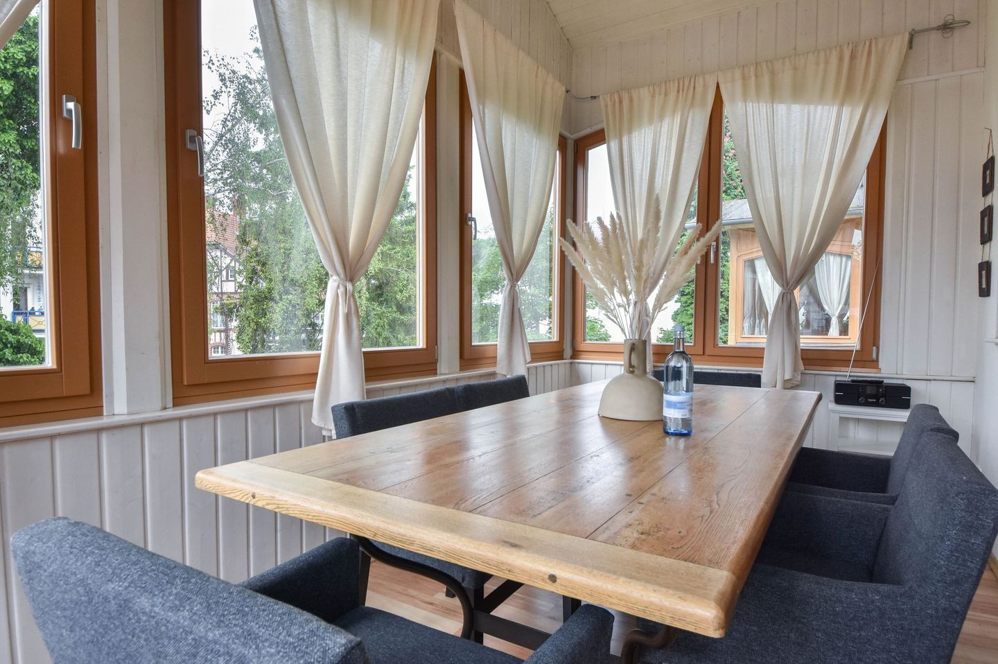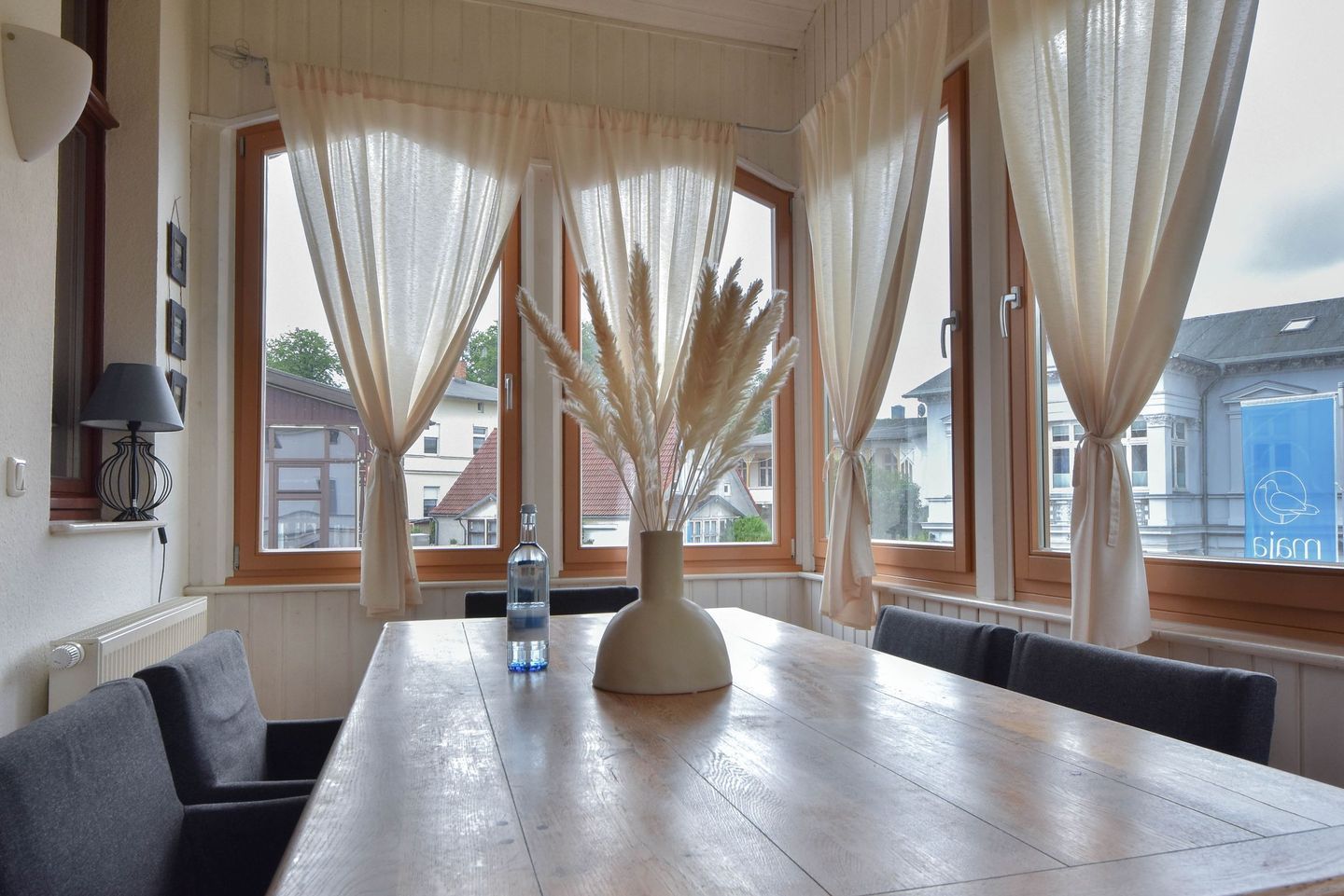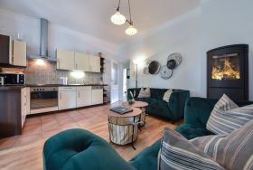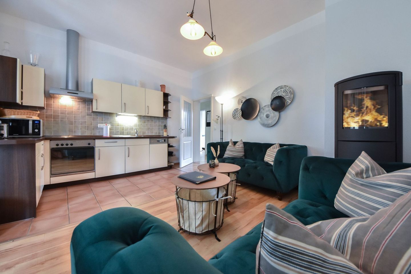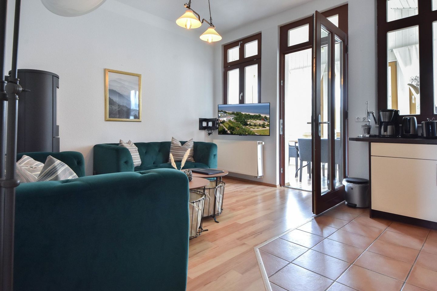 Diese komfortable Ferienwohnung mit drei Schlafzimmern und einer Wohnfläche von großzügigen 78 Quadratmetern erwartet Sie im 1. Obergeschoss der Villa Lamora, die sich in einer verkehrsberuhigten Nebenstraße im Herzen von Heringsdorf befindet. Der Wohnbereich überzeugt mit einer gemütlichen Couchecke. In der kalten Jahreszeit sorgt der Kamin für eine angenehme Wohlfühlwärme. In der voll ausgestatteten Küche bereiten Sie Ihre Lieblingsspeisen während des Urlaubs zu. Der große Esstisch in der angrenzenden, nach Osten ausgerichteten Loggia, lädt bis zu sechs Personen zu den gemeinsamen Mahlzeiten ein.