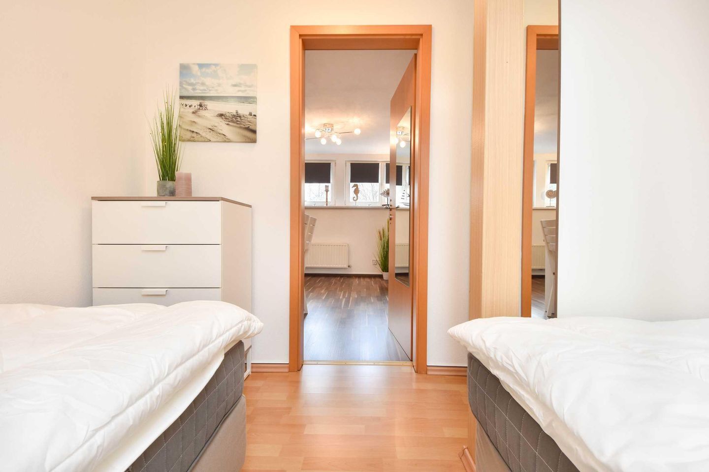 In der zweiten Etage der Villa zur See erwartet Sie eine mit viel Liebe zum Detail eingerichtete und neu renovierte Ferienwohnung. Auf 49 Quadratmetern finden hier idealerweise vier Personen ihr perfektes Urlaubsdomizil. Neben dem großen Wohnraum verteilen sich die 2,5-Zimmer auf ein großes Schlafzimmer mit Doppelbett sowie ein kleineres Schlafzimmer mit zwei Einzelbetten. Die moderne Küche ist separat angeordnet und mit Backofen, Mikrowelle und Geschirrspüler voll ausgestattet. Sie lässt auch bei gehobenen Ansprüchen keine Wünsche offen.
