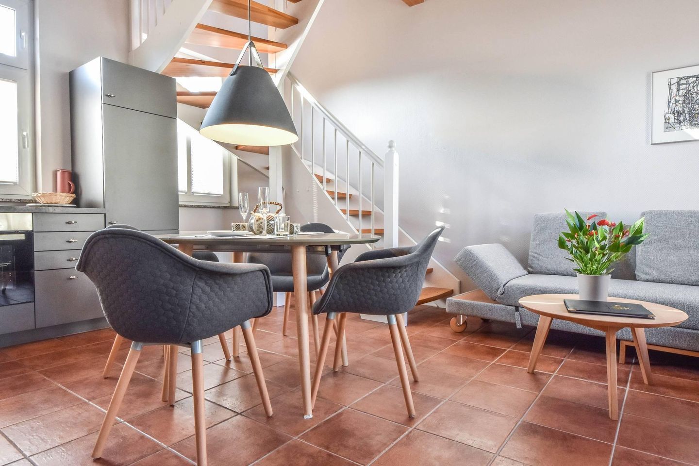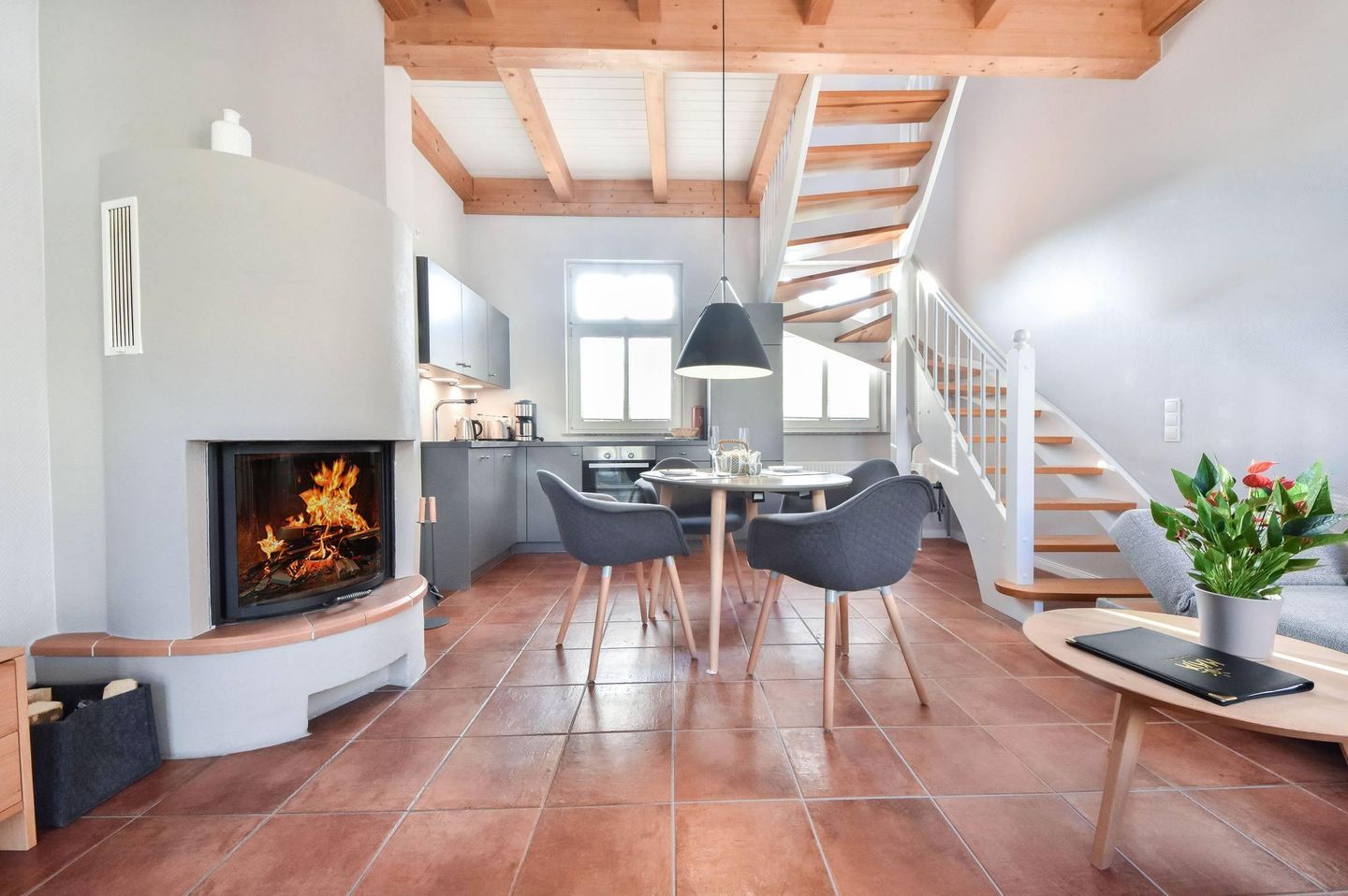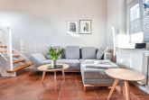Im Herzen des Ostseebades Bansin erwartet Sie eine liebevoll renovierte Maisonette-Wohnung, die sich über zwei Etagen erstreckt und zum Wohlfühlen einlädt. Der offene Wohnraum ist in modernen Farben gestaltet und strahlt dank der warmen Fußbodenfarbe und der hellen Holzbalken dennoch Gemütlichkeit aus. Neben der Sitzecke und dem Kamin finden Sie außerdem die voll ausgestattete Küchenzeile und den Esstisch im Erdgeschoss. Das Schlafzimmer mit Doppelbett und Flachbild-TV sowie angrenzendem Bad befindet sich im Obergeschoss. Das Tageslichtbad besticht mit einer hochwertigen und ebenerdigen Dusche und neuem Design. Im Wohnraum sorgt der Kamin in der kalten Jahreszeit für angenehme Wärme. Auf der Couch lässt es sich prima bei einem Buch entspannen. Außerdem kann sie von einer dritten Person als Aufbettung genutzt werden.