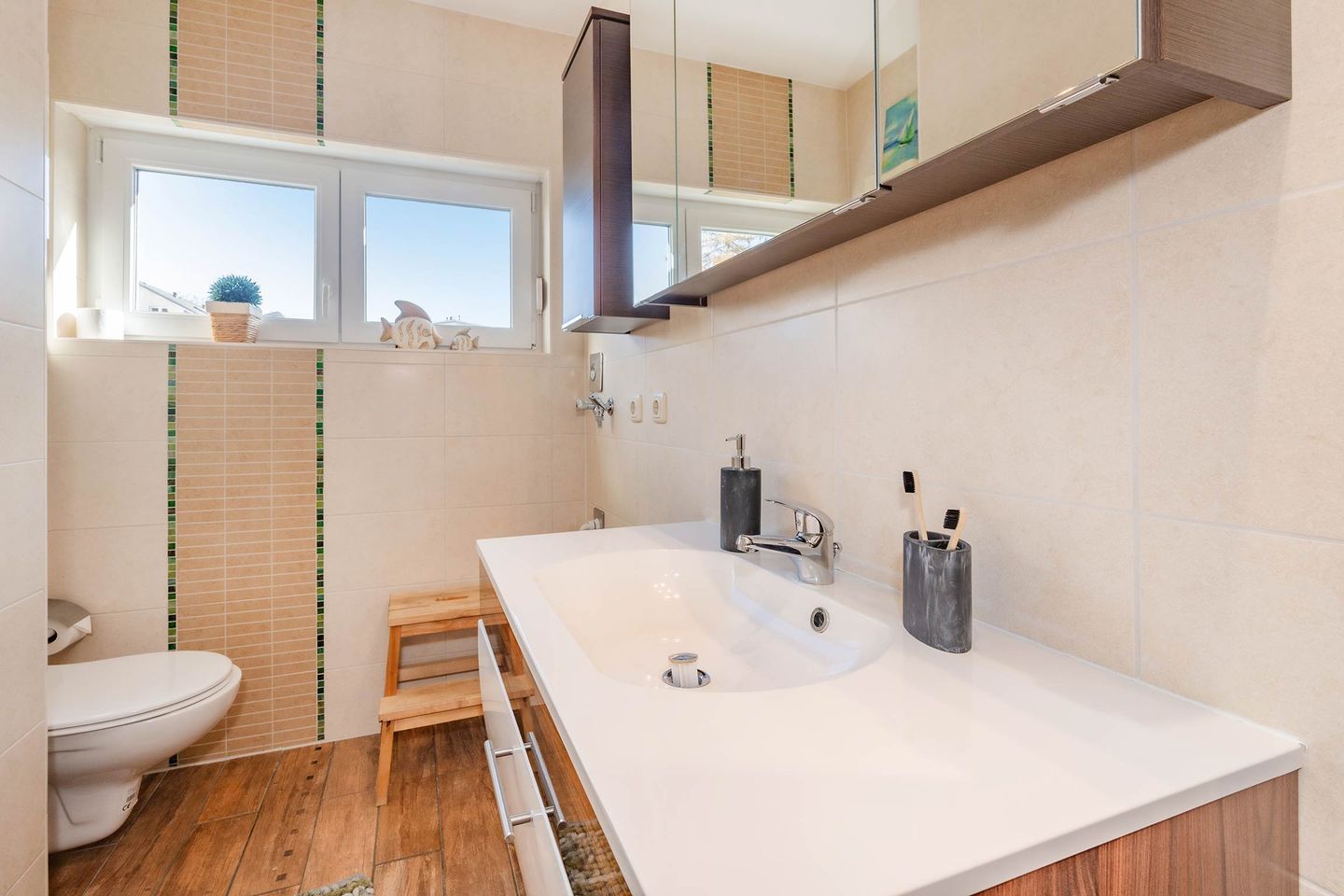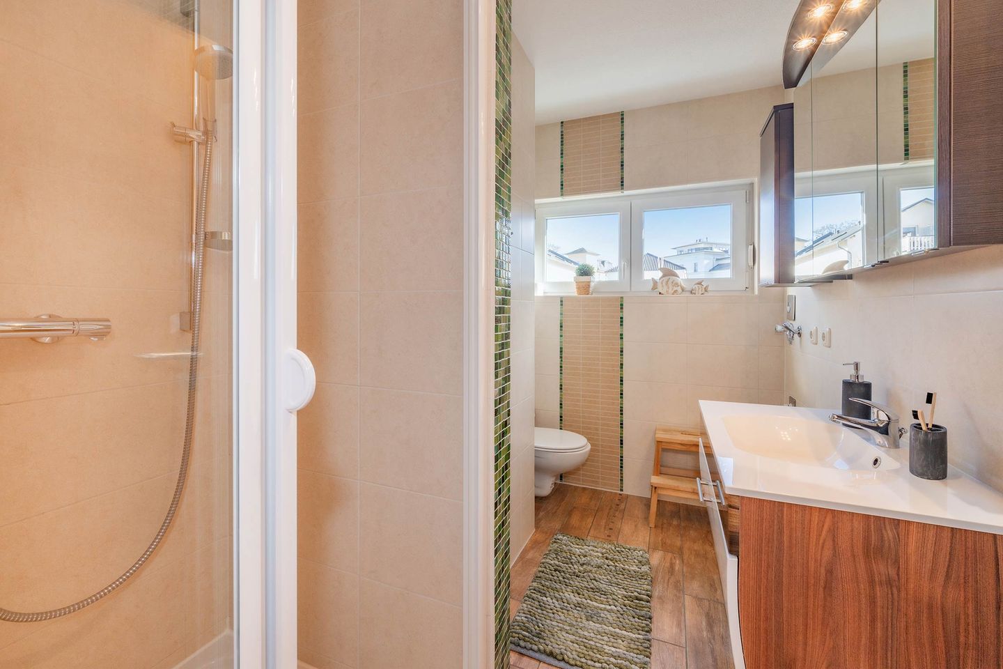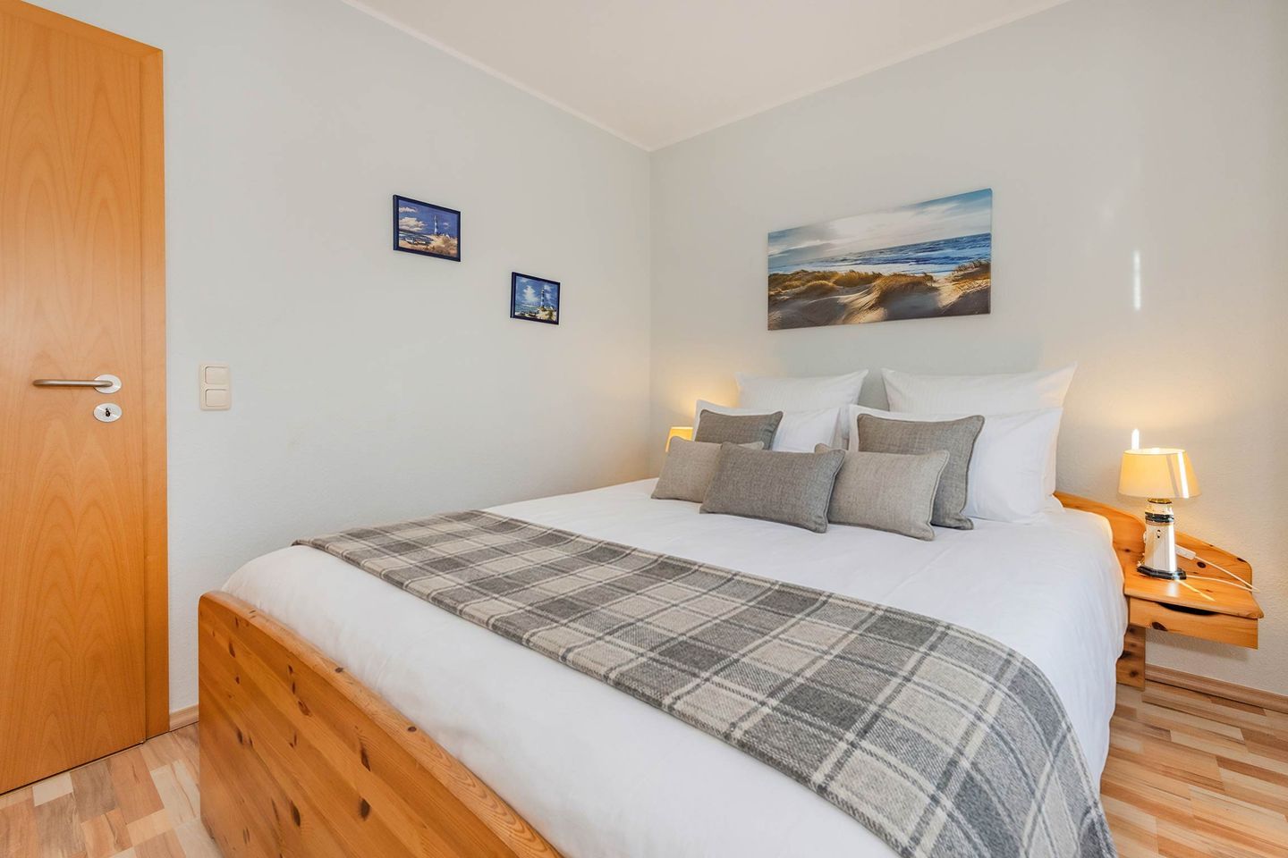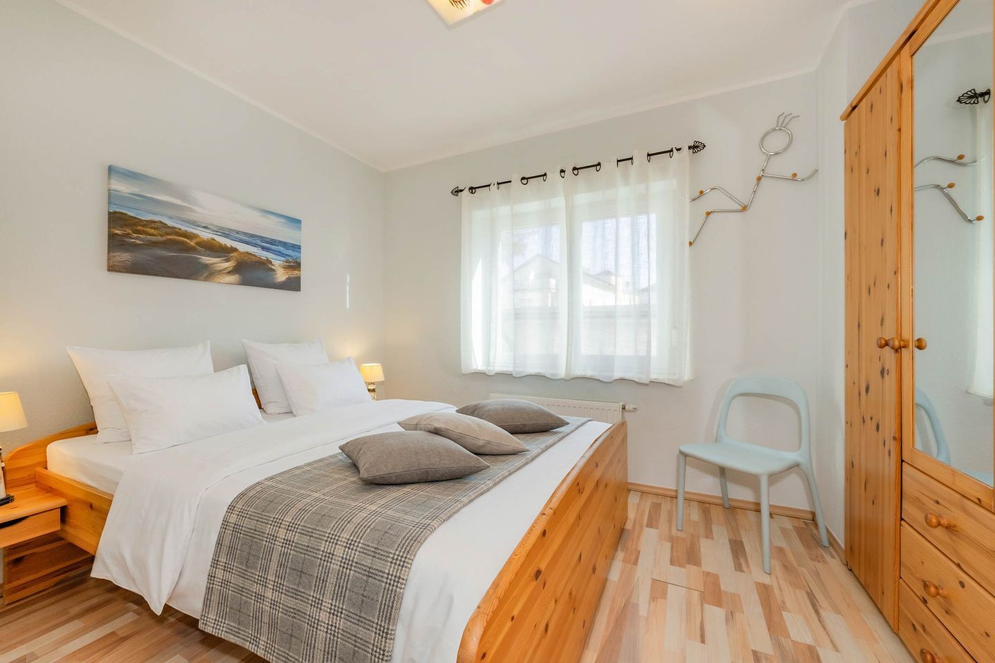 Vom Flur aus abgehend erreichen Sie das Schlafzimmer, ausgestattet mit Doppelbett (1,60m x 2,00m) und Kleiderschrank. Das Bad mit Dusche und extra breitem Waschbecken ist modern gestaltet und rundet den Komfort für den Urlaub zu zweit ab.