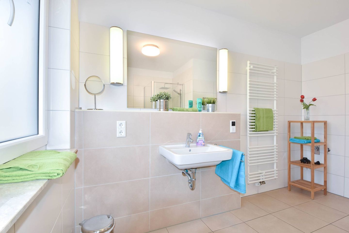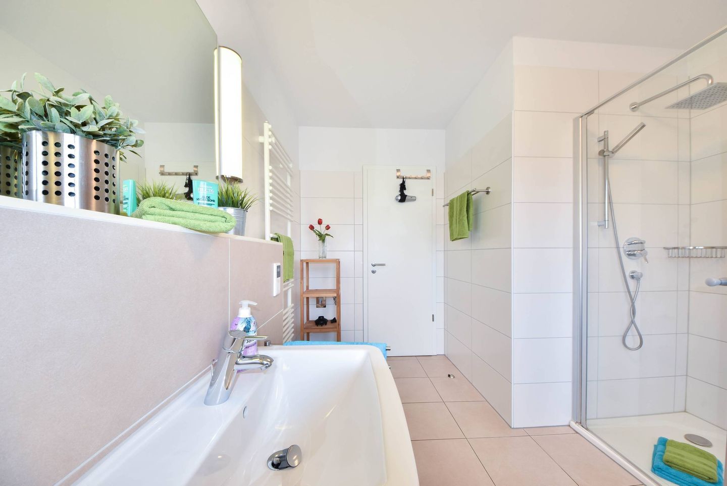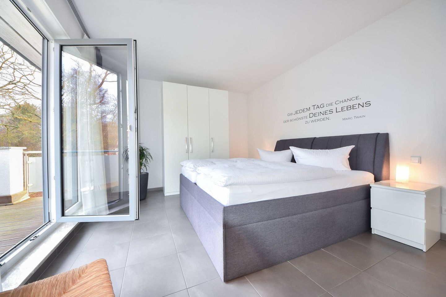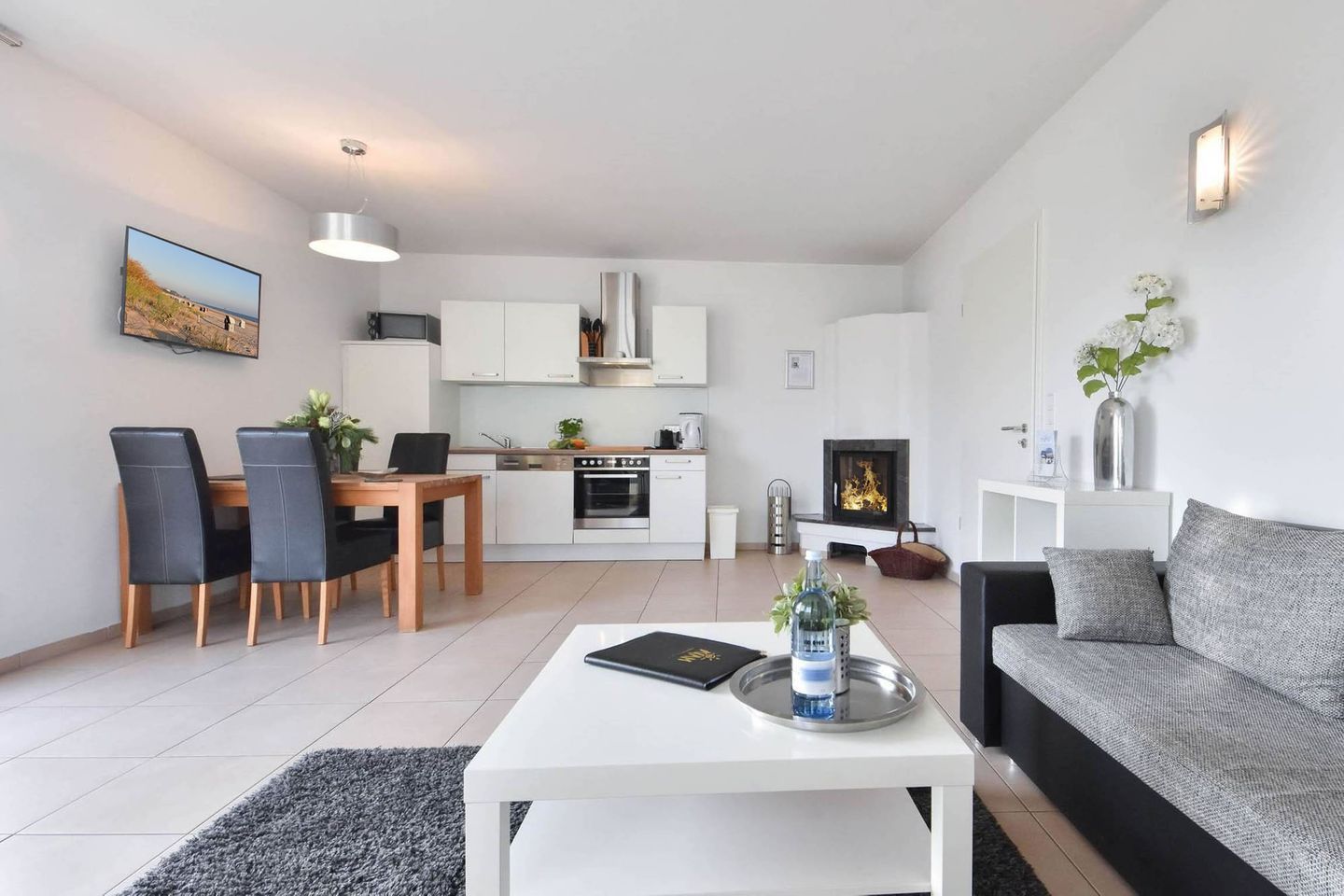 Die Wohnung Ostseestrand bietet auf 70 Quadratmetern viel Platz für drei Personen, davon ein Kind, und zusätzlich ein Kleinkind im Kinderreisebett. Der Wohnbereich ist offen gestaltet und verfügt über eine bequeme Sitzecke sowie einen Esstisch und eine voll ausgestattete Küchenzeile samt Mikrowelle, Backofen, Ceranfeld und Spülmaschine. Hier bereiten Sie gern Ihr Urlaubsfrühstück vor. In der kalten Jahreszeit sorgt der Kamin für eine angenehme Atmosphäre. Der zweite Balkon mit südlicher Ausrichtung und Blick zum Garten des Hauses lädt Sie dazu ein, bei einem Glas Wein den Tag ausklingen zu lassen. Das geräumige Schlafzimmer ist mit einem hochwertigen Doppelbett ausgestattet und bietet ebenfalls ausreichend Platz für Ihre Garderobe. Das Tageslichtbad besticht mit modernem Design und verfügt über eine ebenerdige Dusche.