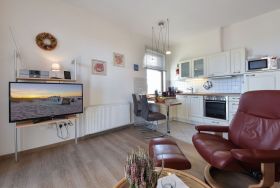 Der Wohnraum ist offen gestaltet und verfügt über eine voll ausgestattete Küche samt allen elektronischen Geräten, einen kleinen Tresen mit zwei Stühlen, sowie die Couch und den Fernsehsessel. Die Loggia ist halb abgegrenzt. Ein großer Flachbild-Fernseher mit 32 Zoll sorgt auch an Schlechtwetter-Tagen für gute Unterhaltung. Internet-Radio und DAB+ runden das elektronische Angebot ab. Im geräumigen Schlafzimmer erwartet Sie ein großes, hochwertiges Doppelbett (200cm x 200cm), in dem Sie hervorragend ruhen werden. Ein großer Kleiderschrank und ausreichend Stauraum sind vorhanden. Die Fenster können für Ihren Schlafkomfort verdunkelt werden.