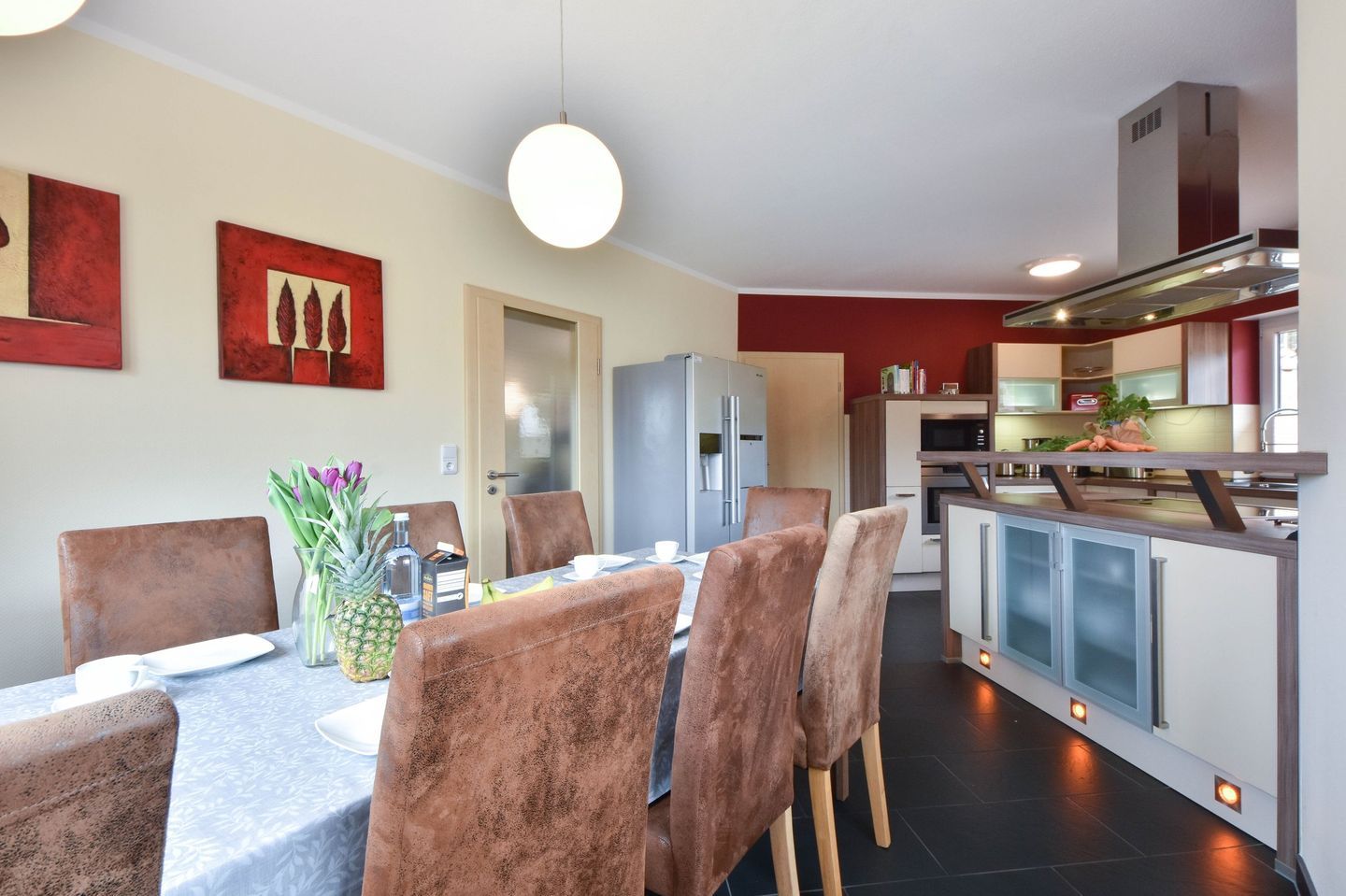Das geräumige Wohnzimmer ist stilvoll eingerichtet mit einer weitläufigen Couchgarnitur, Sesseln, einem 55-Zoll-Flachbild-TV und einem Surround-System ausgestattet. An kalten Wintertagen sorgt der Kamin für zusätzlichen Komfort und angenehme Atmosphäre. In den Sommermonaten genießen Sie Ihre Abende im gemütlichen Beisammensein auf der anliegenden Terrasse. Während Sie den fest installierten Kamingrill einheizen, haben die Kinder Spaß im Garten mit Spielturm, Rutsche und Schaukel. Sollte das Wetter einmal nicht mitspielen, lässt es sich auch hervorragend im Küchen- und Essbereich dinieren. Am großen Esstisch findet jedes Familienmitglied Platz. Die hochwertig ausgestattete Küche lädt mit nützlichen Küchenhelfern auch zum Kochen und Selbstverpflegen ein.