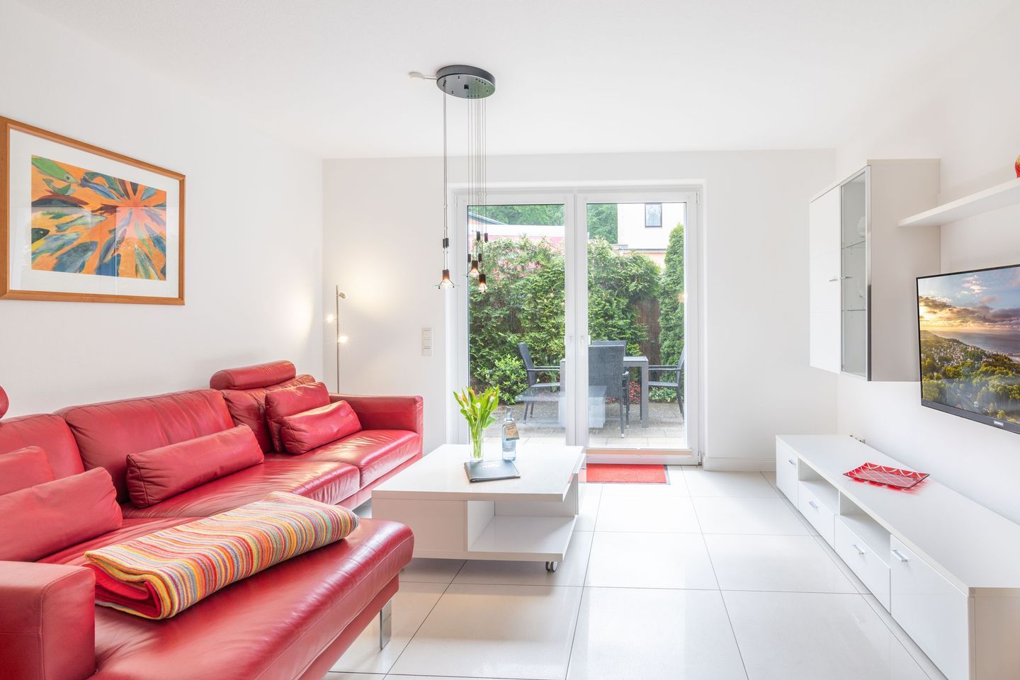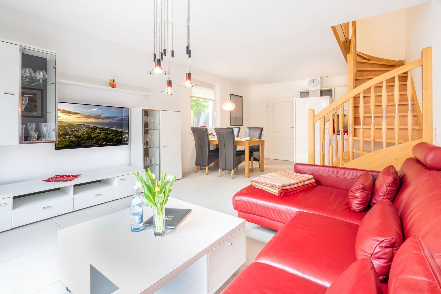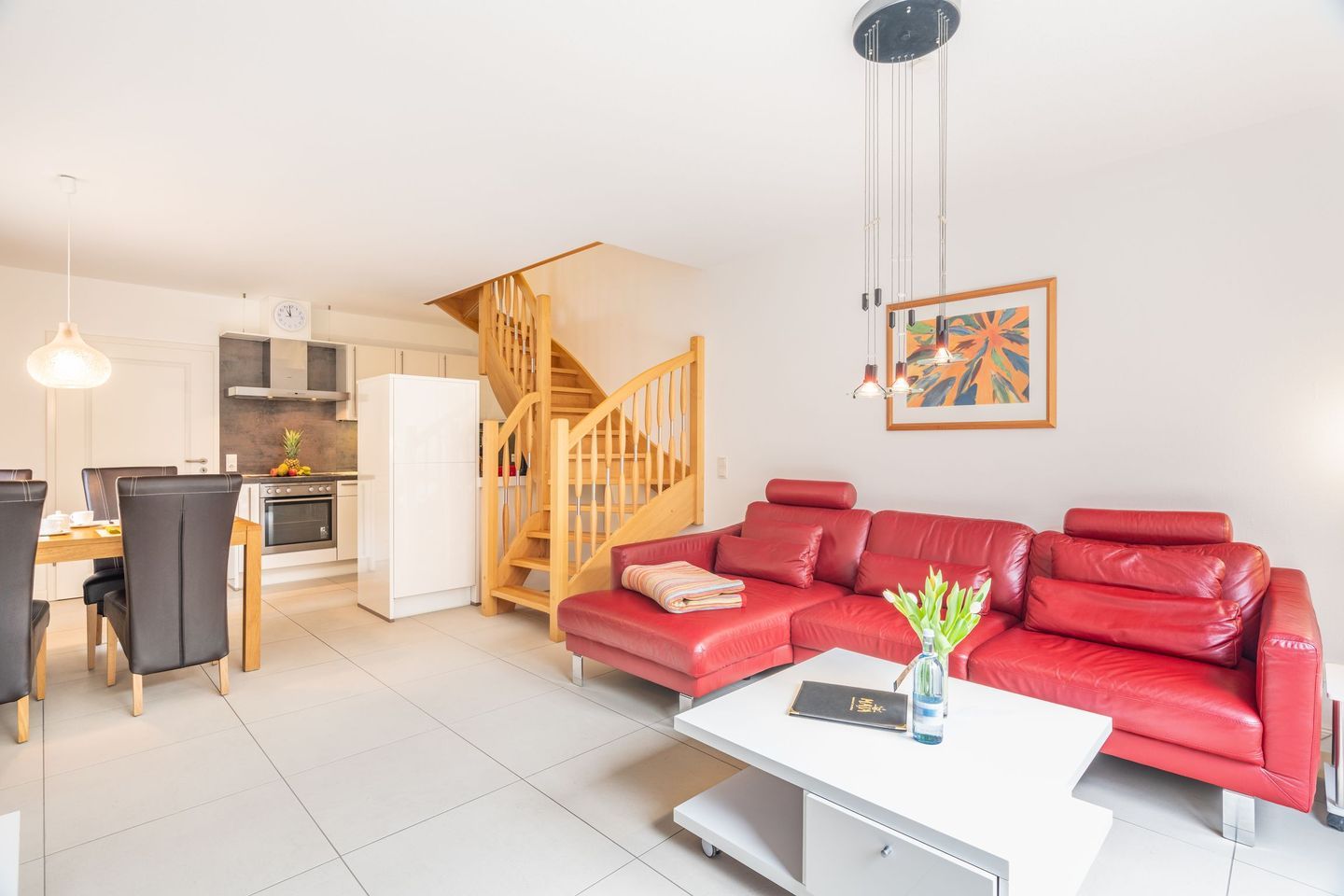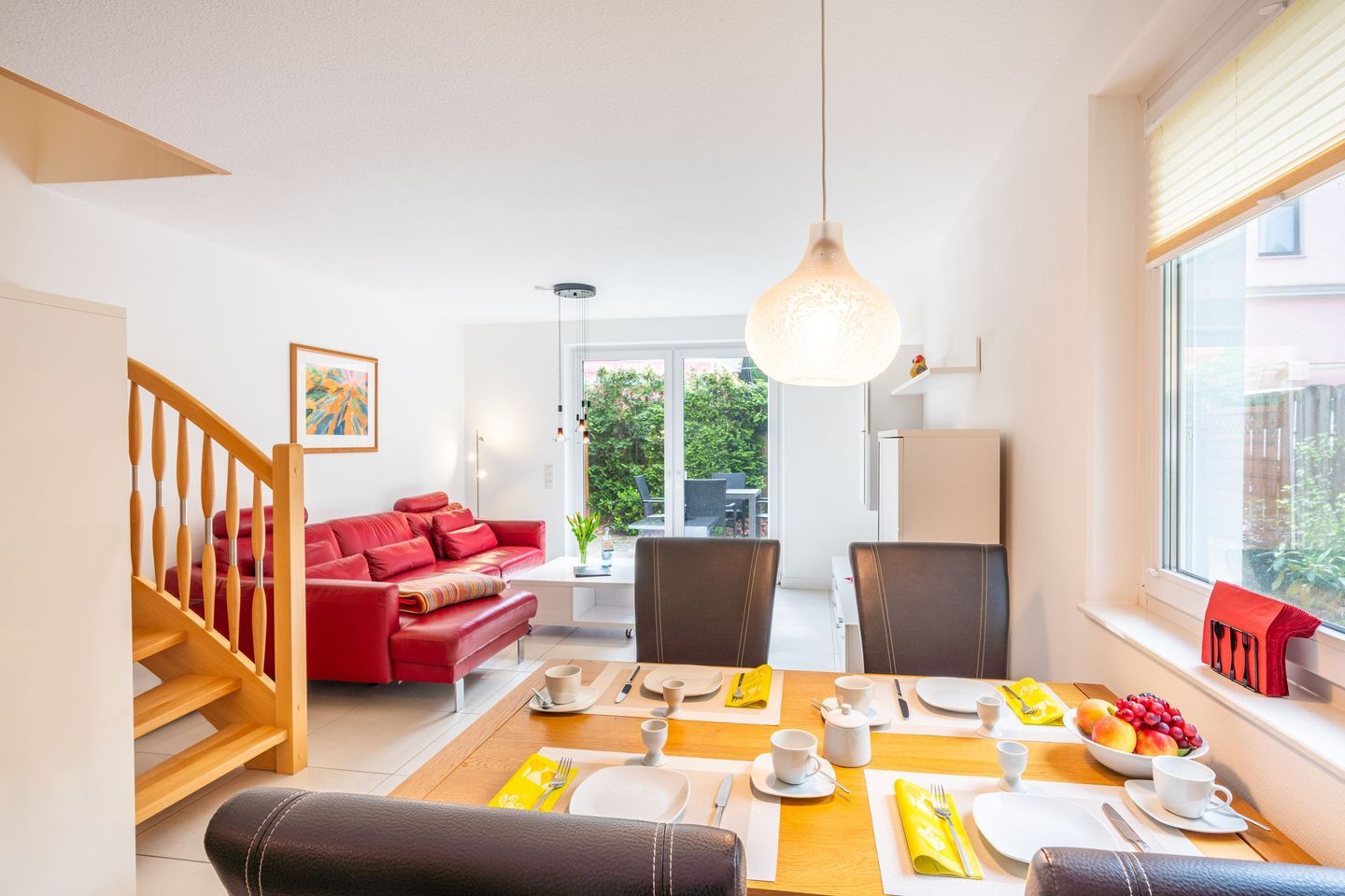 Die modern eingerichtete Maisonette-Wohnung in Heringsdorf bietet Ihnen mit zwei Schlafzimmern ausreichend Platz für bis zu vier Personen. Im Erdgeschoss der Wohnung befindet sich das große Wohnzimmer mit gemütlicher Couchgarnitur und Flat-TV. Unmittelbar angrenzend finden Sie die offene, vollwertig ausgestattete Küche und den großen Esstisch vor. Über das Wohnzimmer gelangen Sie auf die südlich ausgerichtete Terrasse, die bei sonnigem Wetter auch zu gemeinsamen Mahlzeiten im Freien einlädt.
