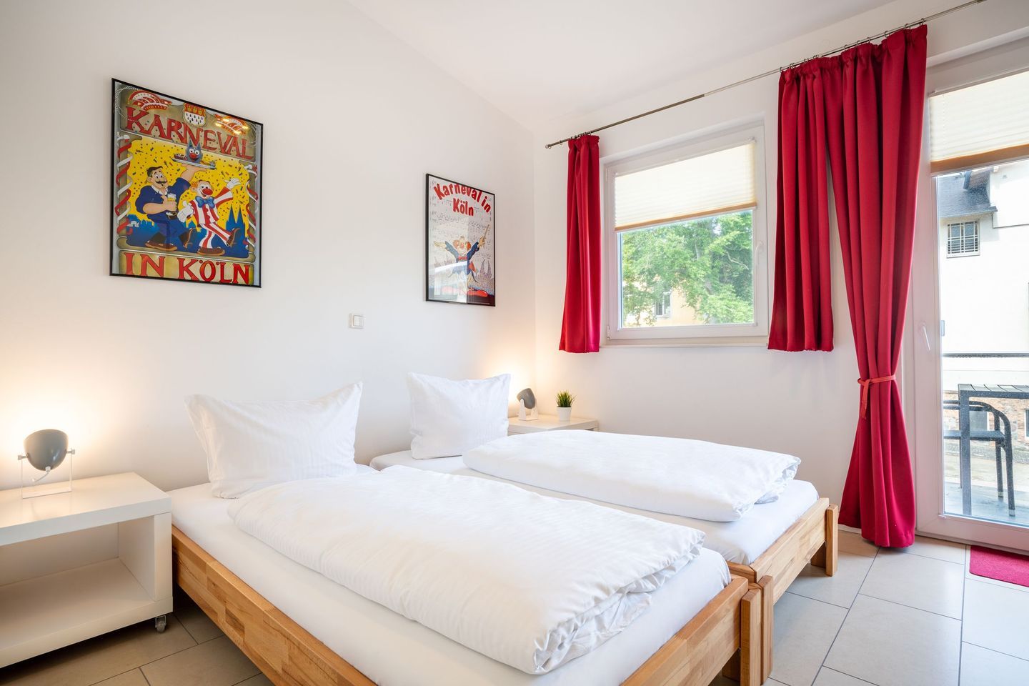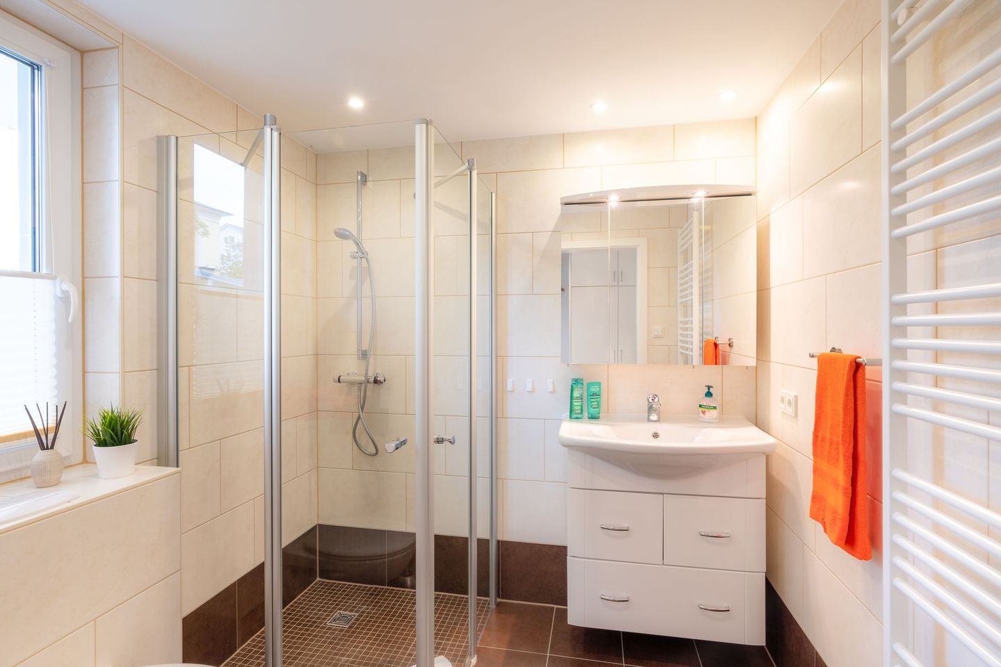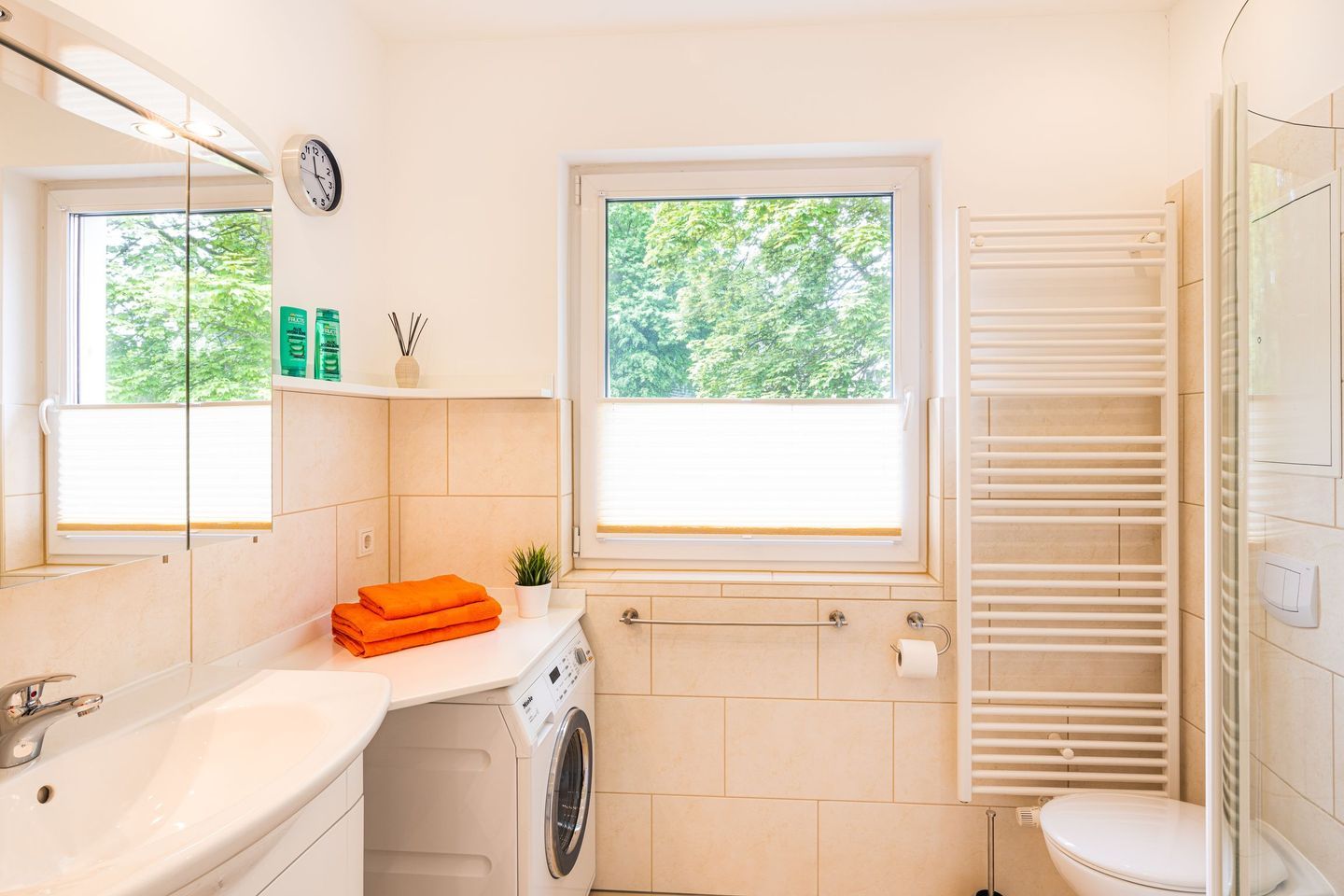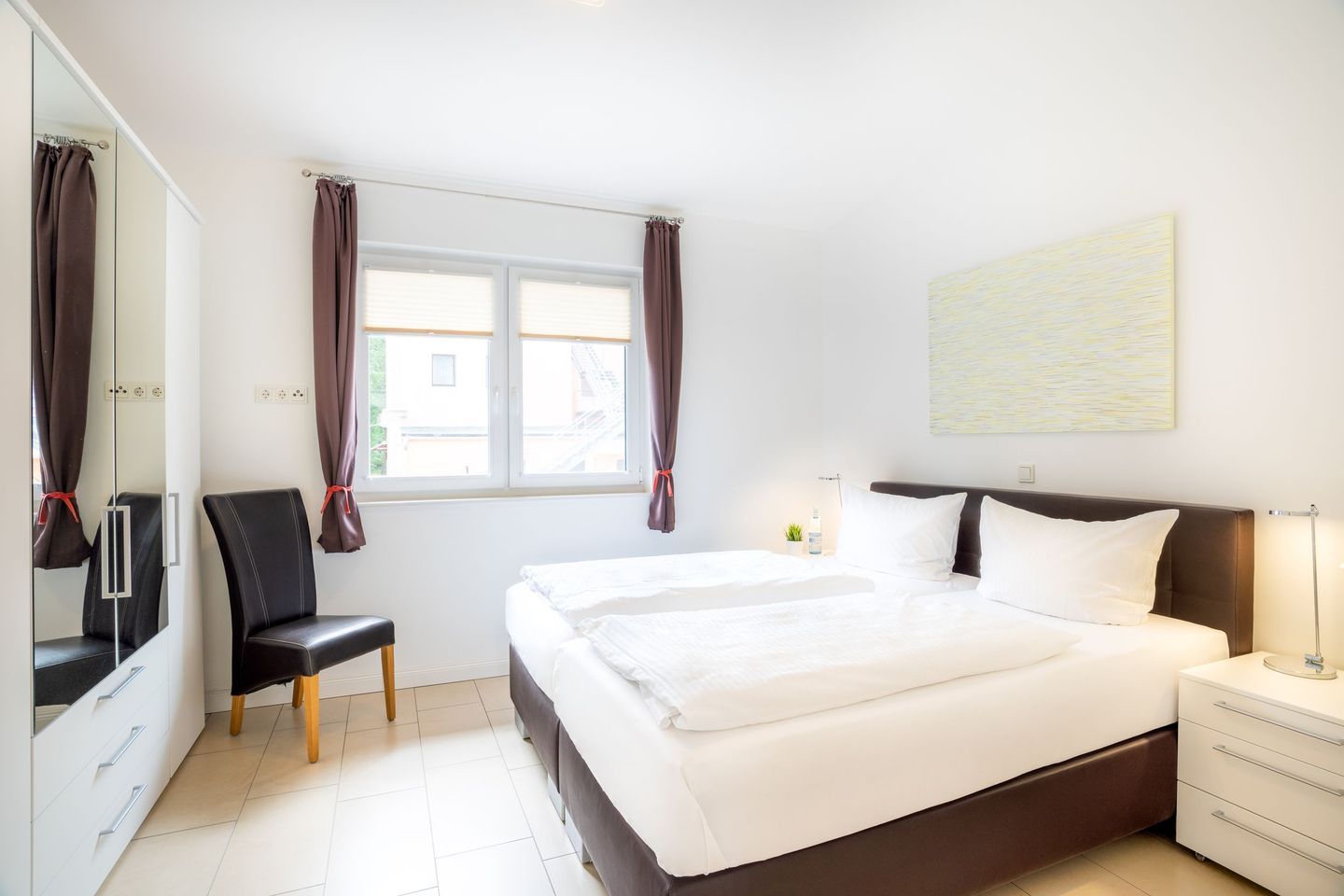 Die beiden Schlafzimmer befinden sich auf der oberen Etage der Wohnung und sind über eine Treppe erreichbar. Das erste Schlafzimmer ist eingerichtet mit einem Doppelbett (Liegefläche 1,80 x 2,00 Meter) und einem großen Kleiderschrank. Im zweiten Schlafzimmer befinden sich zwei Einzelbetten mit einer Liegefläche von je 0,90 x 2,00 Meter. Diese können einfach zusammengestellt werden. Bitte beachten Sie jedoch, dass durch den Holzrahmen der Betten keine geschlossene Liegefläche entsteht. Ein Kleiderschrank, ein kleiner Schreibtisch, ein zweiter Fernseher und der Zugang zum Balkon komplementieren die Ausstattung des Schlafzimmers. Für Ihren besonderen Komfort verfügt die Wohnung über zwei Tageslichtbäder - eines in der unteren und eines in der oberen Etage - ausgestattet mit jeweils einer Dusche, WC, Waschtisch und Handtuchheizung. Besonders familienfreundlich sind der bereits in der Wohnung vorhandene Hochstuhl, sowie das Baby-Reisebett inklusive Matratze aber ohne Wäsche. Beides können Sie während Ihres Aufenthaltes gebührenfrei nutzen.