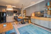 Bei der Einrichtung des Appartements wurden weder Herz noch Mühen gescheut und so wurde ein harmonisches Zusammenspiel von Farben und Stilen mit liebevollen Details erschaffen. Sie werden sich hier sofort wohlfühlen. Das Wohnzimmer ist mit einer großen Couchgarnitur und einen TV zu Ihrem Komfort eingerichtet. Frühstücken Sie bei ersten Sonnenstrahlen auf dem Balkon oder setzen Sie sich zusammen an den Esstisch im Wohnbereich. Die Wahl liegt bei Ihnen. Offen zum Wohnraum befindet sich die Küche, die mit allerhand praktischen Dingen aufwartet und Ihnen so auch das Kochen im Urlaub ermöglicht.