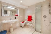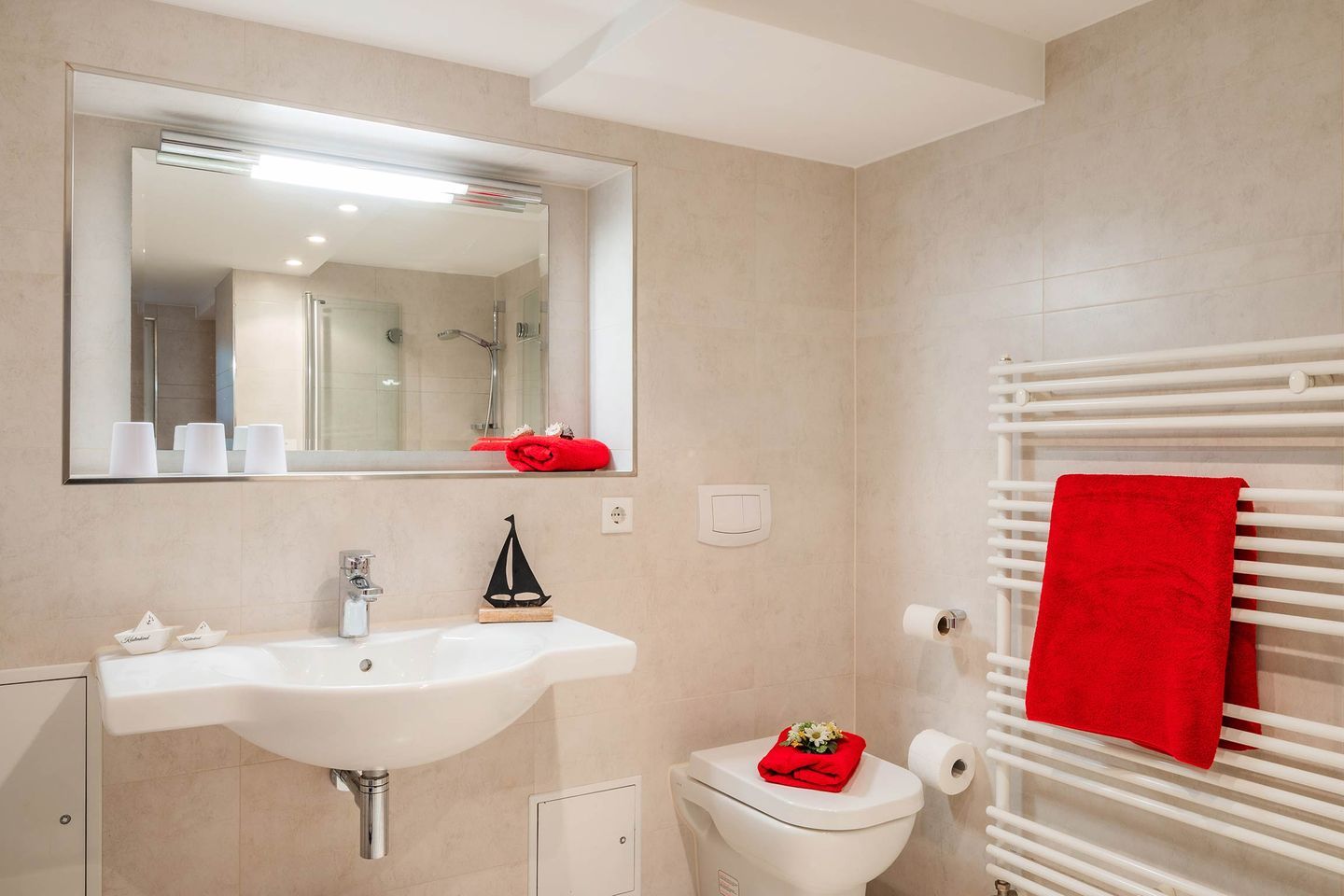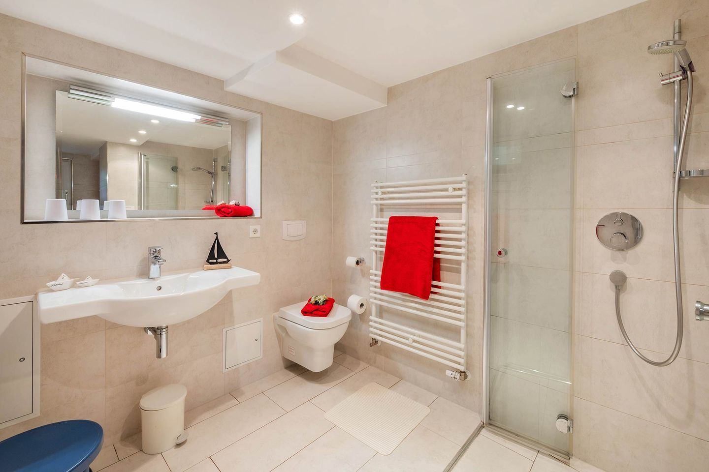 Das Badezimmer ist modern mit einem Waschbecken, WC, einer Dusche und einer Handtuchheizung eingerichtet.
