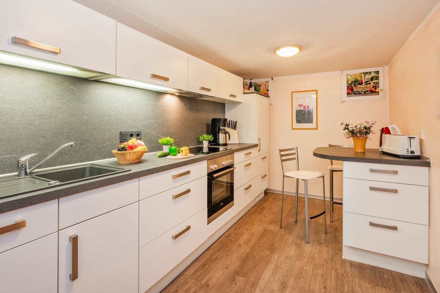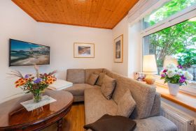 Die Wohnung 2 befindet sich in Tiefparterre des Hauses und verfügt über eine Wohnfläche von 65 Quadratmeter. Hier finden Sie Platz für bis zu 4 Personen. Im Wohnzimmer befindet sich ein großzügig bemessenes Ecksofa und ein Sessel, zudem ein TV zu Ihrer Unterhaltung. In einem Doppelbett finden die dritte und vierte Person ihren Schlaf.