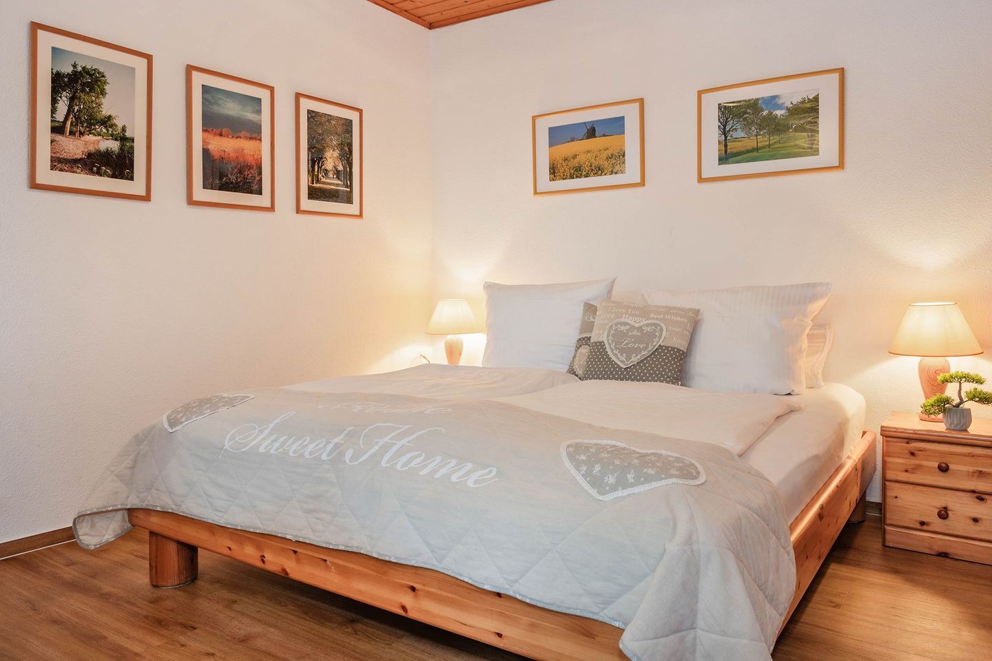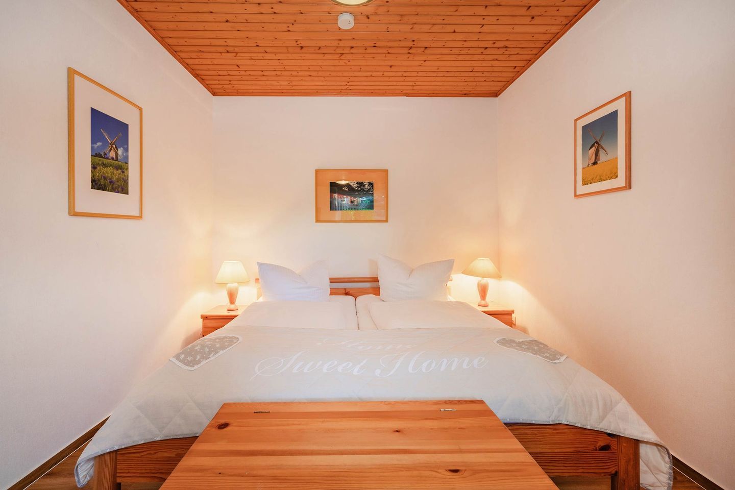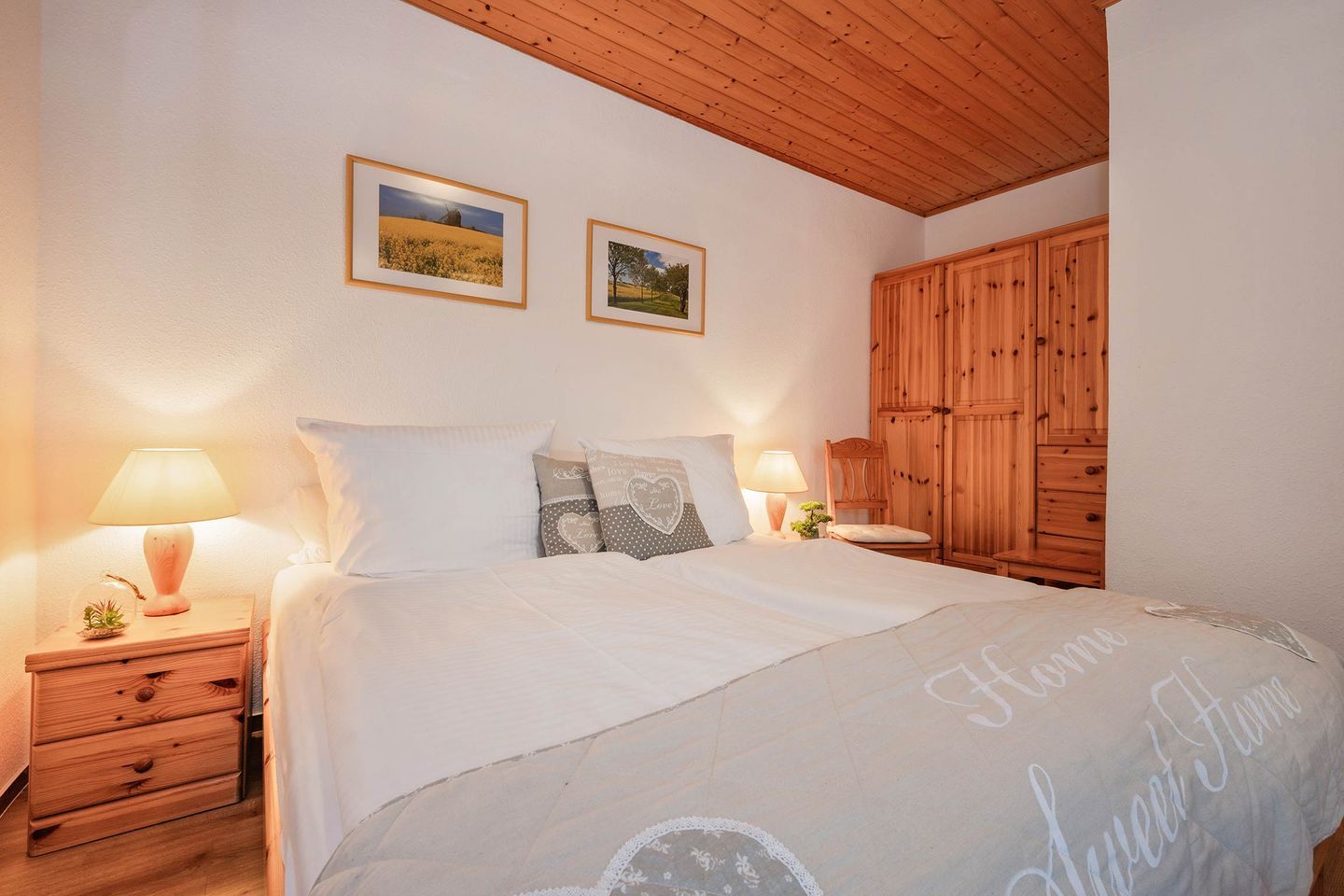 Im Schlafzimmer können Sie dank des gemütlichen Doppelbettes zur Ruhe kommen. Ein Kleiderschrank bietet ausreichenden Stauraum für Ihre Urlaubsgarderobe.