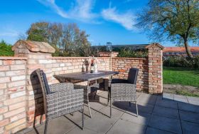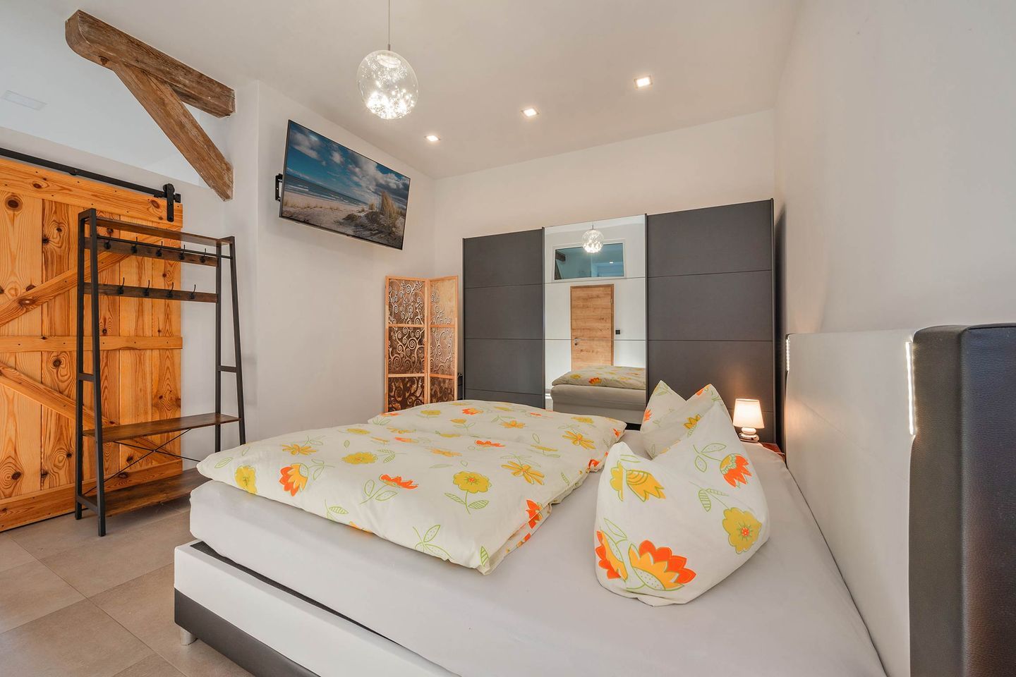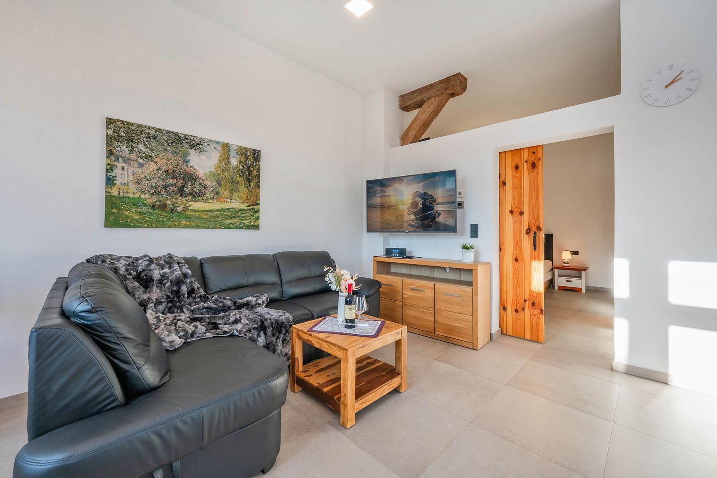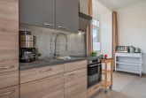 Im dritten Appartement erwartet Sie ein gekonntes Zusammenspiel aus moderner Einrichtung und stilvoll in Szene gesetzten rustikalen Landhausdetails. Der Wohnbereich verfügt über ein ledernes Schlafsofa, ein Sideboard sowie einen Fernseher und die Küchenzeile samt Esstisch. Auf dem bequemen Sofa kann ein Gast nächtigen. Der Schlafbereich wird durch eine charmante Schiebetür vom Wohnraum abgegrenzt. Dahinter werden Sie ein komfortables Boxspringbett, einen Garderobenständer sowie einen Kleiderschrank mit beträchtlichem Stauraum finden. Ein weiterer TV beschert auch vom Bett aus Fernsehvergnügen. Ein freiliegender Deckenbalken trägt als Blickfang zur Gemütlichkeit bei und sorgt neben dem Oberlicht für angenehmen Lichteinfall. Die Küche besitzt einen Induktionsherd mit vier Platten, Backofen, Spülmaschine, Kühlschrank und Mikrowelle. Das moderne Tageslicht-Badezimmer mit Waschbecken, WC und ebenerdiger Regendusche rundet Ihren Aufenthalt ab.