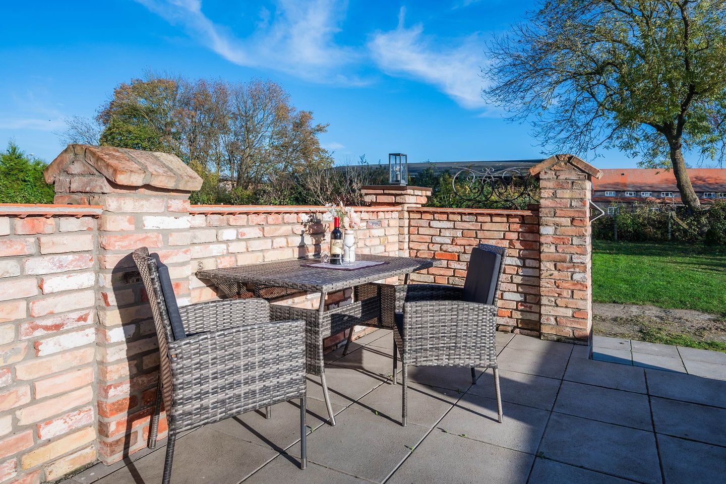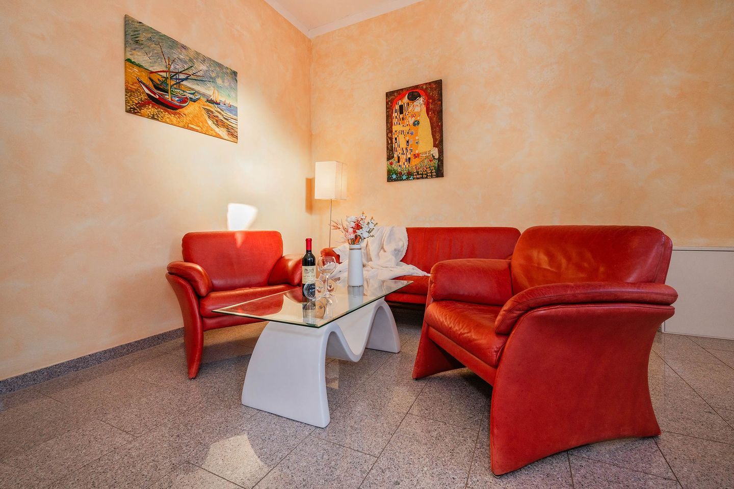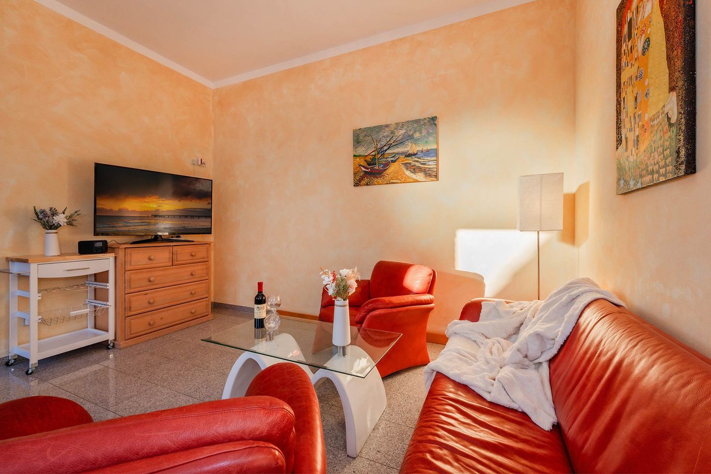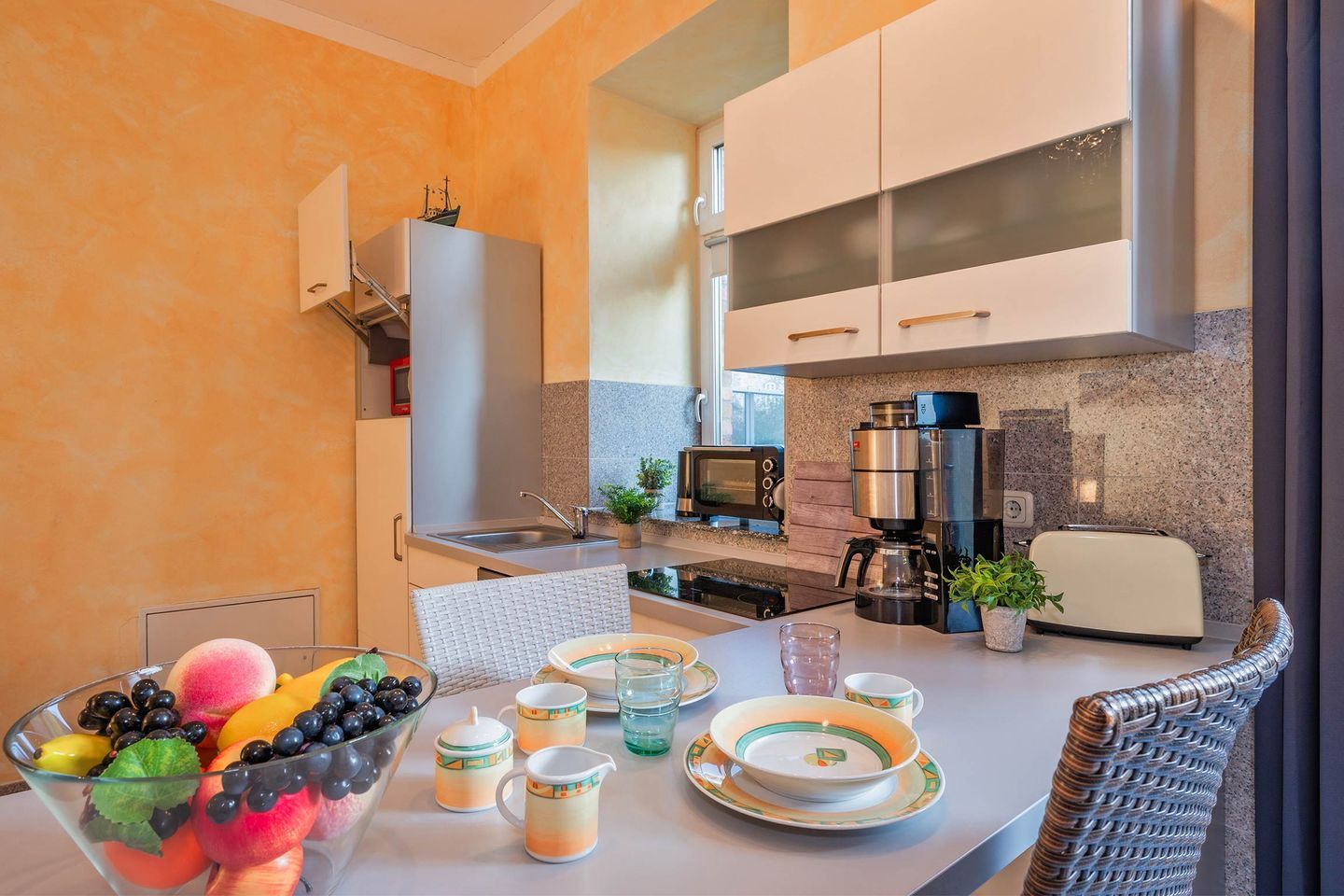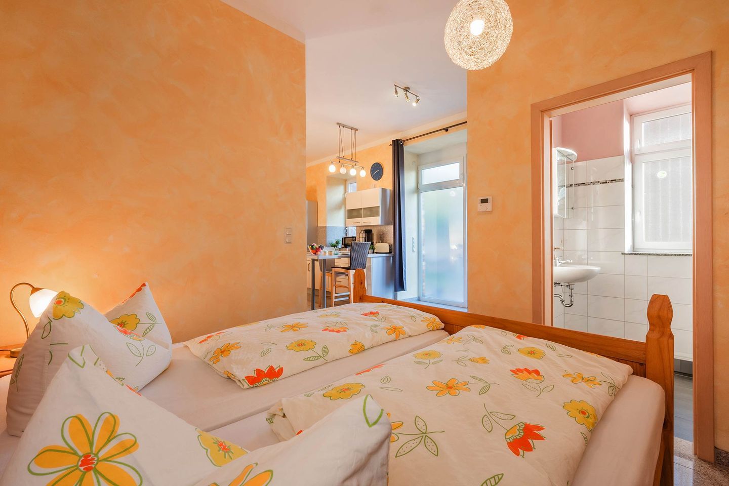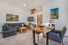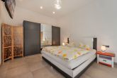 Die zweite Wohnung innerhalb der Einheit ist ein kleineres Ein-Raum-Appartement, welches in warmen, mediterranen Farbtönen gehalten ist. Geschickt aufgeteilt befinden sich im Wohnraum eine Polstergruppe bestehend aus einem Zweisitzer und zwei Sesseln, eine Kommode mit einem Flat-TV sowie ein Radio. Des Weiteren ist eine Küchenzeile mit integriertem Tisch vorhanden. Auf Geräte wie einen Induktionsherd, Geschirrspüler, Kühlschrank, sowie Mikrowelle, Kaffeemaschine, Wasserkocher und Toaster müssen Sie nicht verzichten. Im selben Raum, dennoch klar abgegrenzt, finden Sie ein Doppelbett und Nachttische sowie einen großen Kleiderschrank vor. Das Badezimmer ist mit WC, Waschbecken und Dusche ausgestattet und verfügt über ein Fenster. Die Terrasse liegt unmittelbar vor der Eingangstür.