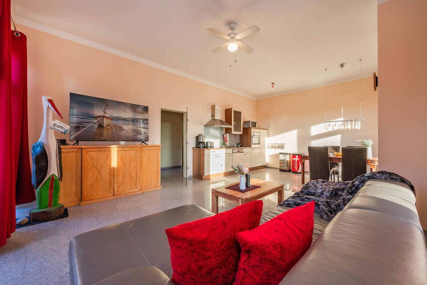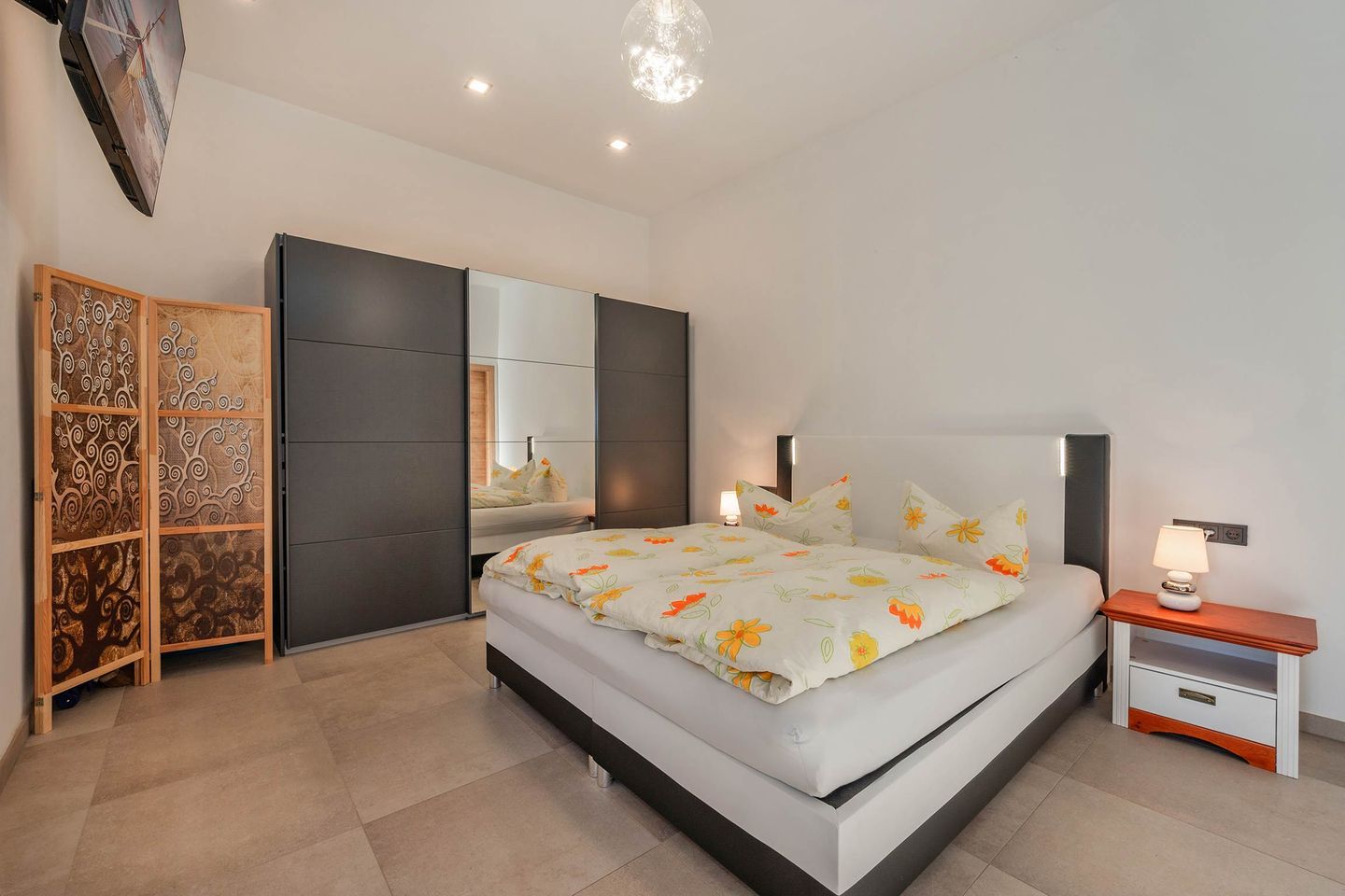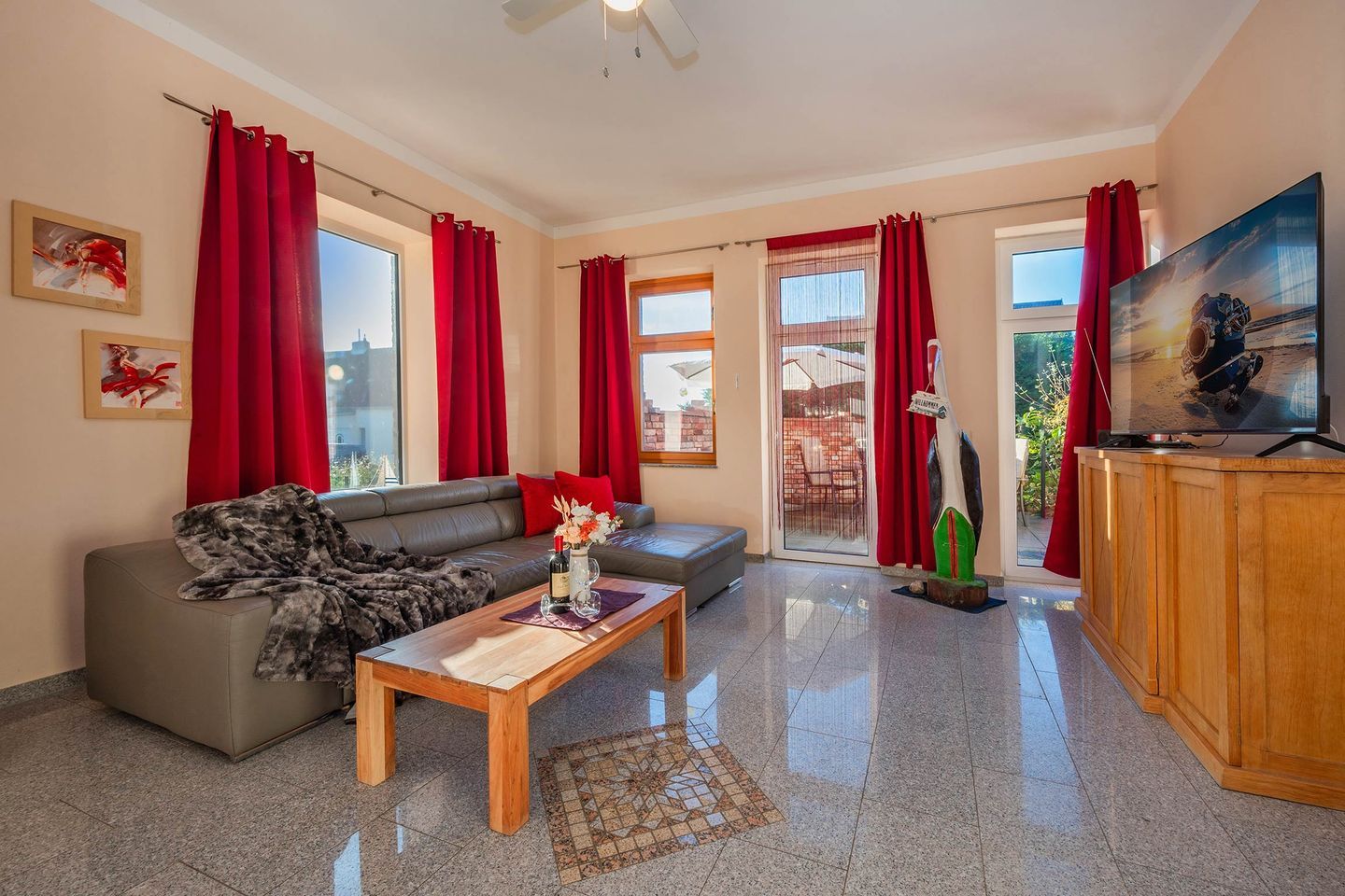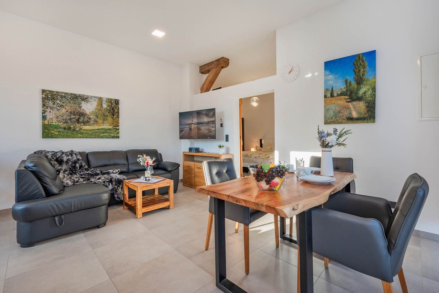 Das Wohnzimmer der ersten Wohneinheit lässt dank vieler großer Fenster den Raum in hellem, natürlichem Licht erstrahlen. Eine gemütliche Ledercouch, sowie ein Sideboard mit Flachbild-Fernseher sind Teil der Räumlichkeit, sowie die Küchenzeile und ein Esstisch mit Bestuhlung. Das Sofa dient, idealerweise für ein Kind, als weitere Schlafmöglichkeit. In der Küche finden Sie relevante Küchengeräte wie ein Ceranfeld mit vier Platten, einen Backofen, Spülmaschine und Kühlschrank. Haushaltsgeräte wie eine hochwertige Filterkaffeemaschine, Wasserkocher, Toaster und Mikrowelle gehören ebenfalls zur Ausstattung. Vom Wohnbereich gelangen Sie auf die zur Wohnung gehörende Terrasse. Das Schlafzimmer wurde in harmonischer Zusammenstellung mit einem Doppelbett (Liegefläche 1,80 x 2,00 Meter), Nachttischen, Fernseher und Kleiderschrank ausgestattet. Das geräumige Badezimmer verfügt über ein WC, Waschbecken samt Spiegelschrank, eine Eckbadewanne und eine ebenerdige Dusche.