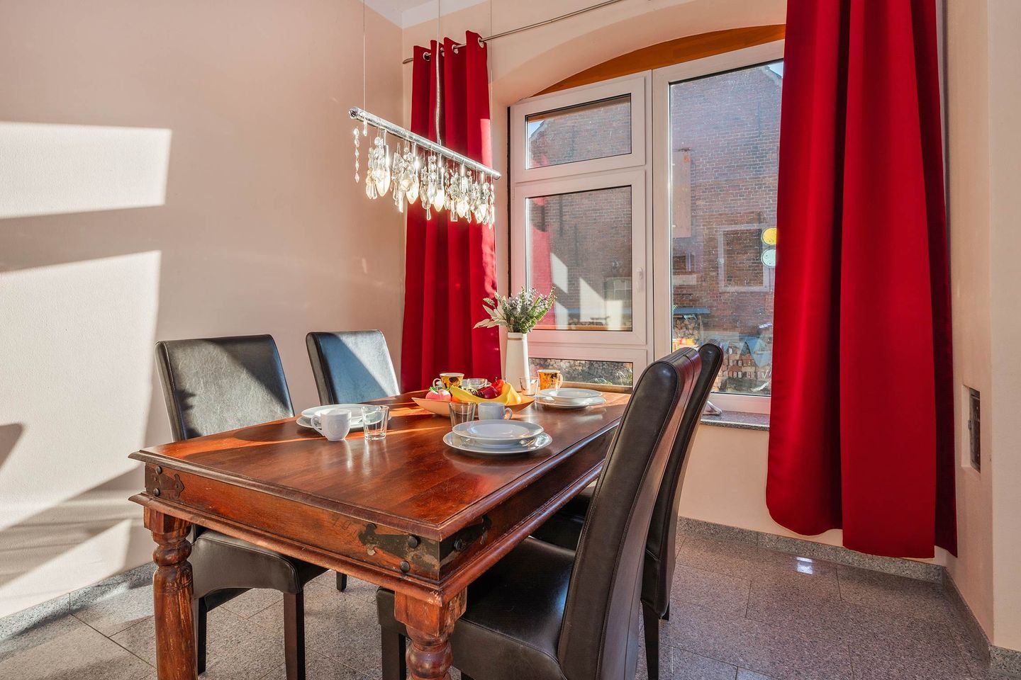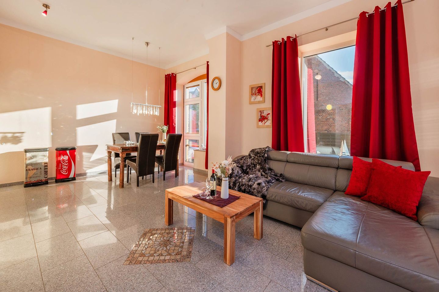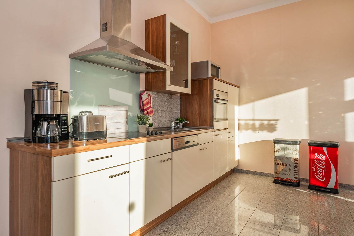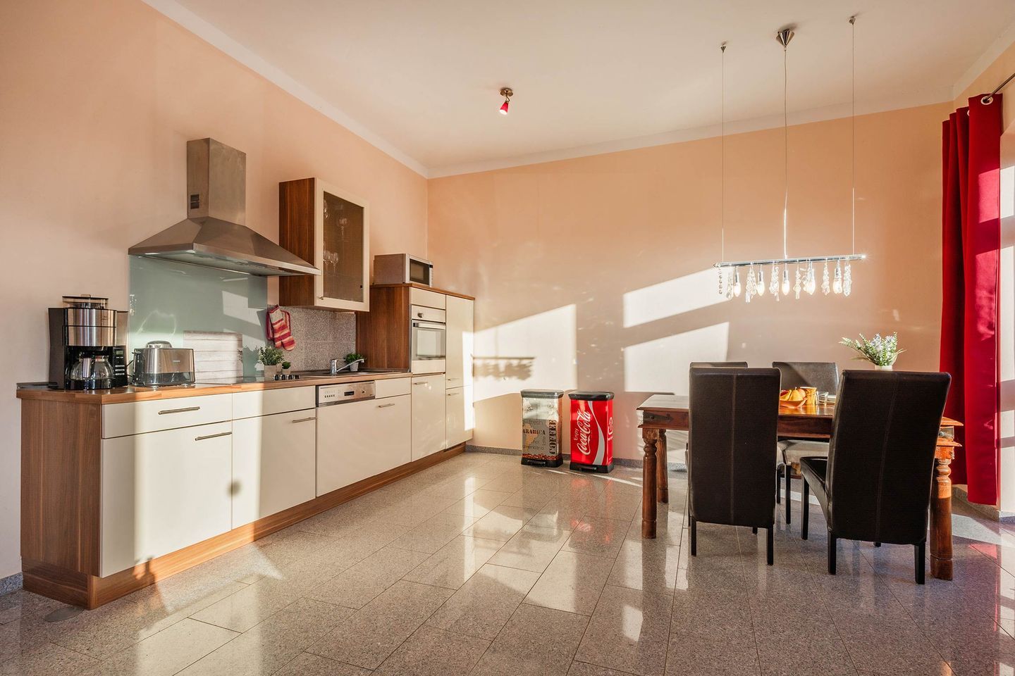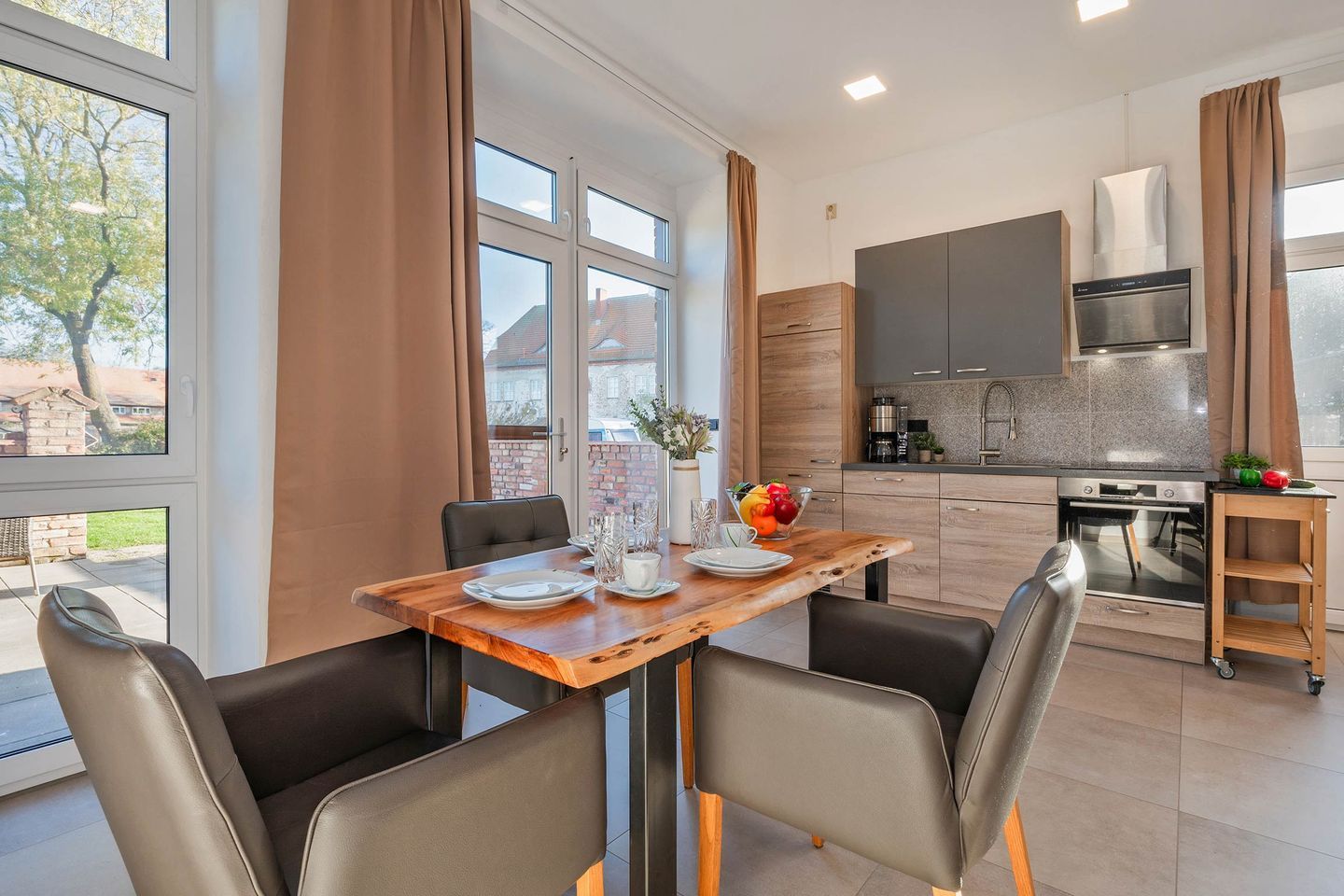 Das Wohnzimmer der ersten Wohneinheit lässt dank vieler großer Fenster den Raum in hellem, natürlichem Licht erstrahlen. Eine gemütliche Ledercouch, sowie ein Sideboard mit Flachbild-Fernseher sind Teil der Räumlichkeit, sowie die Küchenzeile und ein Esstisch mit Bestuhlung. Das Sofa dient, idealerweise für ein Kind, als weitere Schlafmöglichkeit. In der Küche finden Sie relevante Küchengeräte wie ein Ceranfeld mit vier Platten, einen Backofen, Spülmaschine und Kühlschrank. Haushaltsgeräte wie eine hochwertige Filterkaffeemaschine, Wasserkocher, Toaster und Mikrowelle gehören ebenfalls zur Ausstattung. Vom Wohnbereich gelangen Sie auf die zur Wohnung gehörende Terrasse. Das Schlafzimmer wurde in harmonischer Zusammenstellung mit einem Doppelbett (Liegefläche 1,80 x 2,00 Meter), Nachttischen, Fernseher und Kleiderschrank ausgestattet. Das geräumige Badezimmer verfügt über ein WC, Waschbecken samt Spiegelschrank, eine Eckbadewanne und eine ebenerdige Dusche.