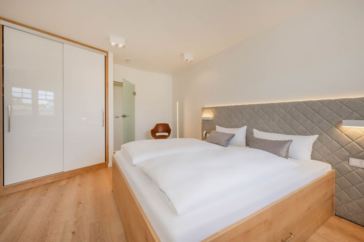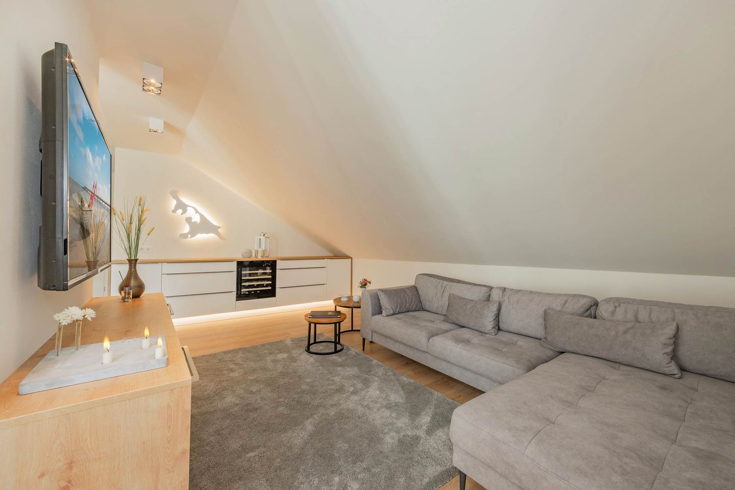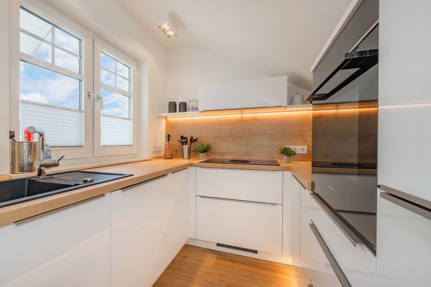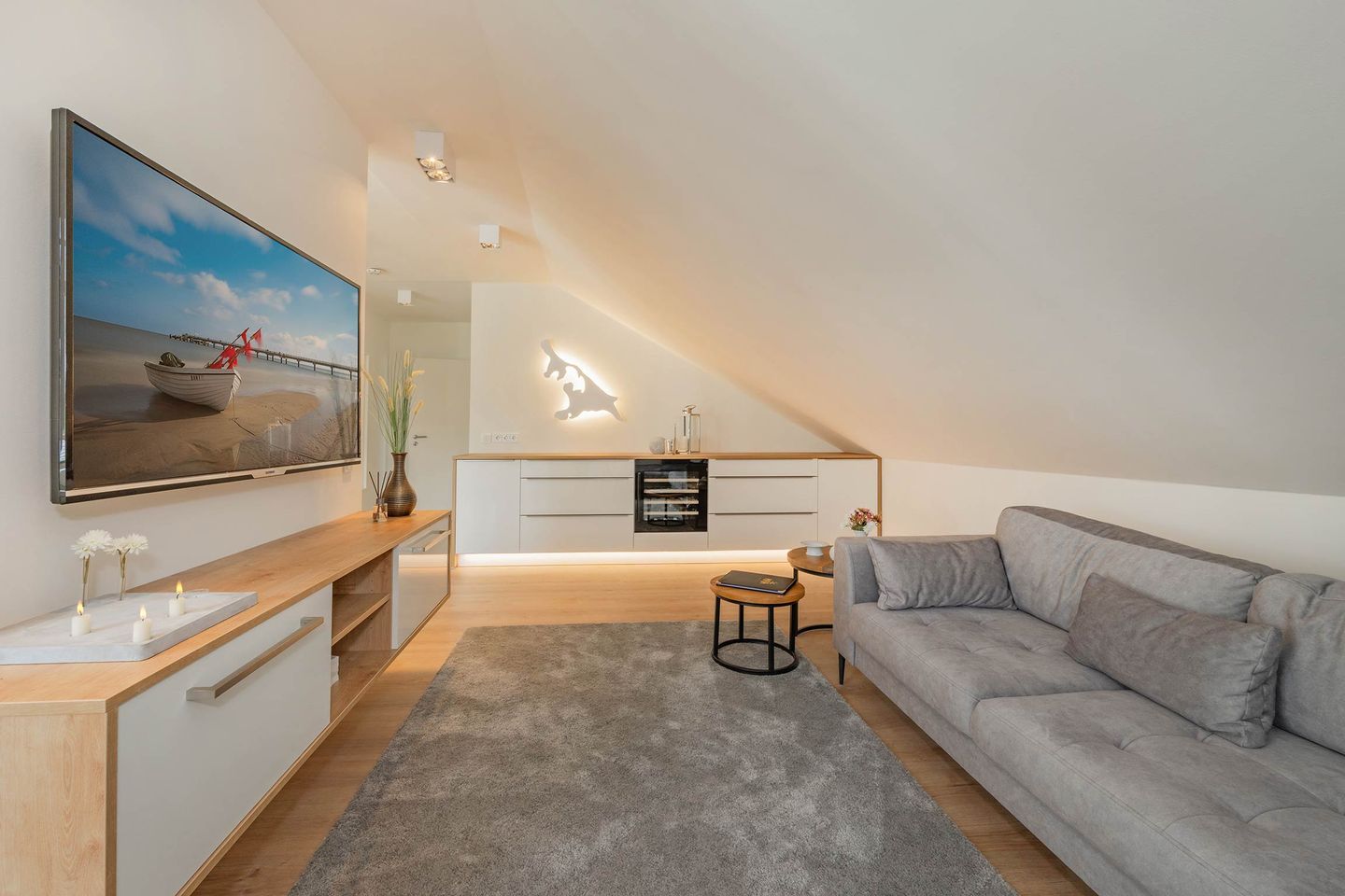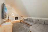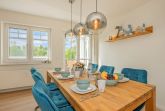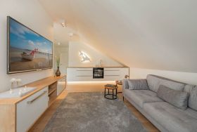 Bei der Einrichtung der 80 Quadratmeter wurde viel Wert darauf gelegt, dass Sie sich direkt wohl und wie zuhause fühlen. Im Wohnraum, der räumlich geschickt durch eine Trennwand vom Essbereich abgegrenzt ist, befindet sich eine gemütliche Couch sowie ein großer Smart-TV, auf dem Sie Netflix und andere, eigene Streamingdienste nutzen können. Die Deckenschrägen wurden perfekt eingearbeitet und sorgen für ein angenehmes Gefühl von Behaglichkeit. Am Esstisch können Sie mit einem ausgiebigen Frühstück in den Tag starten oder am Abend gemeinsame Spieleabende verbringen. Als besondere Annehmlichkeiten erwarten Sie ein Weinkühlschrank und ein Bluetooth-Lautsprecher, sowie Fliegengitter an den Fenstern. Den Balkon mit gemütlicher Bestuhlung erreichen Sie sowohl vom Wohnraum, als auch vom ersten Schlafzimmer. Hier finden Sie bequeme Loungemöbel sowie einen Sonnenschirm. Genießen Sie auf dem Südbalkon die einmalige Sicht auf die umliegenden Grünflächen und den Schloonsee (je nach Jahreszeit kann das Grün der Bäume die Sicht einschränken) bei herrlichem Sonnenschein - Urlaubsfeeling pur! Die separate Küche ist mit allen technischen Geräten ausgestattet und bietet besonders hochwertige Elektrogeräte. Ein Induktionsherd mit Bora-Abzugshaube ist ebenso vorhanden wie eine Mikrowelle, ein Philips Kaffeevollautomat für ganze Bohnen und ein Siemens Backofen. Hier können Sie hervorragend eigene Mahlzeiten zubereiten, sofern Sie nicht jeden Tag außer Haus essen möchten. Für Ihren Komfort ist die Wohnung sowohl mit einem Gäste-WC samt Handtuchtrockner, als auch mit einem Tageslicht-Duschbad mit nahezu ebenerdiger Duschwanne eingerichtet.