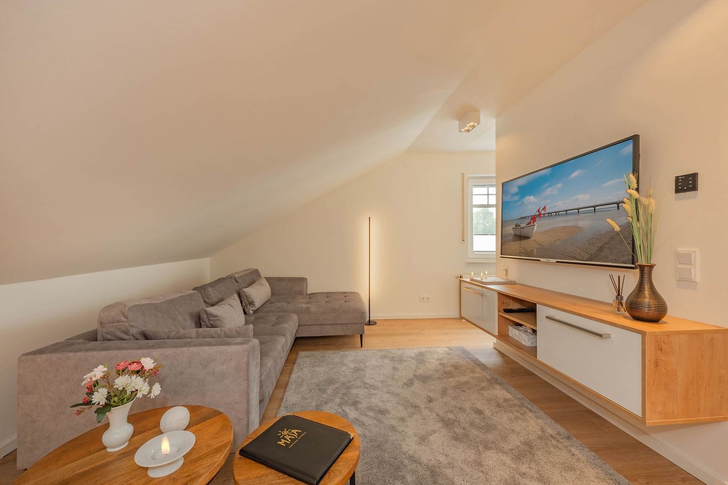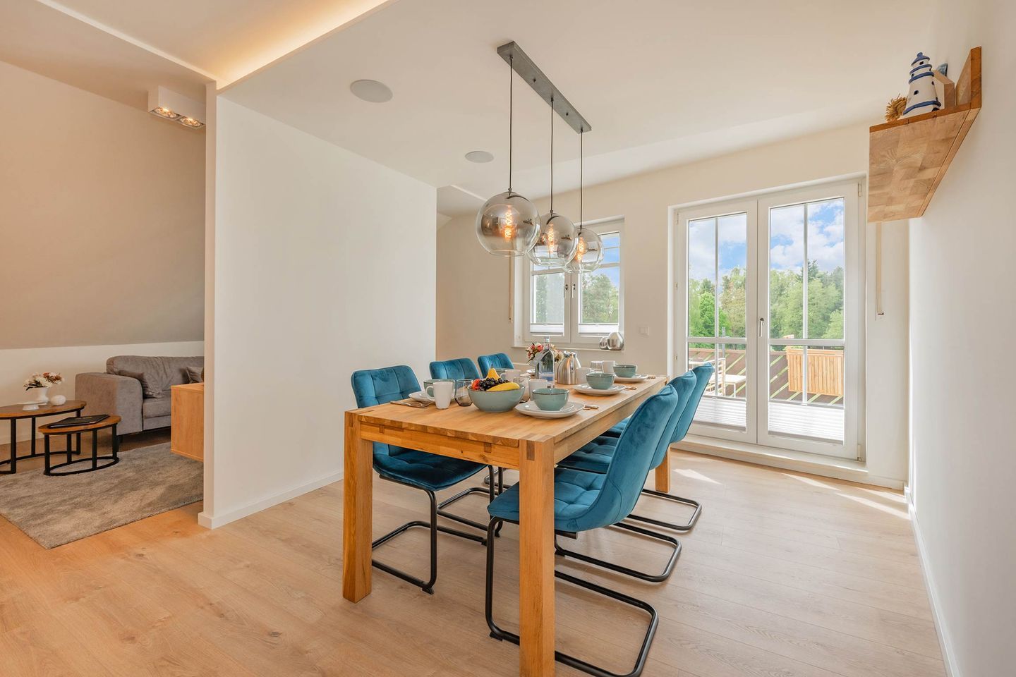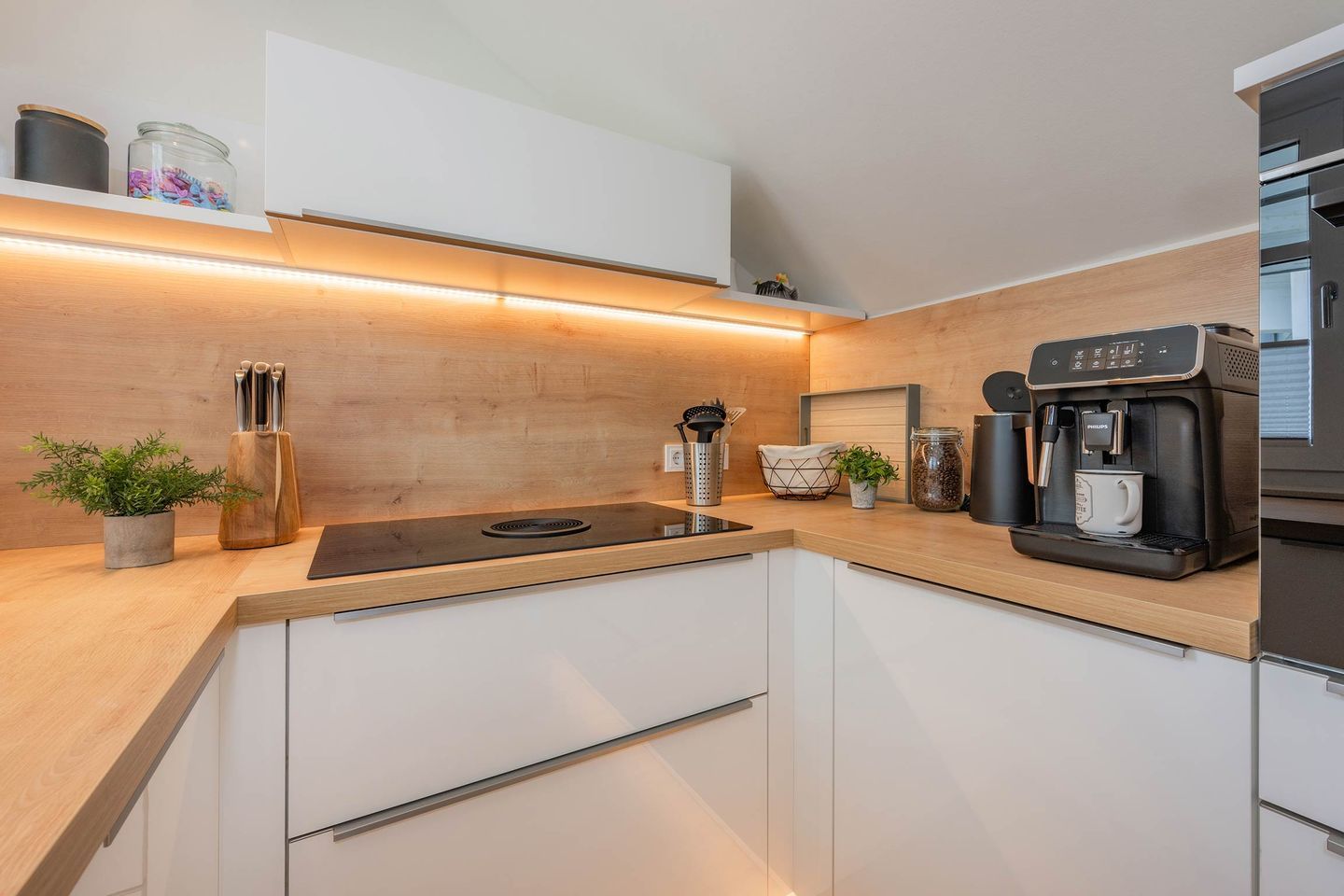 Bei der Einrichtung der 80 Quadratmeter wurde viel Wert darauf gelegt, dass Sie sich direkt wohl und wie zuhause fühlen. Im Wohnraum, der räumlich geschickt durch eine Trennwand vom Essbereich abgegrenzt ist, befindet sich eine gemütliche Couch sowie ein großer Smart-TV, auf dem Sie Netflix und andere, eigene Streamingdienste nutzen können. Die Deckenschrägen wurden perfekt eingearbeitet und sorgen für ein angenehmes Gefühl von Behaglichkeit. Am Esstisch können Sie mit einem ausgiebigen Frühstück in den Tag starten oder am Abend gemeinsame Spieleabende verbringen. Als besondere Annehmlichkeiten erwarten Sie ein Weinkühlschrank und ein Bluetooth-Lautsprecher, sowie Fliegengitter an den Fenstern. Den Balkon mit gemütlicher Bestuhlung erreichen Sie sowohl vom Wohnraum, als auch vom ersten Schlafzimmer. Hier finden Sie bequeme Loungemöbel sowie einen Sonnenschirm. Genießen Sie auf dem Südbalkon die einmalige Sicht auf die umliegenden Grünflächen und den Schloonsee (je nach Jahreszeit kann das Grün der Bäume die Sicht einschränken) bei herrlichem Sonnenschein - Urlaubsfeeling pur! Die separate Küche ist mit allen technischen Geräten ausgestattet und bietet besonders hochwertige Elektrogeräte. Ein Induktionsherd mit Bora-Abzugshaube ist ebenso vorhanden wie eine Mikrowelle, ein Philips Kaffeevollautomat für ganze Bohnen und ein Siemens Backofen. Hier können Sie hervorragend eigene Mahlzeiten zubereiten, sofern Sie nicht jeden Tag außer Haus essen möchten. Für Ihren Komfort ist die Wohnung sowohl mit einem Gäste-WC samt Handtuchtrockner, als auch mit einem Tageslicht-Duschbad mit nahezu ebenerdiger Duschwanne eingerichtet.