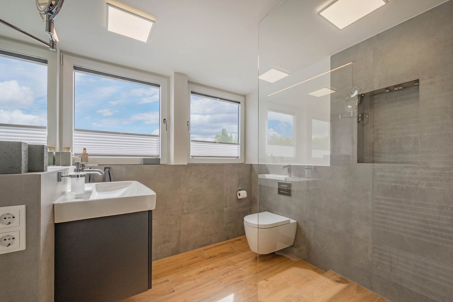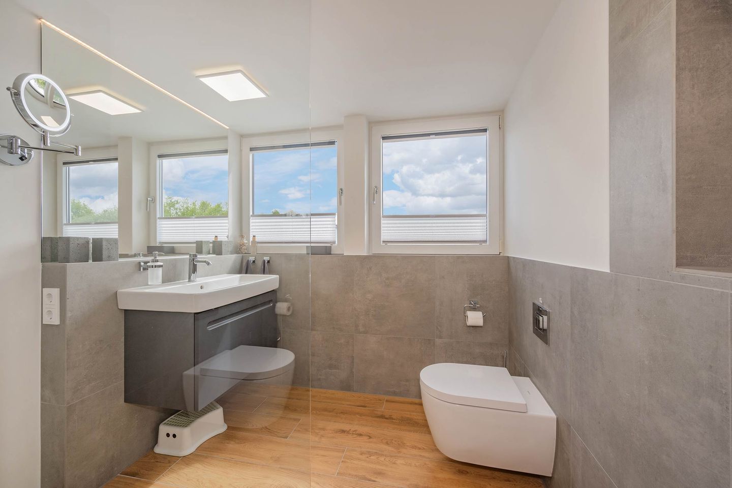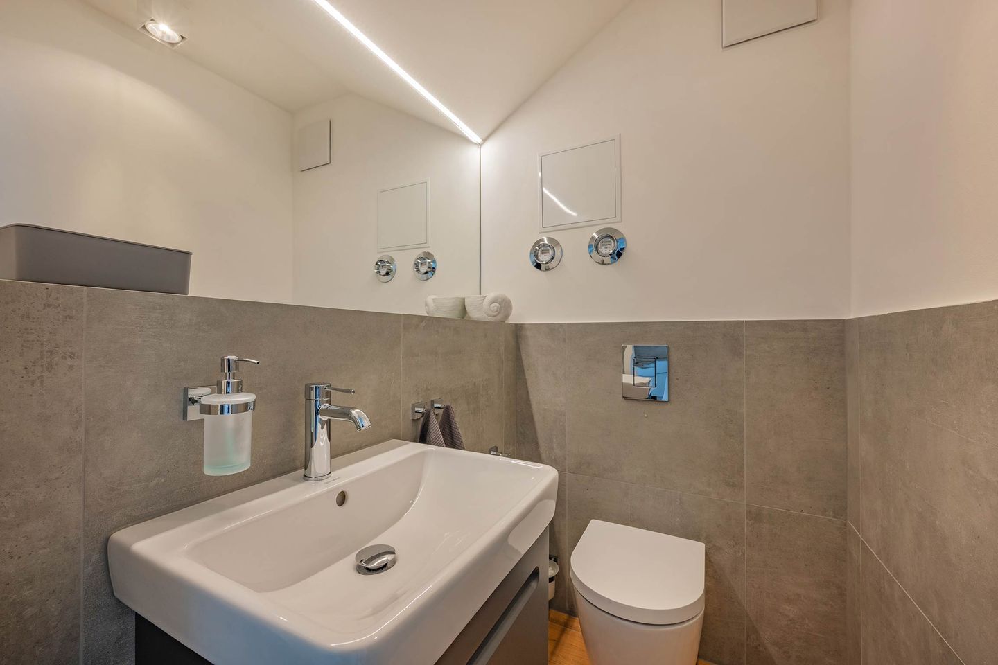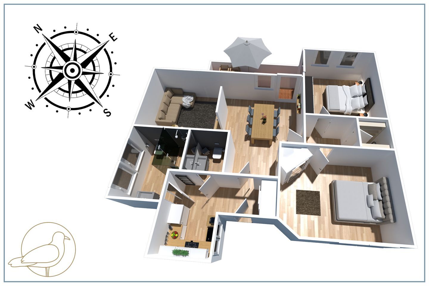 Bei der Einrichtung der 80 Quadratmeter wurde viel Wert darauf gelegt, dass Sie sich direkt wohl und wie zuhause fühlen. Im Wohnraum, der räumlich geschickt durch eine Trennwand vom Essbereich abgegrenzt ist, befindet sich eine gemütliche Couch sowie ein großer Smart-TV, auf dem Sie Netflix und andere, eigene Streamingdienste nutzen können. Die Deckenschrägen wurden perfekt eingearbeitet und sorgen für ein angenehmes Gefühl von Behaglichkeit. Am Esstisch können Sie mit einem ausgiebigen Frühstück in den Tag starten oder am Abend gemeinsame Spieleabende verbringen. Als besondere Annehmlichkeiten erwarten Sie ein Weinkühlschrank und ein Bluetooth-Lautsprecher, sowie Fliegengitter an den Fenstern. Den Balkon mit gemütlicher Bestuhlung erreichen Sie sowohl vom Wohnraum, als auch vom ersten Schlafzimmer. Hier finden Sie bequeme Loungemöbel sowie einen Sonnenschirm. Genießen Sie auf dem Südbalkon die einmalige Sicht auf die umliegenden Grünflächen und den Schloonsee (je nach Jahreszeit kann das Grün der Bäume die Sicht einschränken) bei herrlichem Sonnenschein - Urlaubsfeeling pur! Die separate Küche ist mit allen technischen Geräten ausgestattet und bietet besonders hochwertige Elektrogeräte. Ein Induktionsherd mit Bora-Abzugshaube ist ebenso vorhanden wie eine Mikrowelle, ein Philips Kaffeevollautomat für ganze Bohnen und ein Siemens Backofen. Hier können Sie hervorragend eigene Mahlzeiten zubereiten, sofern Sie nicht jeden Tag außer Haus essen möchten. Für Ihren Komfort ist die Wohnung sowohl mit einem Gäste-WC samt Handtuchtrockner, als auch mit einem Tageslicht-Duschbad mit nahezu ebenerdiger Duschwanne eingerichtet.