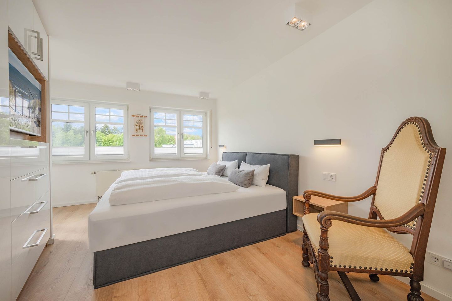 Idealerweise nutzen vier Gäste die Wohnung, welche komfortabel in den beiden Schlafräumen übernachten können. Das größere Schlafzimmer verfügt über einen Einbau-Kleiderschrank mit integriertem Safe und einen weiteren TV. Das Boxspring-Doppelbett bietet eine Liegefläche von 2,00 x 2,00 Metern. Das zweite Schlafzimmer ist mit einem Doppelbett (Liegefläche 1,80 x 2,00 Meter) sowie einem Kleiderschrank ausgestattet. Zur Verdunklung und für besonders erholsamen Schlaf können Sie die Außenjalousien in allen Wohnräumen herunterlassen.