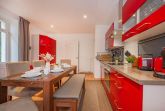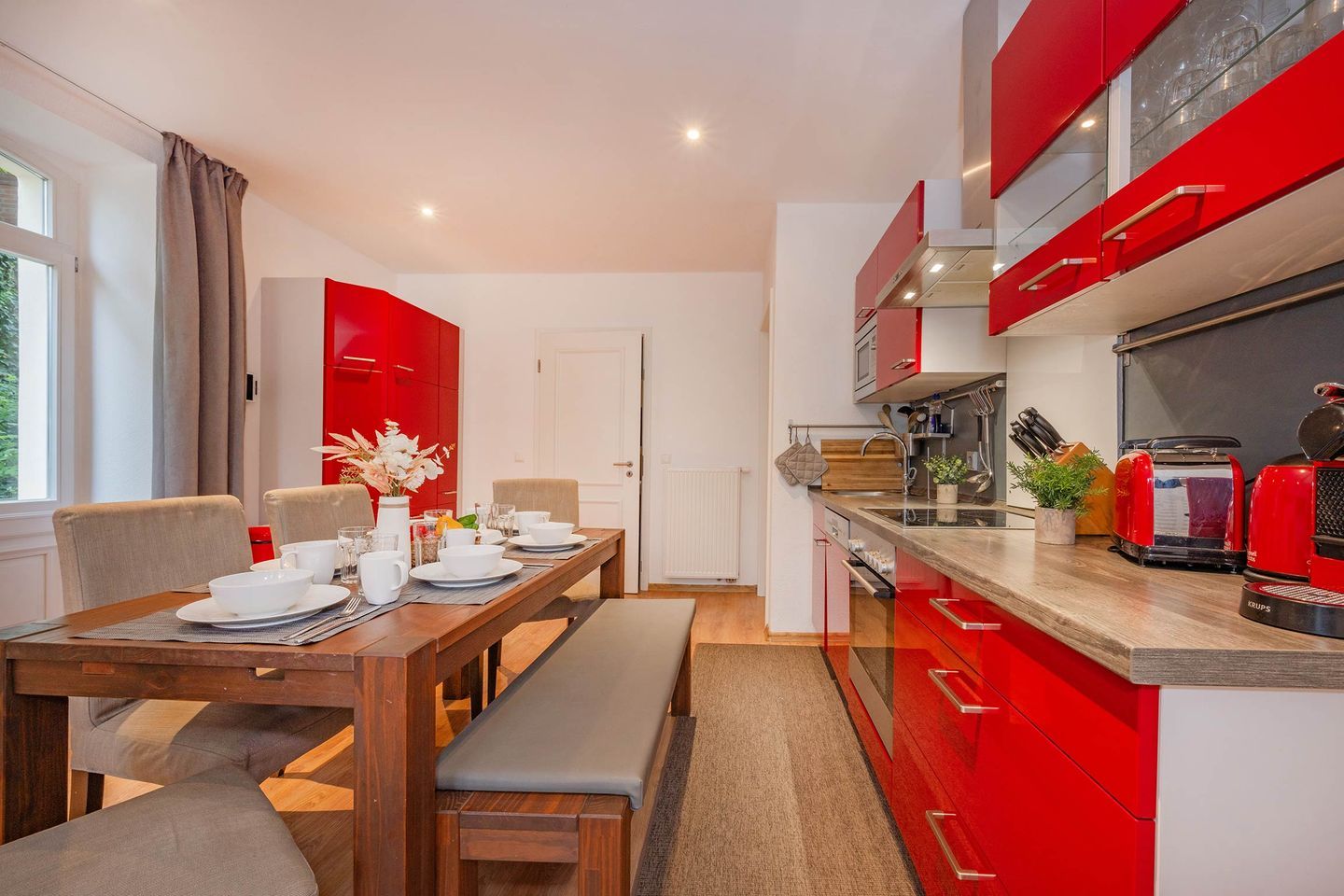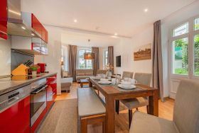 In der geräumigen Erdgeschosswohnung finden bis zu 6 Personen (davon zwei Kinder) ein strandnahes und hochwertig eingerichtetes Urlaubsdomizil. Auch Ihr Haustier ist hier ein gern gesehener Gast. Sicher werden Sie sich sofort in die moderne, geschmackvolle Einrichtung verlieben. Der Wohnbereich verfügt über eine Wohnlandschaft bestehend aus zwei Sofas mit Schlaffunktion und einen großen Smart-TV. Lassen Sie den Tag bei einem gemütlichen Filmeabend ausklingen oder nutzen Sie bekannte Streamingdienste wie Netflix oder Amazon-Prime mit Ihren Login-Daten, um den perfekten Film zu finden. Bevor Sie sich jedoch dazu entschließen, lädt die offene Küchenzeile zu einem ausgiebigen Kocherlebnis ein. Bereiten Sie hauseigene Gerichte - dank vieler hilfreicher Küchengeräte - zu, und genießen Sie die Mahlzeit mit der ganzen Familie am großen Esstisch. Neben den unverzichtbaren Haushaltsgeräten befinden sich zusätzlich noch eine Nespresso-Maschine, ein Dampfgarer, Zerkleinerer und eine elektrische Saftpresse im Kücheninventar.