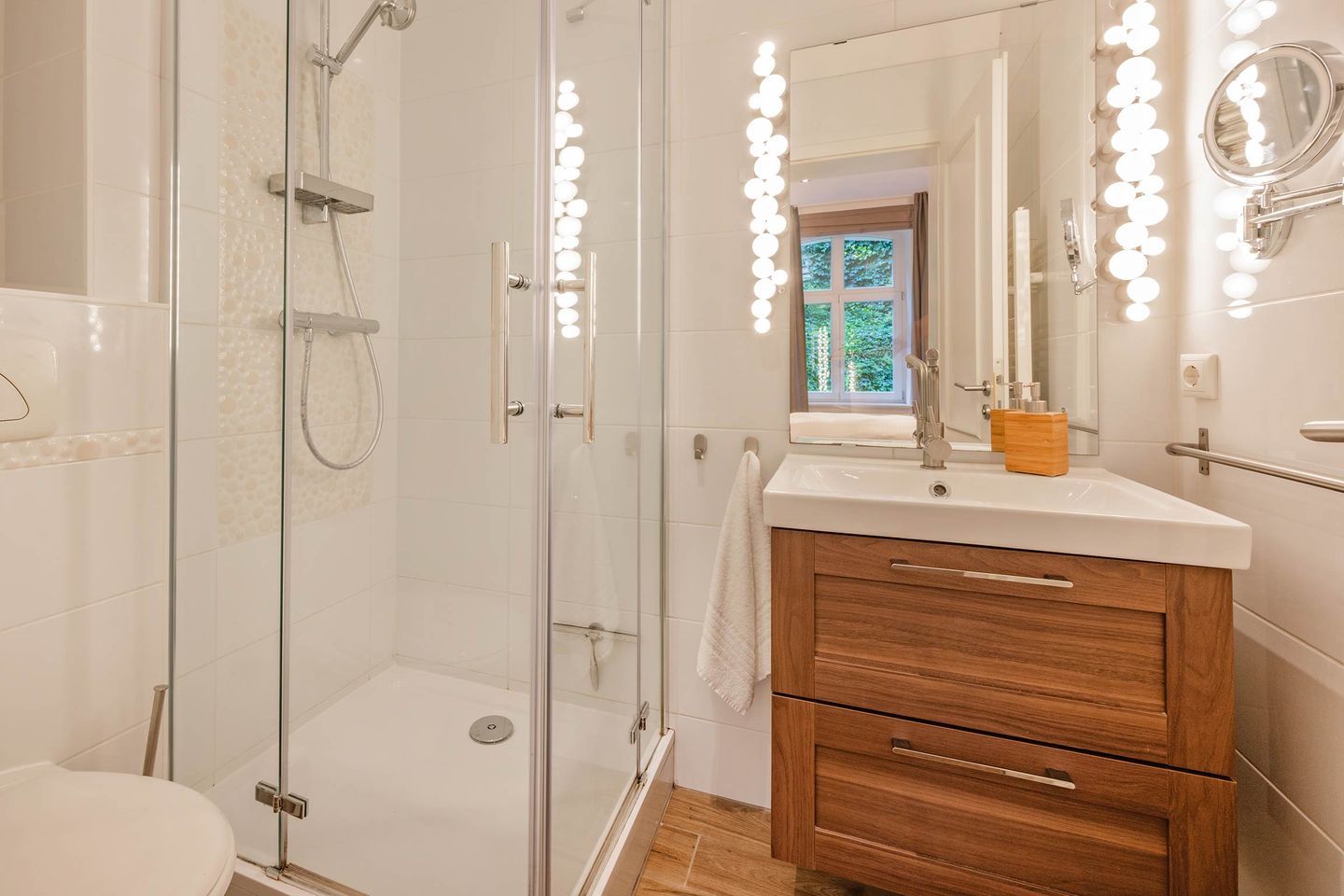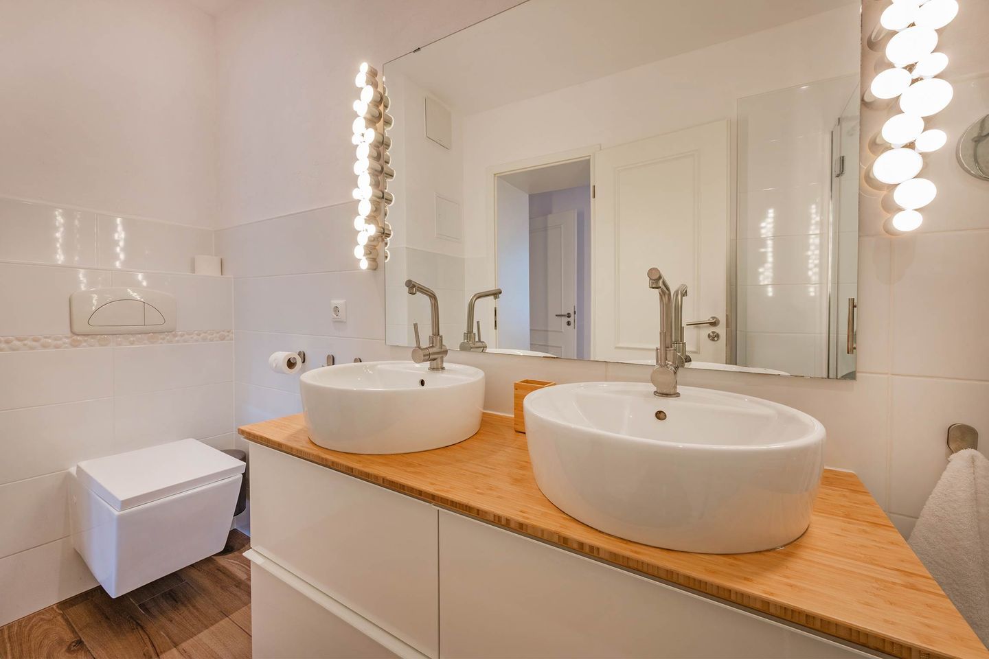 Die Badezimmer sind mit Waschbecken, WC, Dusche und einer Handtuchheizung eingerichtet. Im ersten Bad werden Sie zusätzlich einen zweiten Waschplatz und eine Regendusche vorfinden.