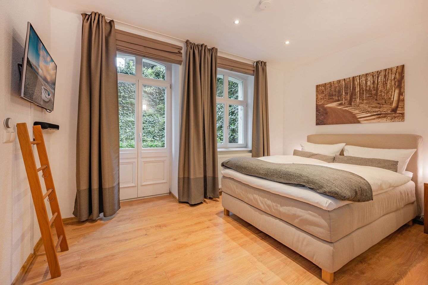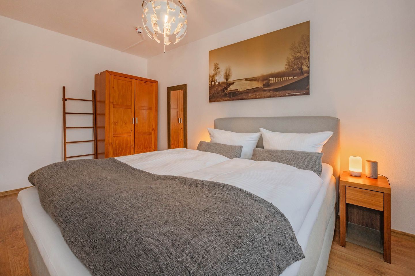 Besonderen Komfort verschaffen Ihnen die Boxspringbetten der beiden Schlafzimmer. Jeweils ein vollwertiges Badezimmer grenzt an die Schlafräume an. Im ersten Schlafzimmer werden Sie neben dem Bett (Liegefläche 1,60 x 2,00 Meter), auch einen Kleiderschrank und einen TV vorfinden. Auch im zweiten Schlafzimmer müssen Sie neben dem Bett (Liegefläche 1,40 x 2,00 Meter) nicht auf einen weiteren Fernseher verzichten. Als kleines Highlight erwartet Sie im zweiten Schlafzimmer ein begehbarer Kleiderschrank. Für guten Schlaf sorgen die Verdunklungsmöglichkeiten in allen Räumen.