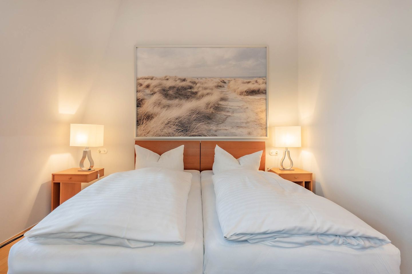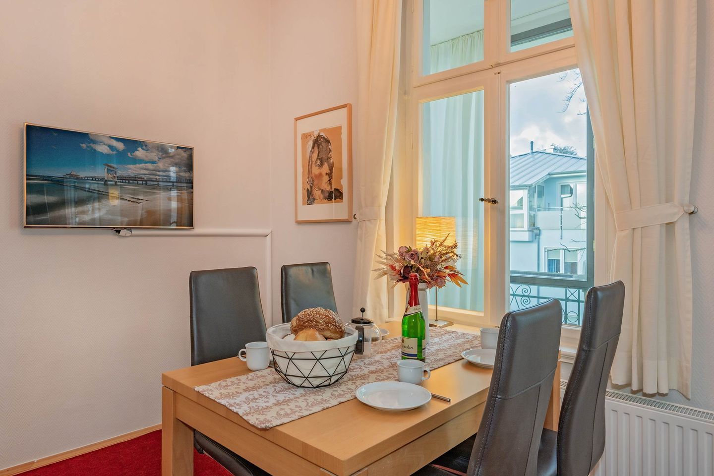 Das geräumige Schlafzimmer lädt mit einem komfortablen Doppelbett zum Träumen ein. Für Unterhaltung sorgen gleich zwei TV-Geräte, eines im Schlafzimmer und eines im Wohnzimmer. Der lichtdurchflutete Wohnbereich mit Zugang zur Loggia bietet den perfekten Ort, um zu entspannen. Hier erwartet Sie ein fantastischer Panoramablick über das Seebad Heringsdorf bis zur Ostsee – ein Highlight, das diesen Urlaub unvergesslich macht.