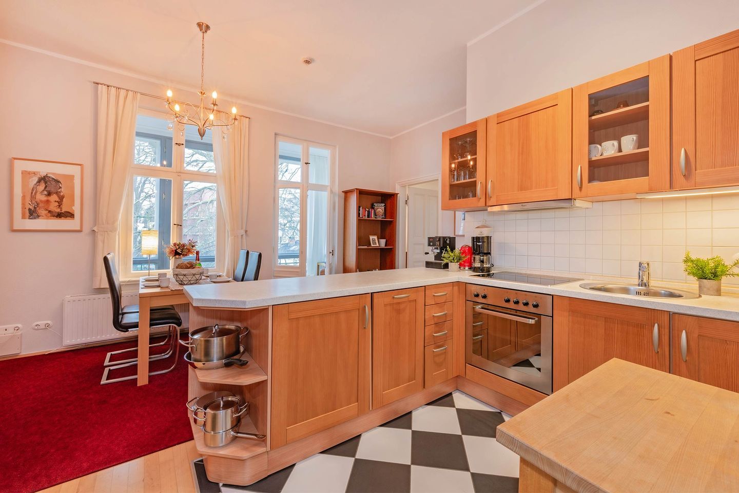 Die offene Küche ist voll ausgestattet mit Backofen, Ceranfeld, Spülmaschine und allem, was Sie für die Zubereitung Ihrer Lieblingsgerichte benötigen. Der angrenzende Essbereich lädt dazu ein, gemeinsame Mahlzeiten in stilvollem Ambiente zu genießen.