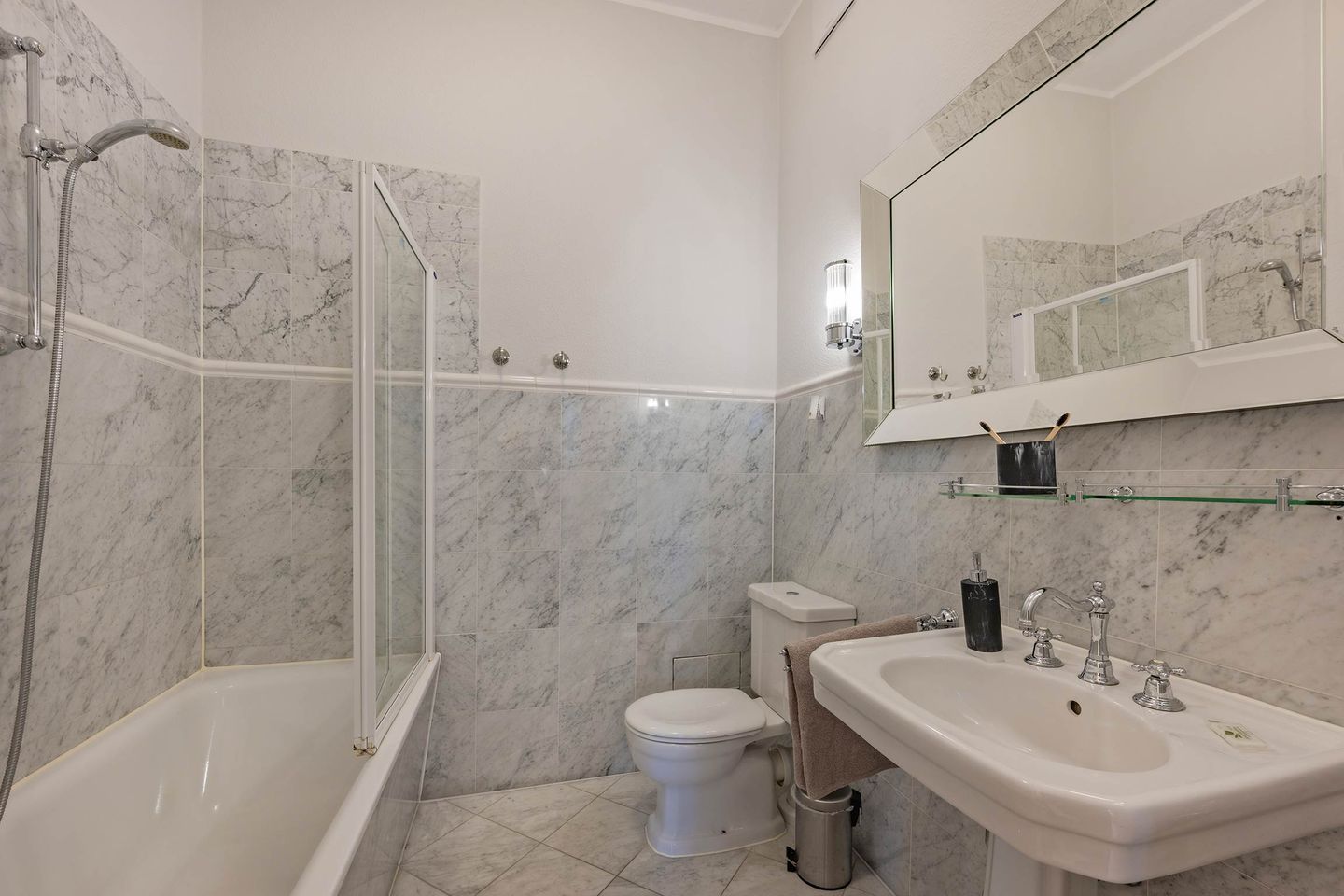 Das moderne Badezimmer besticht durch seine hochwertige Ausstattung: Es bietet eine Badewanne, die zum Relaxen einlädt und außerdem über eine Duschmöglichkeit verfügt. Ein großer Spiegel sorgt für zusätzlichen Komfort.