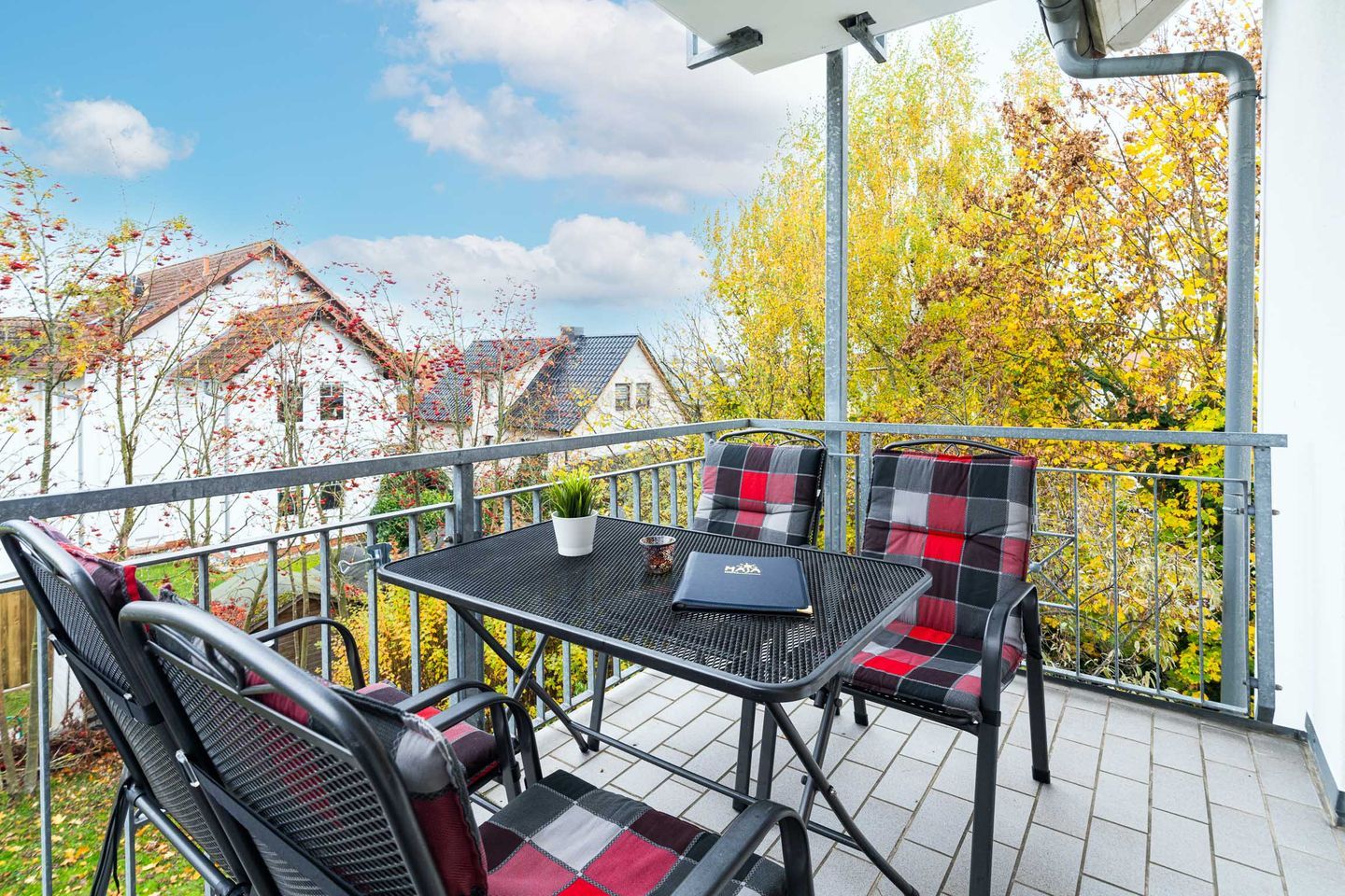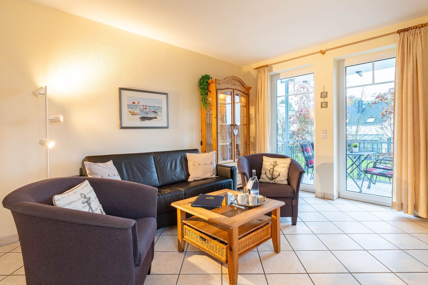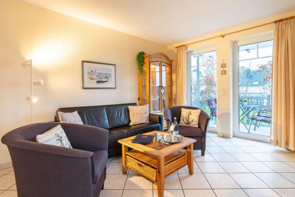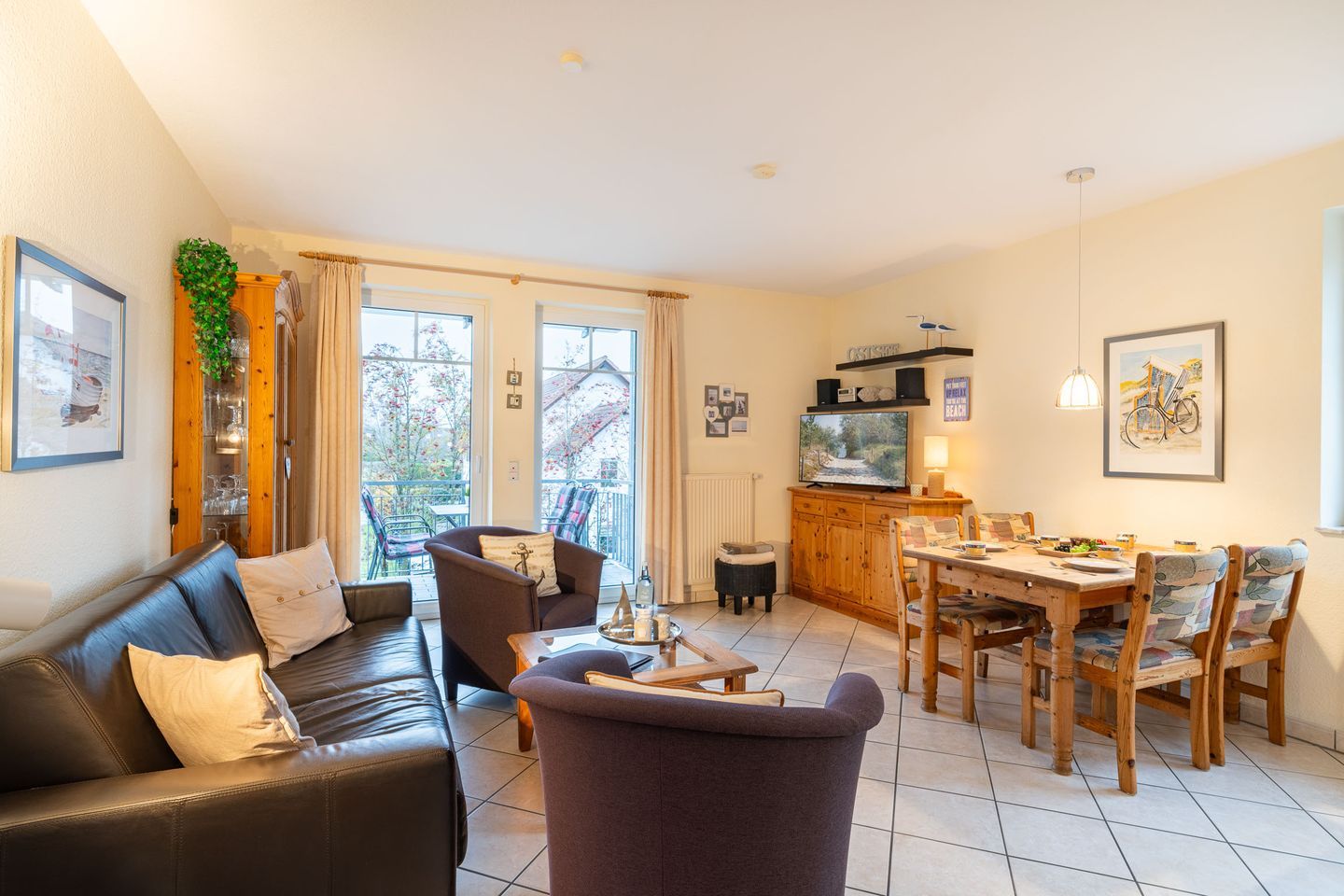 Der kombinierte, gemütliche Wohnbereich ist ausgestattet mit einem Ledersofa, Sessel, einen Flat-TV und einem Essbereich für vier Personen. Von hier aus betreten Sie Ihren möblierten Balkon zur Südseite. Genießen Sie hier die warmen Sonnenstrahlen auf der Haut bei einem nachmittäglichen Kaffee.