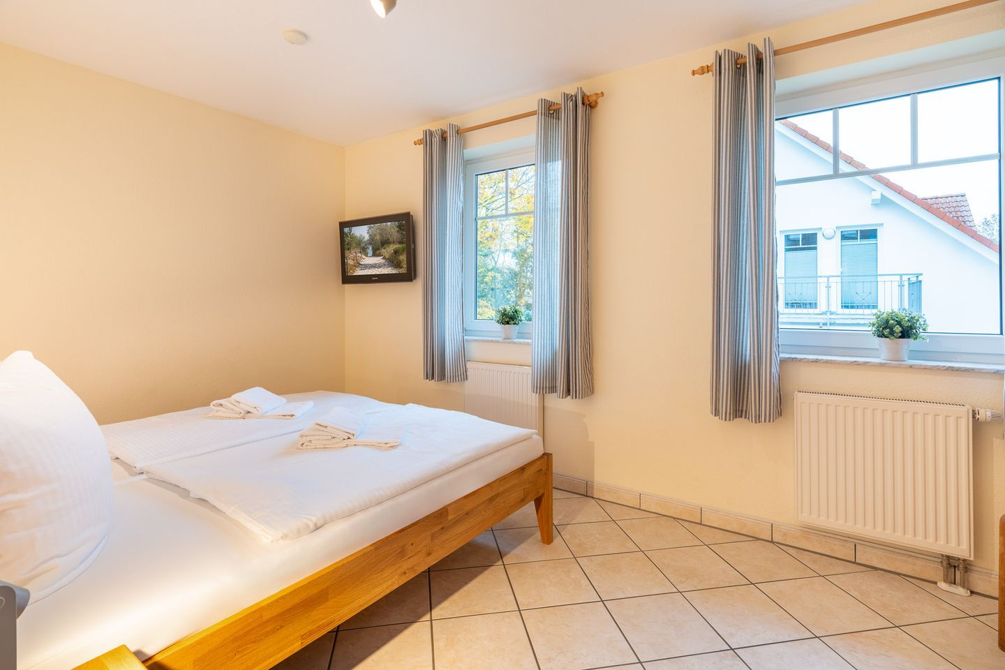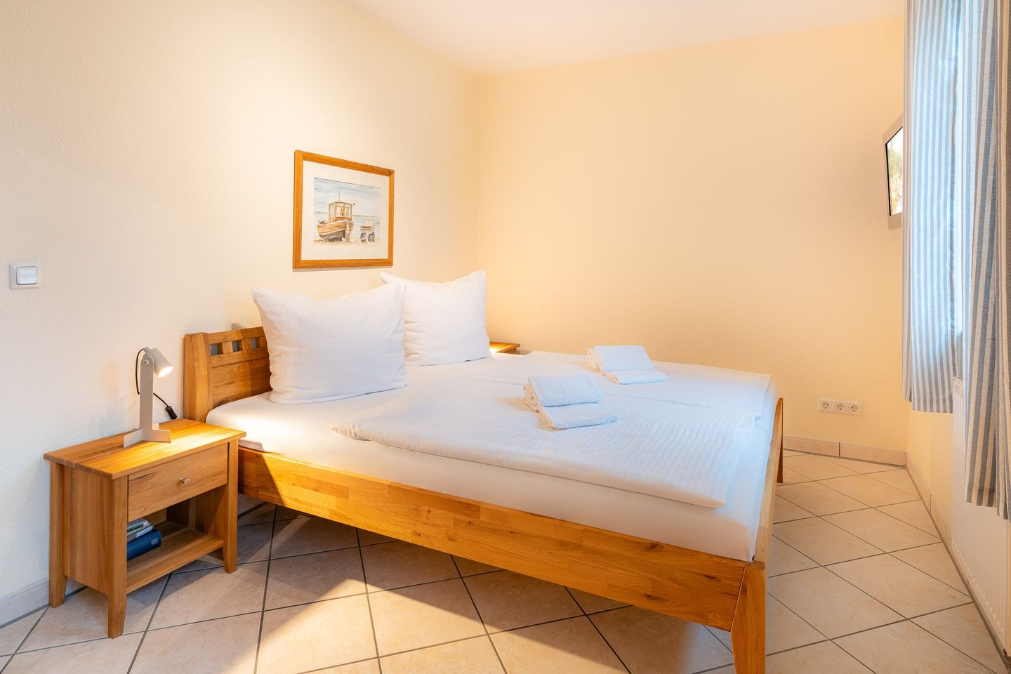 Beide Schlafzimmer sind mit jeweils einem großen Doppelbett und einem Kleiderschrank versehen. Außerdem werden Sie in beiden Räumen ebenfalls Fernseher entdecken. Das tageslichthelle Badezimmer verfügt über WC, Waschbecken und einer Dusche. Ausreichend Ablagefläche für Ihre wichtigsten Hygieneartikel ist ebenfalls vorhanden. Bis zu zwei weitere Personen - idealerweise Kinder - können auf der Schlafcouch im Wohnzimmer übernachten.