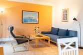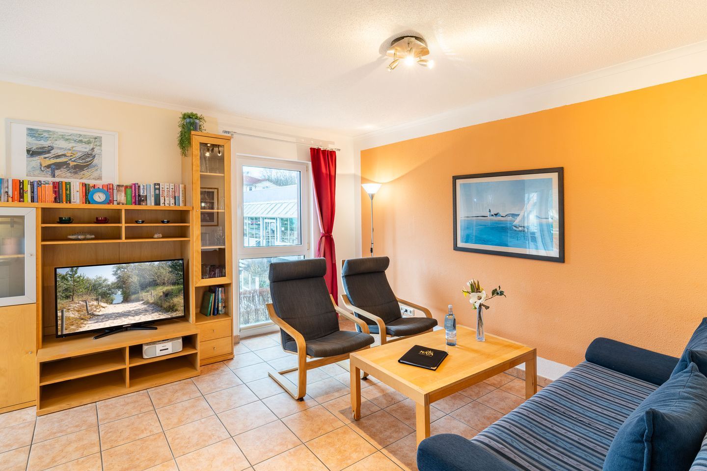 Der angrenzende Wohnbereich lädt mit einem gemütlichen Sitzbereich und einem TV-Gerät zum Entspannen ein. Von hier aus haben Sie Zugang zum Balkon, der Ihnen einen ruhigen Rückzugsort bietet, um die frische Meeresluft zu genießen.