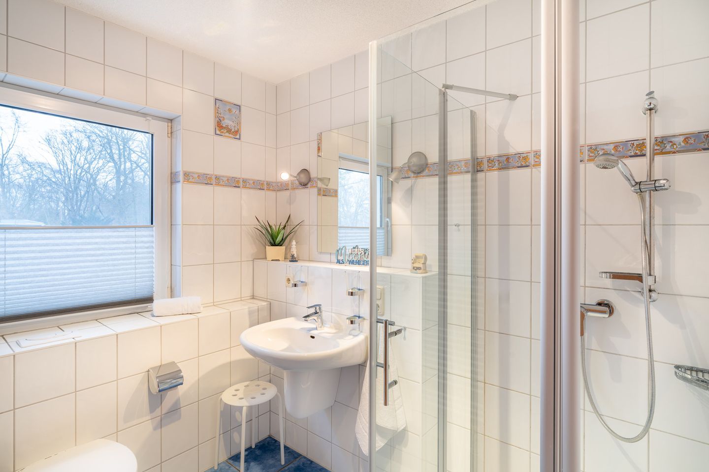 Das Badezimmer ist modern ausgestattet und verfügt über eine Dusche, ein Fenster und einen großen Spiegel. Wer während des Aufenthalts Wäsche waschen möchte, findet im Haus eine Waschmaschine und einen Trockner (gegen Gebühr). Ein eigener Stellplatz sorgt dafür, dass Ihr Auto sicher und komfortabel abgestellt werden kann.