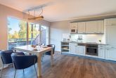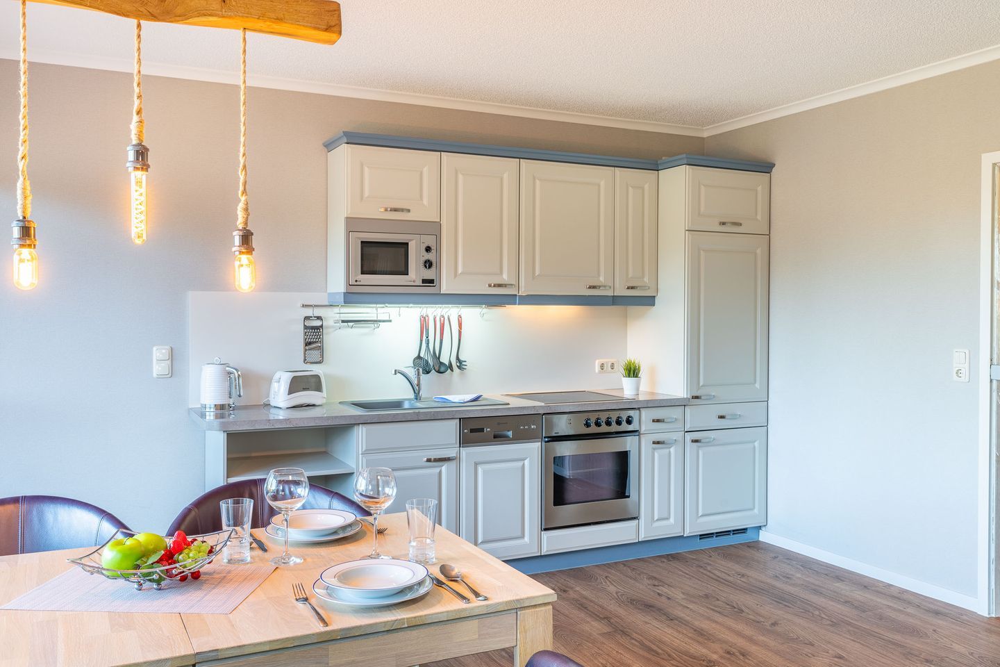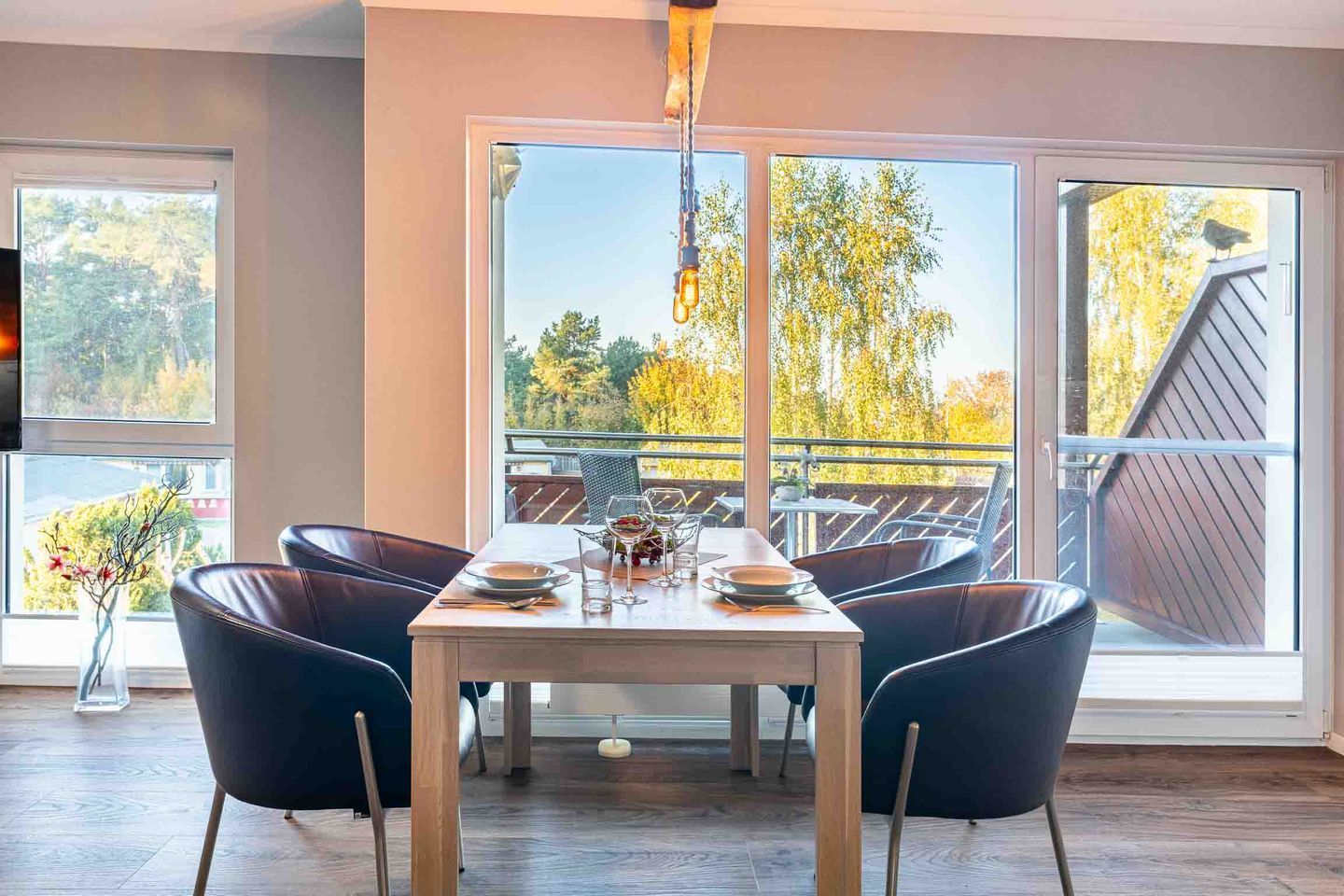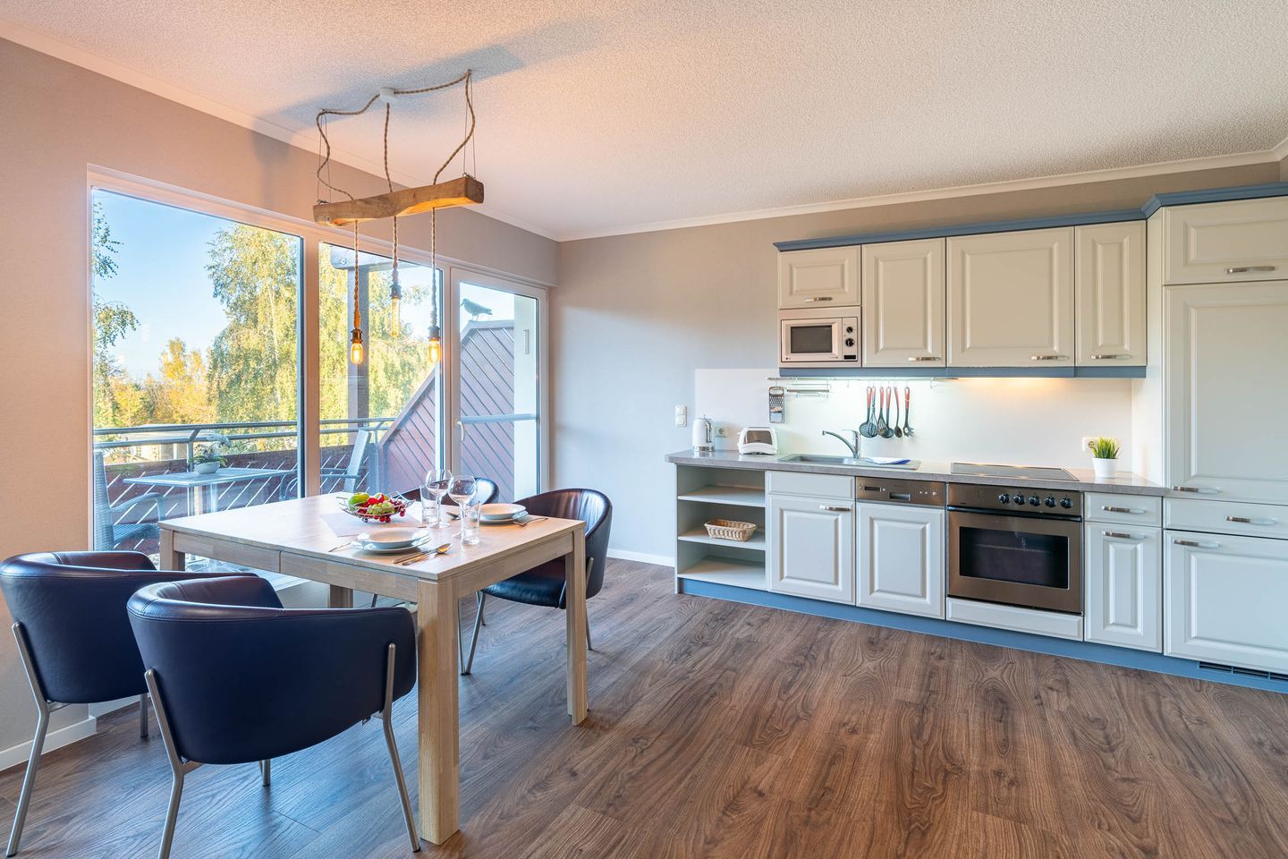 Der offene Wohn- und Küchenbereich schafft eine einladende Atmosphäre und lädt zu gemeinsamen Stunden ein. Die voll ausgestattete Küche verfügt über alle wichtigen Geräte wie Backofen, Spülmaschine, Ceranfeld und Mikrowelle. Hier können Sie nach Herzenslust kochen und Ihre Mahlzeiten genießen. Vom Wohnbereich aus gelangen Sie direkt auf den Balkon, wo Sie die frische Ostseeluft genießen können – perfekt für ein entspanntes Frühstück oder einen gemütlichen Ausklang des Tages.