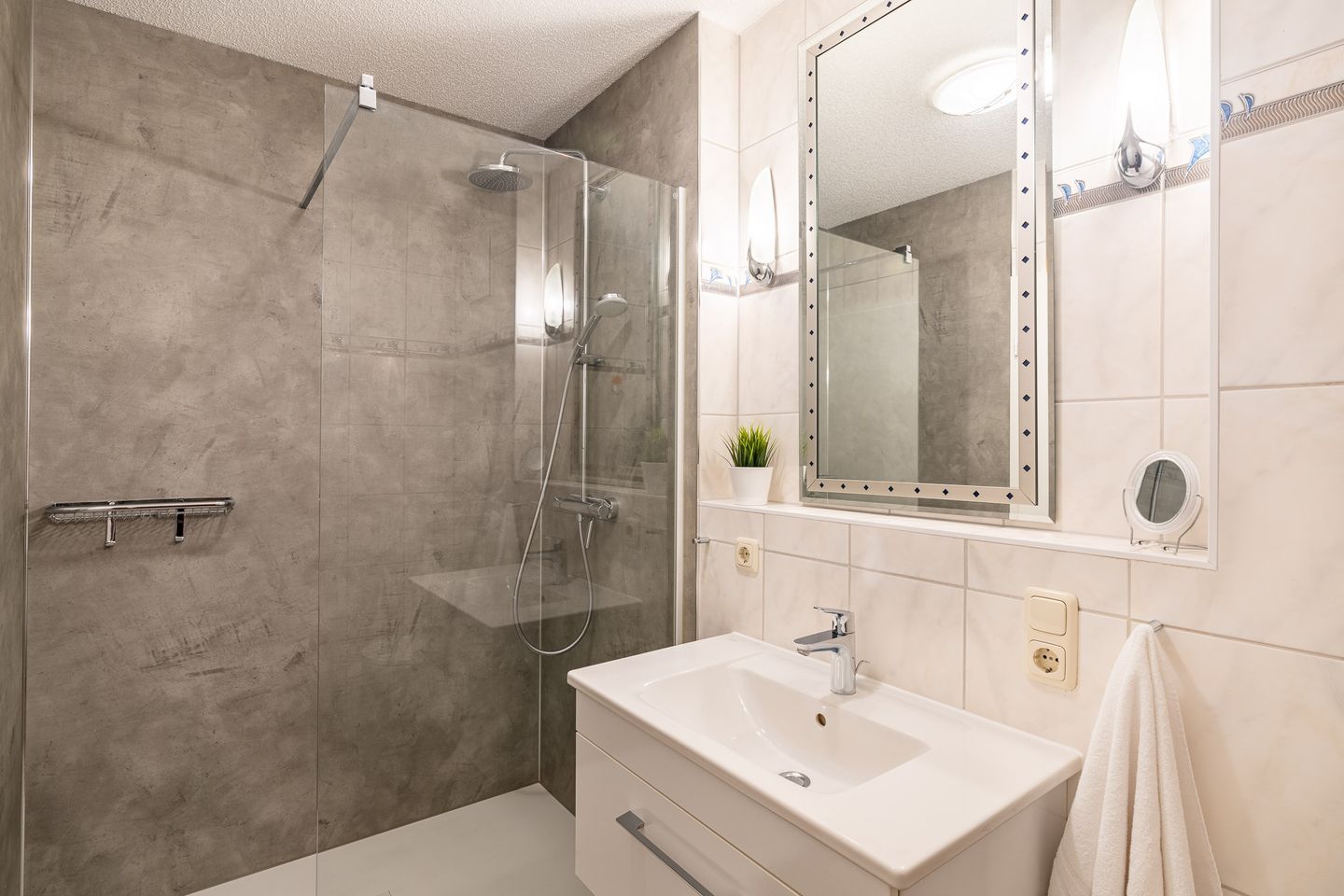 Das moderne Badezimmer ist mit einer Dusche, Fenster und Spiegel ausgestattet und sorgt für einen angenehmen Start in den Tag. Zusätzlich stehen Ihnen im Haus eine Waschmaschine und ein Trockner gegen Gebühr zur Verfügung – ideal für längere Aufenthalte. Ein abschließbarer Fahrradraum ist ebenfalls vorhanden, sodass Sie Ihre Fahrräder sicher abstellen können.