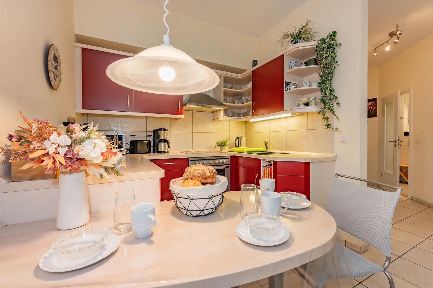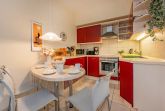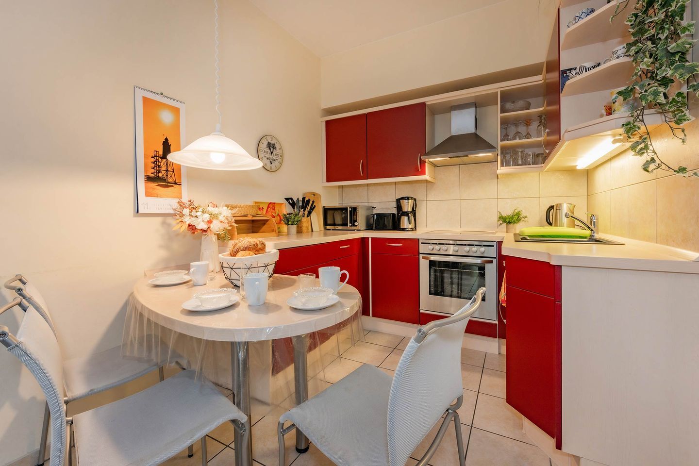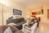 Die Küche ist offen gestaltet und bietet mit Backofen, Ceranfeld, Spülmaschine und Mikrowelle alles, was Sie für die Zubereitung köstlicher Mahlzeiten benötigen. Angrenzend lädt der helle Wohnbereich mit einer gemütlichen Sitzecke und einem Essplatz zum Verweilen ein. Von hier gelangen Sie auf den Balkon mit östlicher Ausrichtung, der sich perfekt für entspannte Stunden in der frischen Seeluft eignet, egal ob beim Frühstück oder bei einem Glas Wein am Abend.