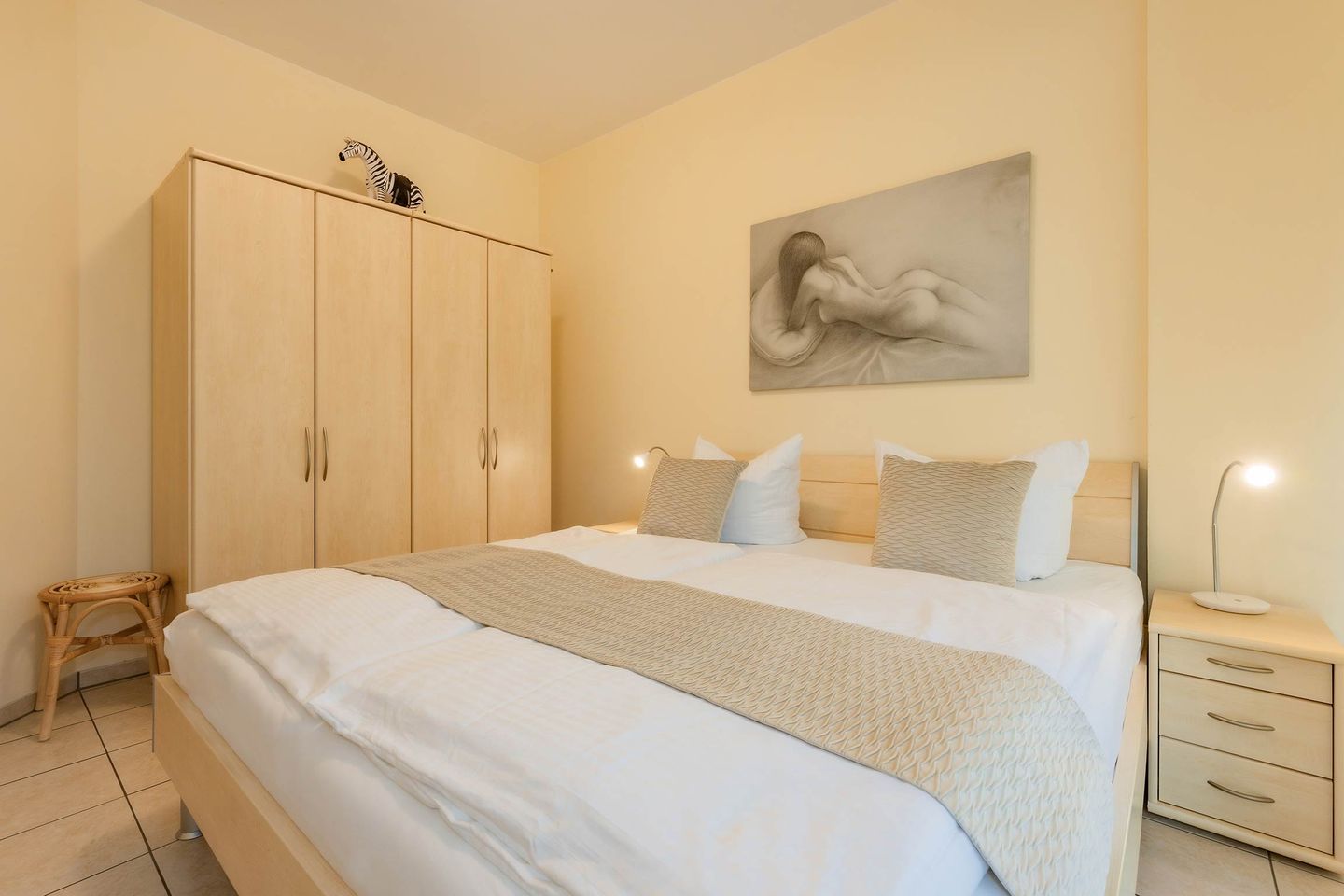 Das Schlafzimmer ist mit einem komfortablen Doppelbett ausgestattet, das erholsamen Schlaf garantiert. Im Wohnbereich sorgt eine Schlafcouch für zusätzliche Übernachtungsmöglichkeiten. Zwei TV-Geräte, eines im Schlafzimmer und eines im Wohnbereich, bieten Unterhaltungsmöglichkeiten für jeden Geschmack.