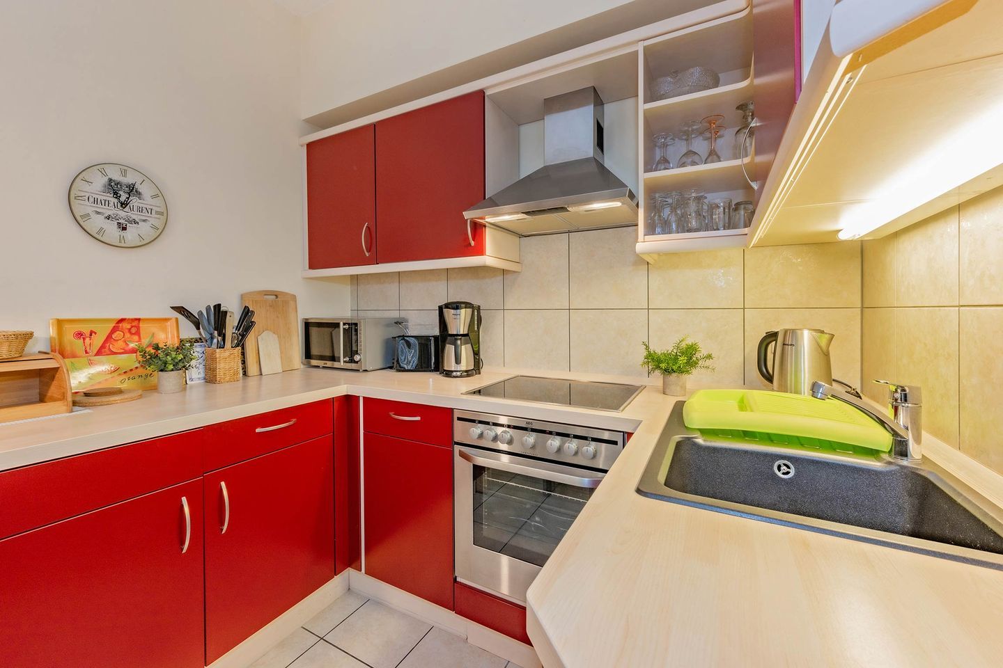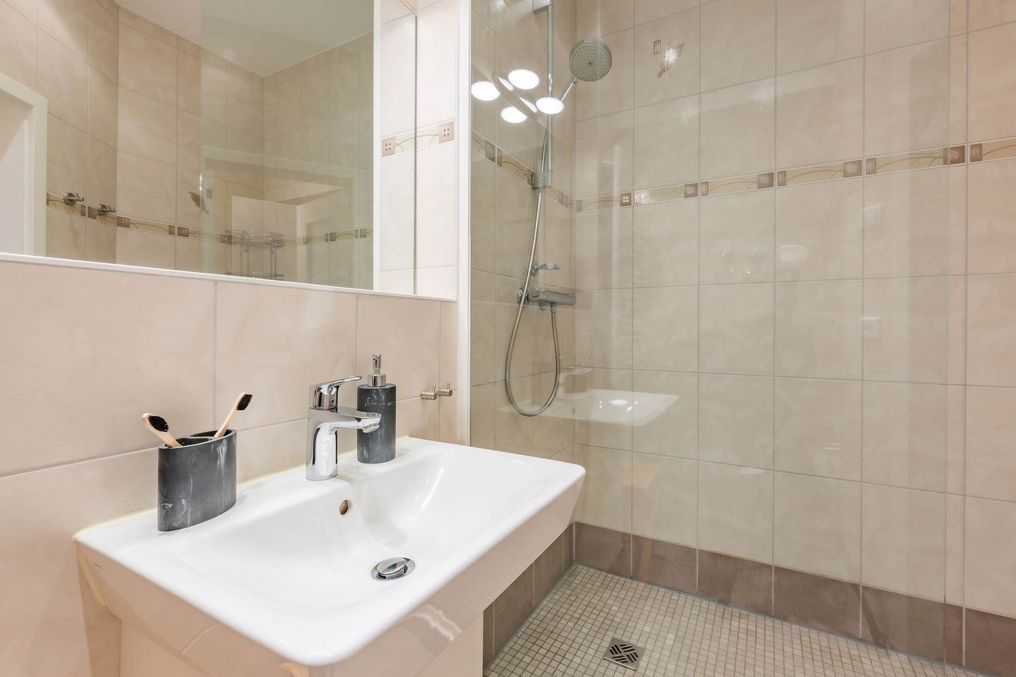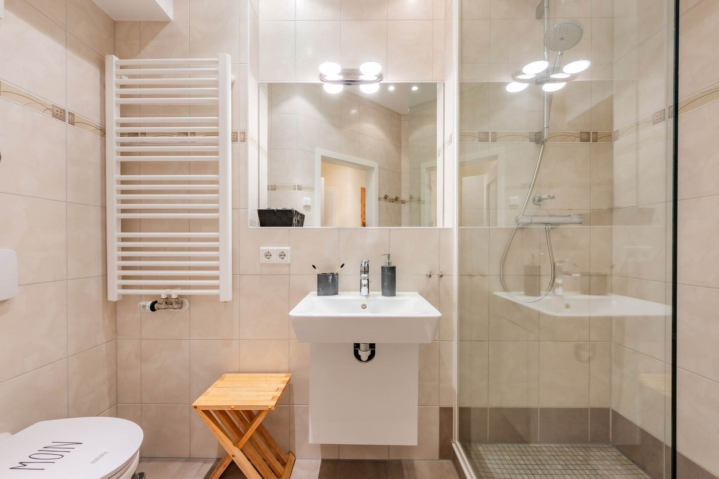 Das moderne Badezimmer ist mit einer Dusche, einem WC und einem großen Spiegel ausgestattet. Für Familien mit kleinen Kindern stehen ein Kinderreisebett und ein Kinderhochstuhl bereit, sodass auch die Kleinsten gut versorgt sind. Fliegengitter und Verdunklung an den Fenstern sind vorhanden. Eine Waschmaschine und ein Trockner stehen im Haus gegen Gebühr zur Verfügung - praktisch für längere Aufenthalte.