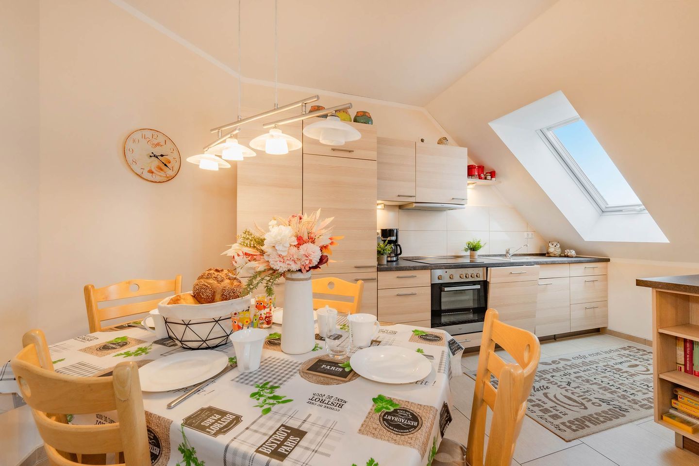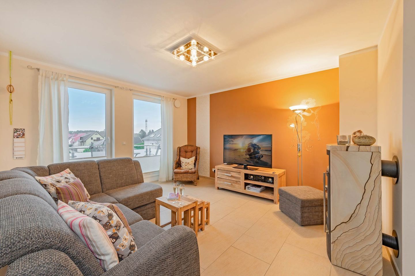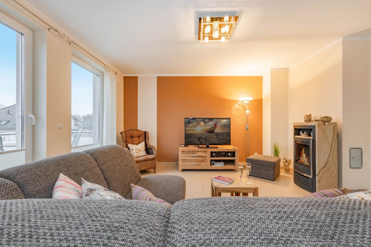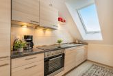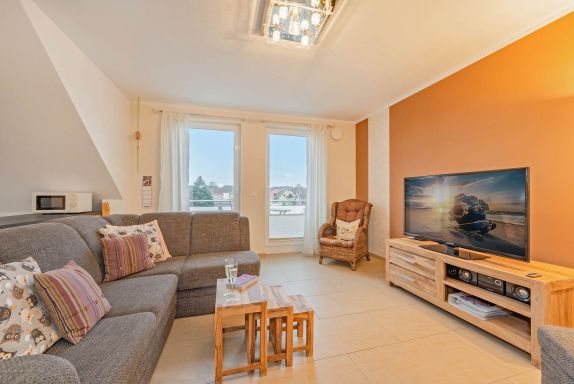 Der offene Wohn- und Kochbereich ist der Mittelpunkt der Wohnung. Die voll ausgestattete Küche mit Backofen, Ceranfeld, Spülmaschine und Mikrowelle bietet alles, um im Urlaub wie zu Hause kochen zu können. Der angrenzende Wohnbereich mit einem einladenden Sofa, einem Essbereich und dem behaglichen Kamin schafft eine Wohlfühlatmosphäre, die nach einem Tag am Strand oder in der Natur pure Entspannung ermöglicht.