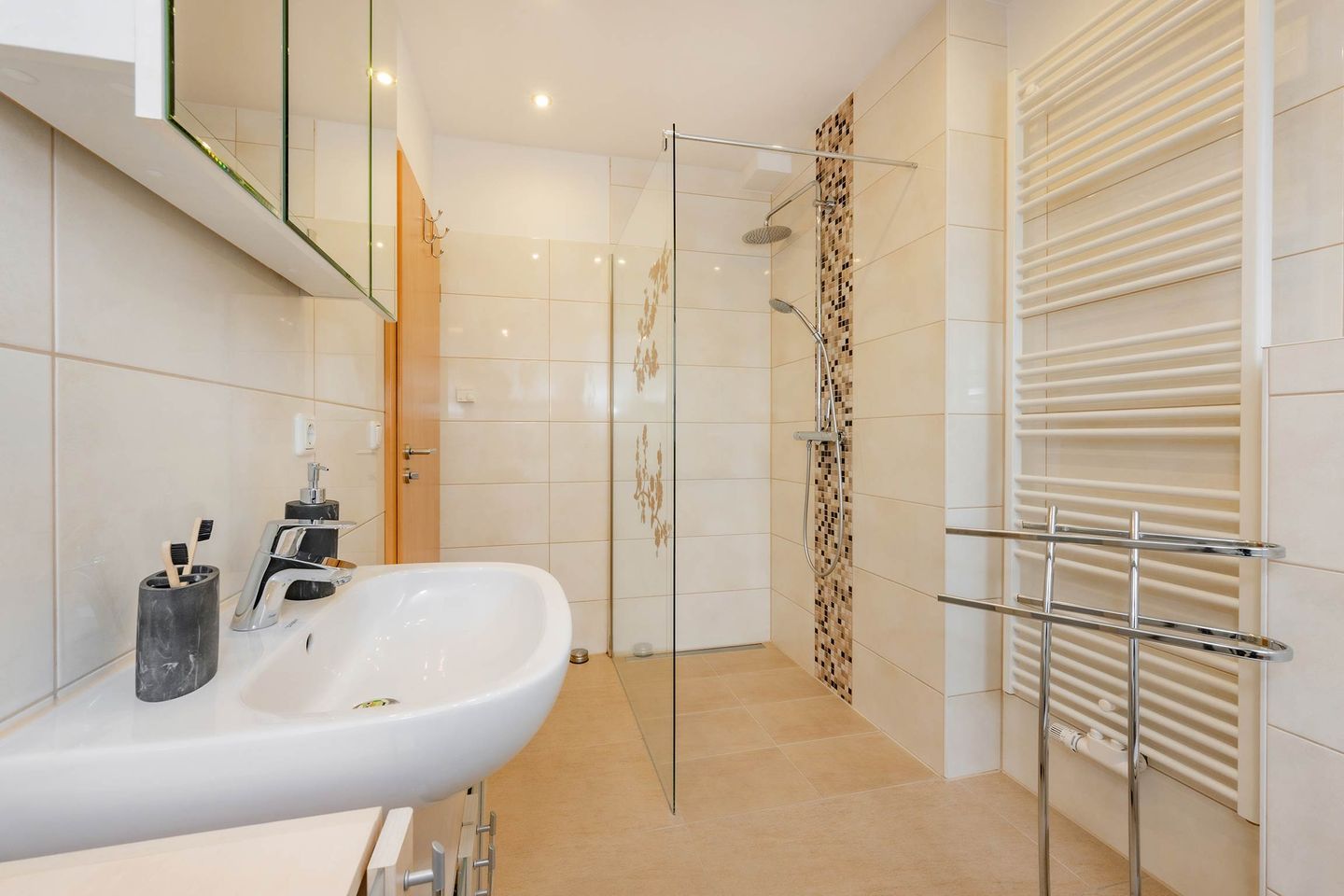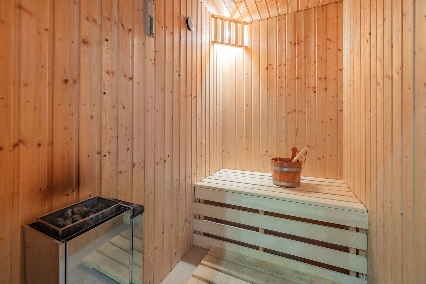Das moderne Badezimmer verfügt über eine ebenerdige Dusche, ein Fenster für Tageslicht und einen großen Spiegel. Zudem ist die Wohnung mit einer Waschmaschine ausgestattet, was gerade bei längeren Aufenthalten praktisch ist. Für Ihre ganz persönliche Wellness-Zeit sorgt die eigene Sauna, die Ihrem Urlaub einen Hauch von Luxus verleiht.