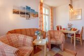 Neben einem Schlafraum mit Doppelbett (1,80 x 2,00m), einem Tageslichtbad mit Dusche, WC, Fön und Handtuchheizung und einen Balkon mit Blick ins Grüne, gibt es einen großzügig geschnittenen Wohnraum mit Schlafcouch als Zusatzbett sowie eine offene Küche. Diese ist mit Kühlschrank inkl. Gefrierfach, Mikrowelle, Ceranherd mit Backofen, Geschirrspüler, Kaffeemaschine, Wasserkocher und Toaster rundum ausgestattet.