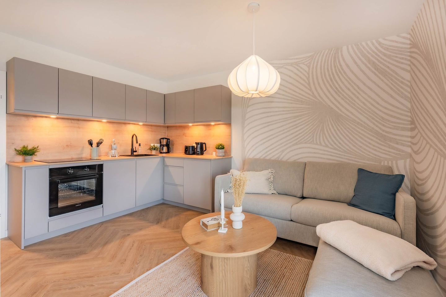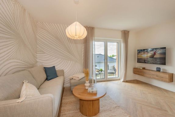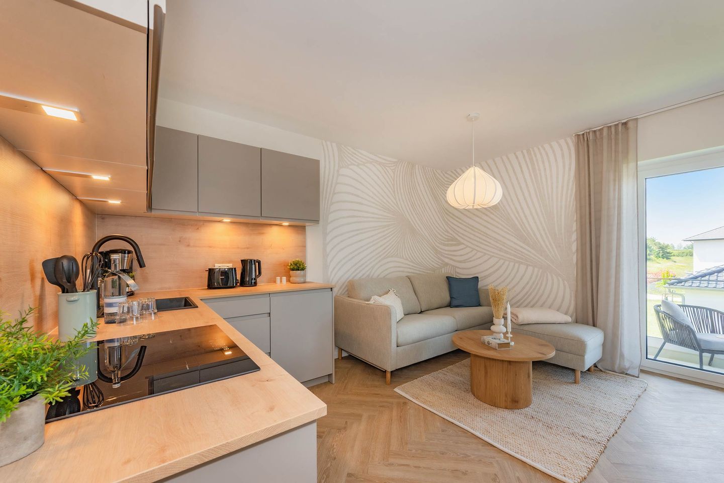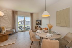 Die 48 Quadratmeter große Ferienwohnung überzeugt durch ein durchdachtes Raumkonzept und eine hochwertige Ausstattung. Der offen gestaltete Wohnbereich ist mit einer modernen Küche inklusive Backofen, Induktionskochfeld, Geschirrspüler und Kühlschrank ausgestattet und bietet alles, was man für die Zubereitung kleiner und großer Mahlzeiten benötigt. Ein stilvoller Essbereich lädt zum gemeinsamen Frühstück oder zu gemütlichen Abenden ein. Der Wohnbereich punktet mit geschmackvollen Möbeln, liebevoller Dekoration und einem Flachbild-TV, der über eigene Streaming-Accounts für Amazon Prime und Netflix genutzt werden kann. Große Fenster lassen viel Licht herein und schaffen eine freundliche Atmosphäre, die durch den sonnigen Südwestbalkon mit gemütlicher Bestuhlung perfekt ergänzt wird.